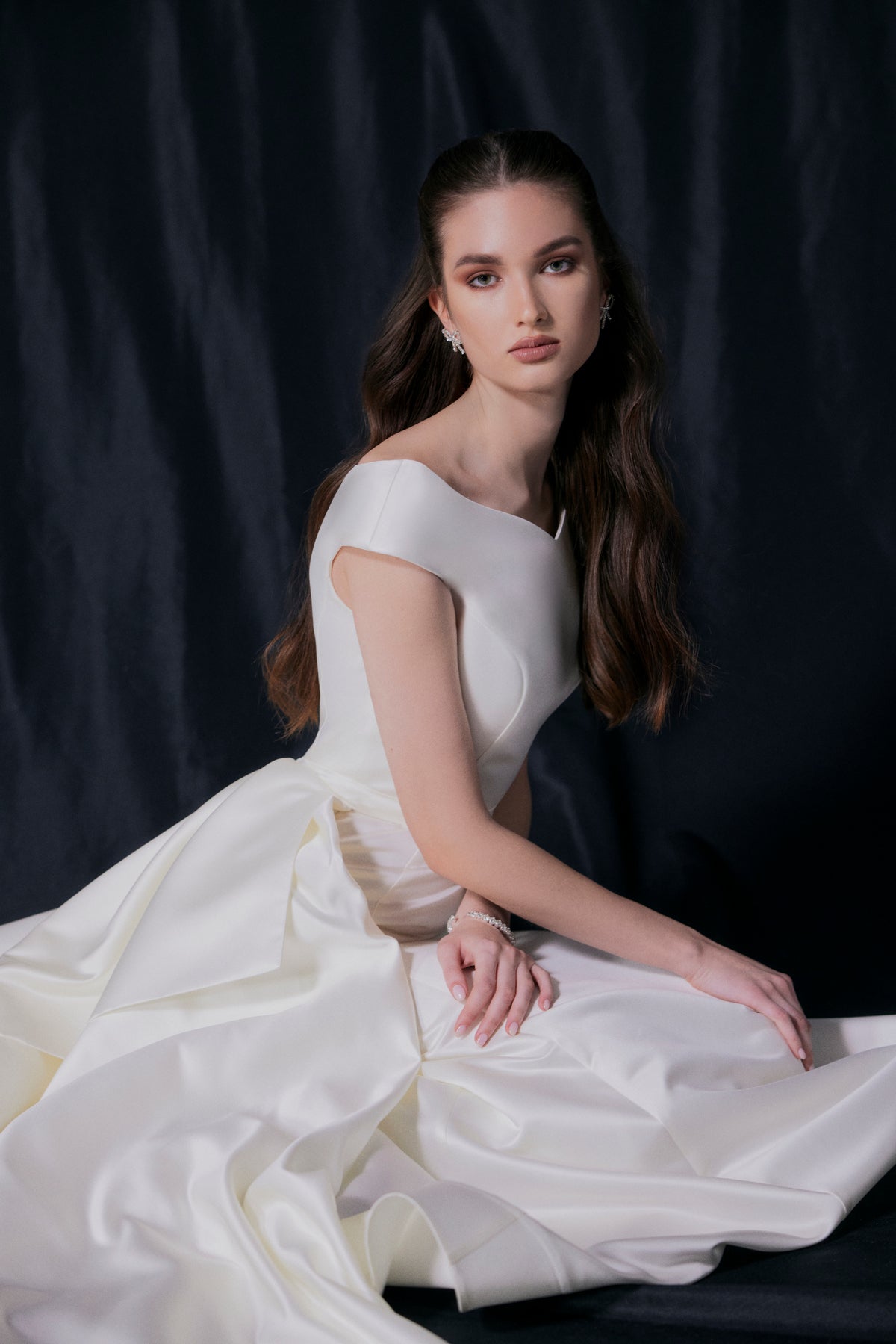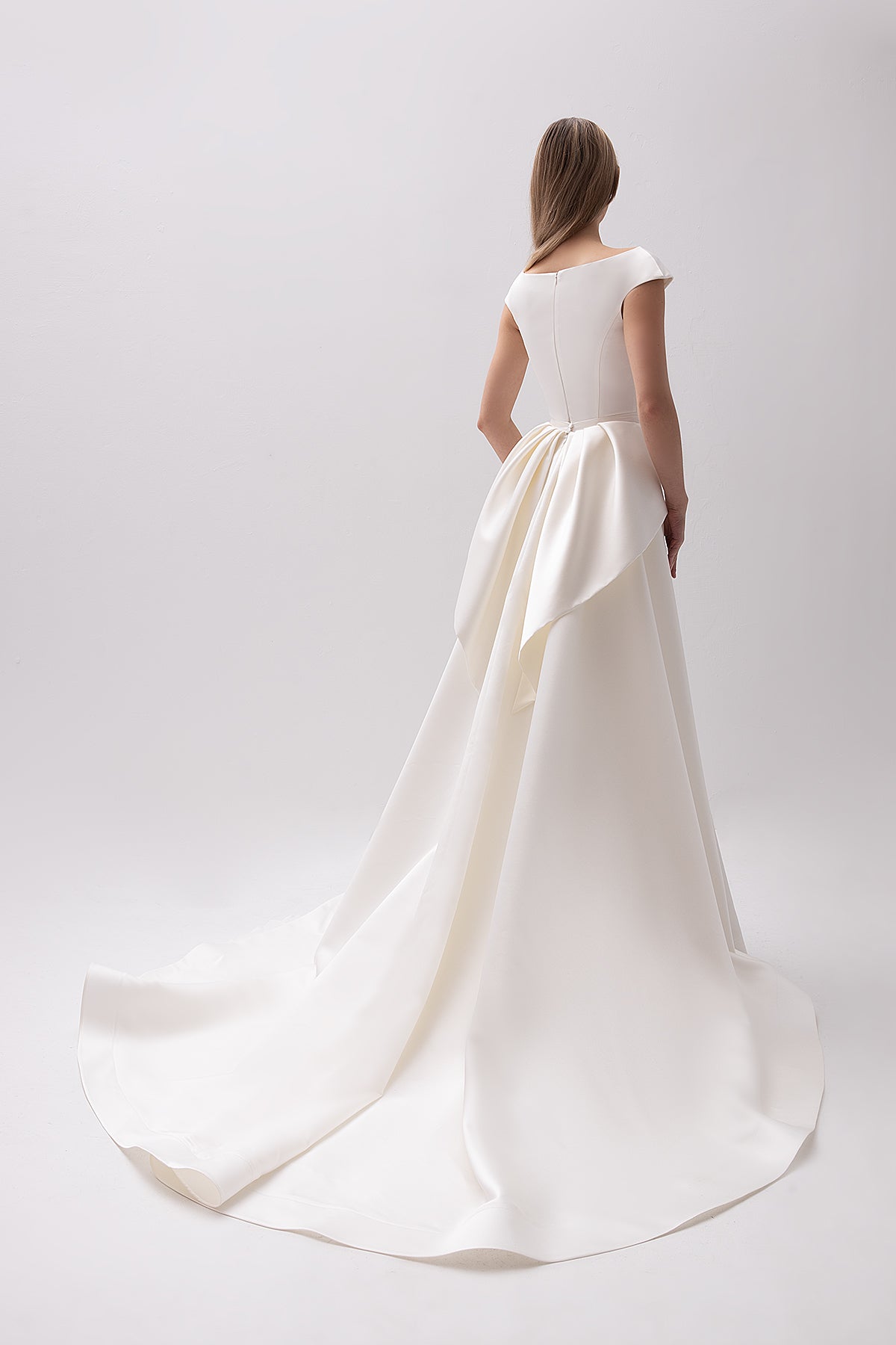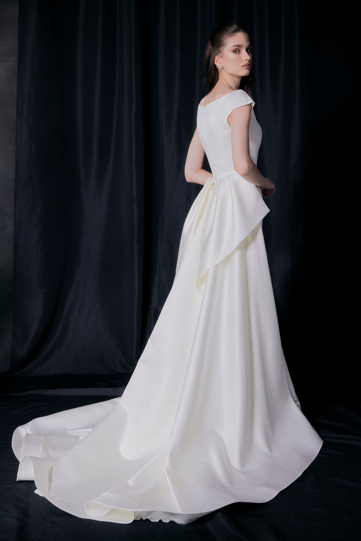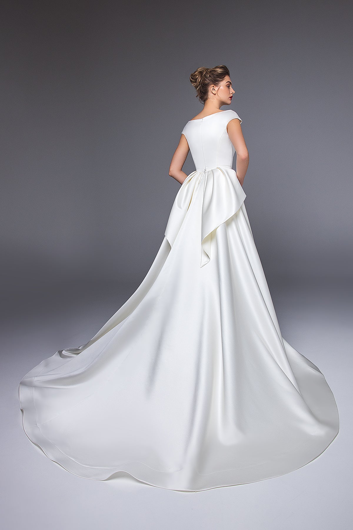 A simple and chic satin dress with a boat neckline and flirty shoulders, teasingly revealing your neck and collar bones. The mermaid skirt with vertical seams visually elongates your figure and emphasizes your feminine curves. The dress comes with a detachable A-line satin skirt with, featuring a stunning bow detail.