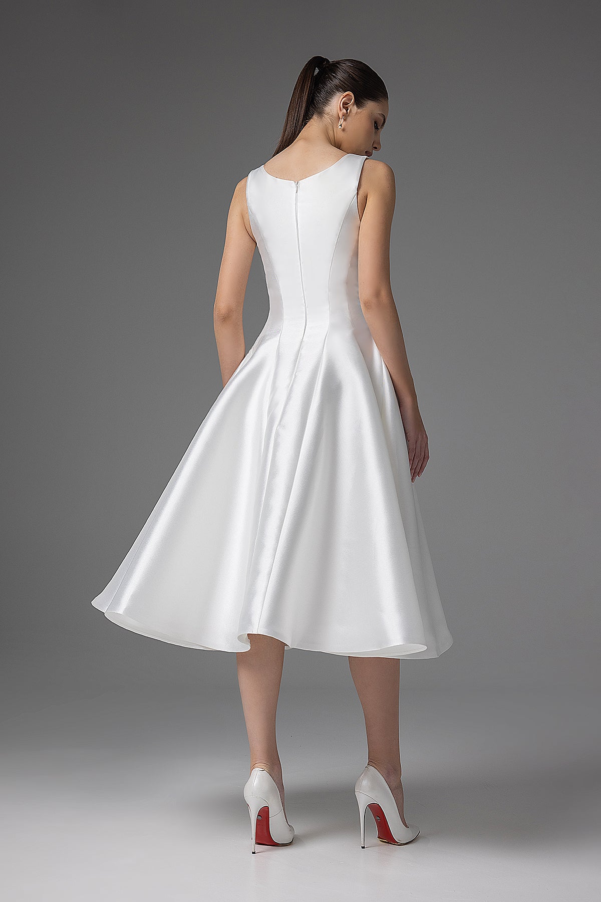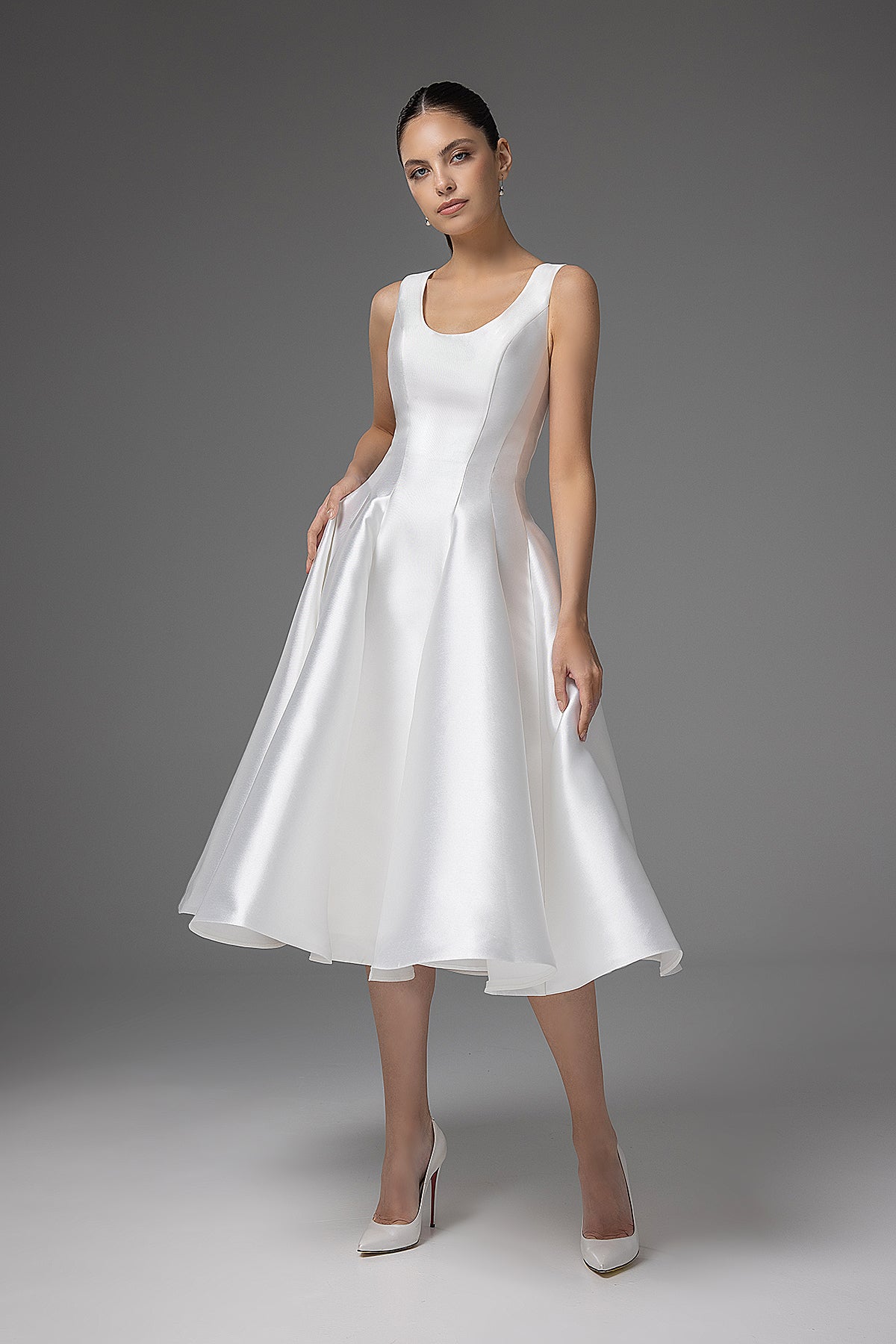 Simple midi-length wedding dress with a deep scoop neckline and princess seam detail on the bodice. The full A-line made from mikado skirt expands to the bottom, creating a classy look for the modern bride.
