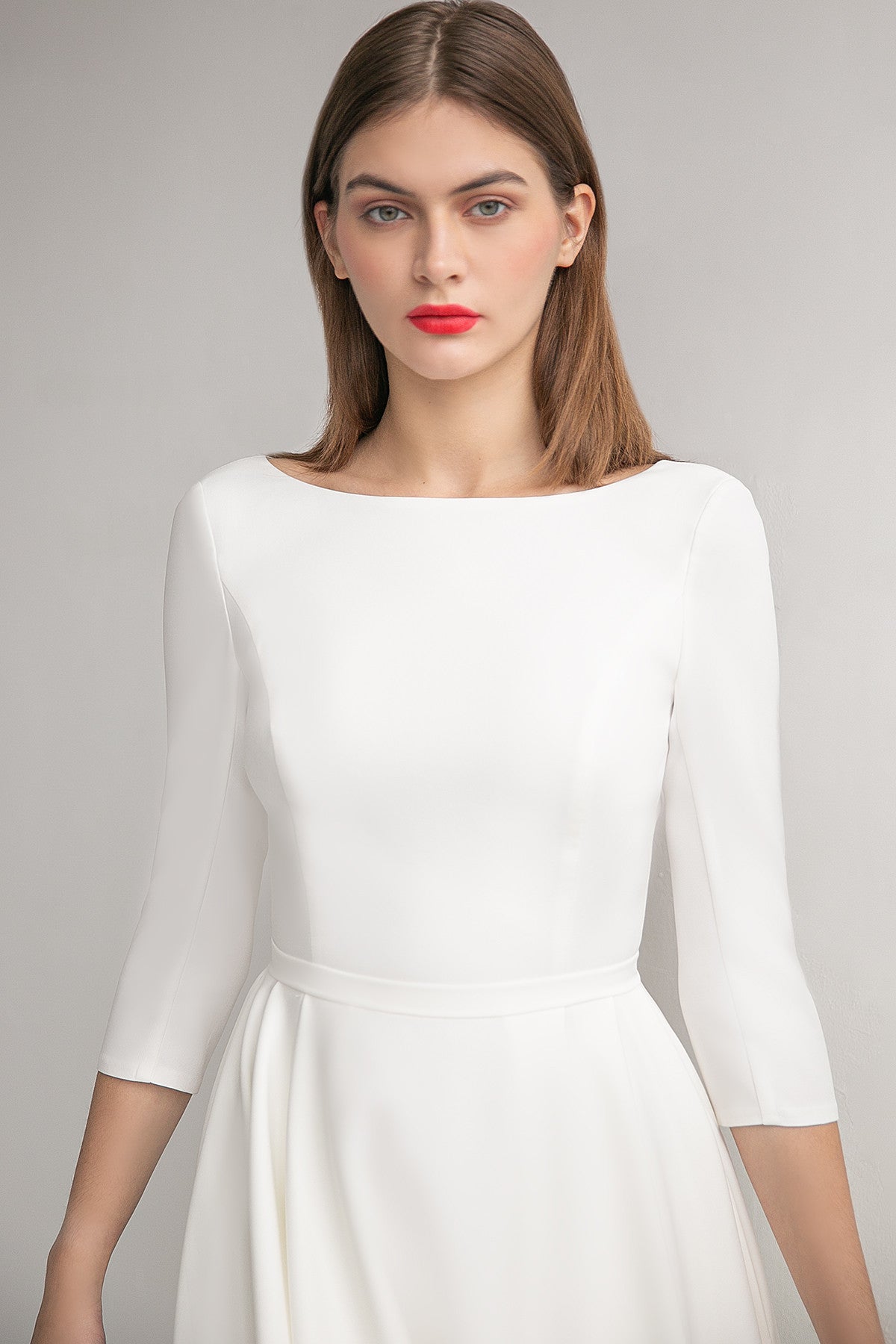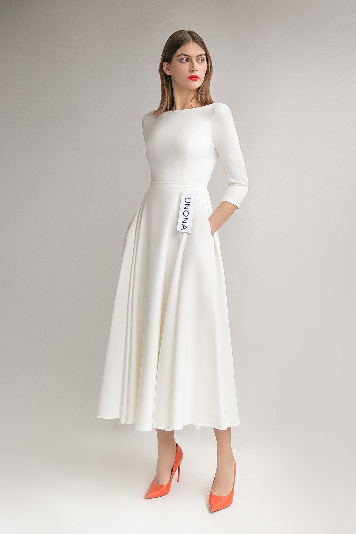 A simple, mid-length crepe dress with a full skirt and pockets. It has a boat-neck, an open back and 3/4 sleeves so it's perfect for summer.