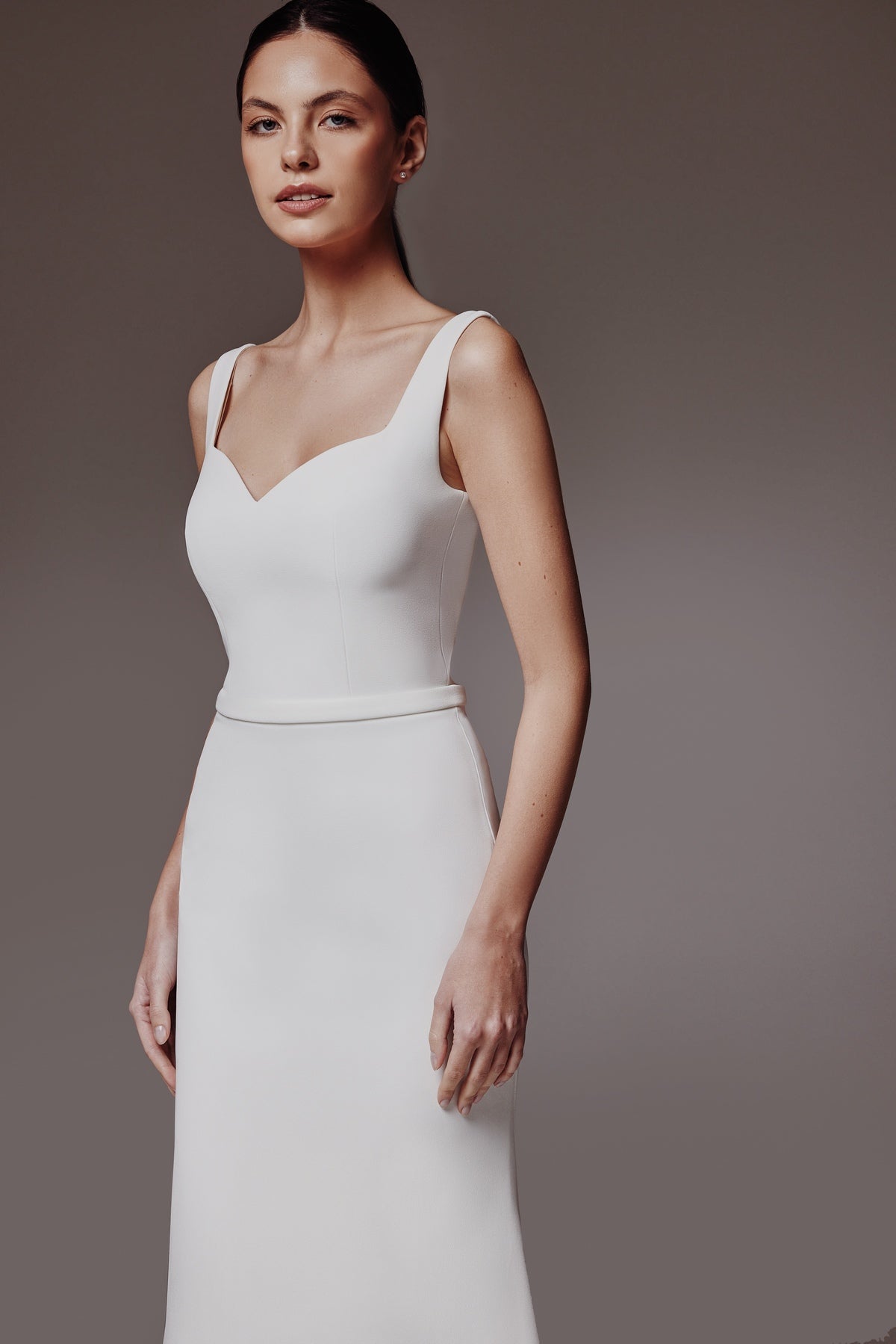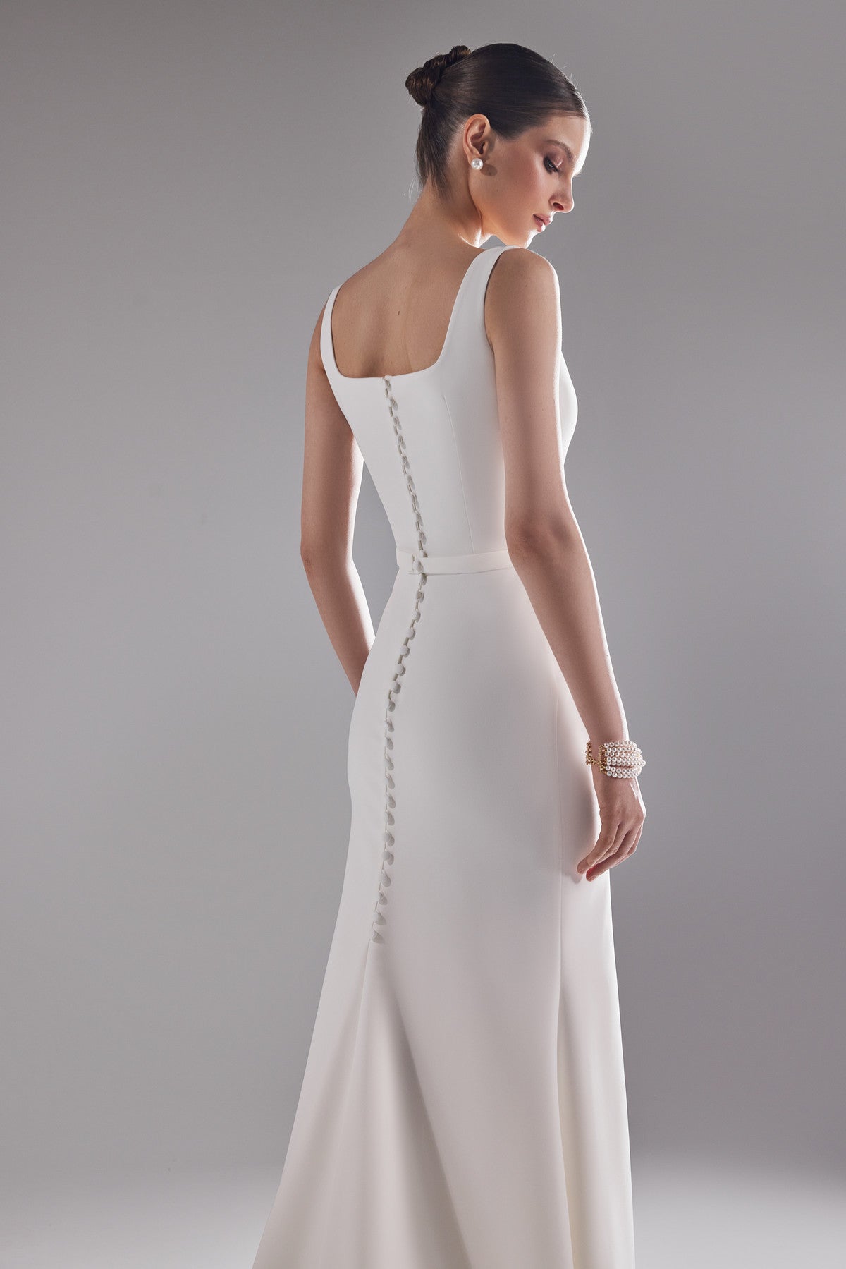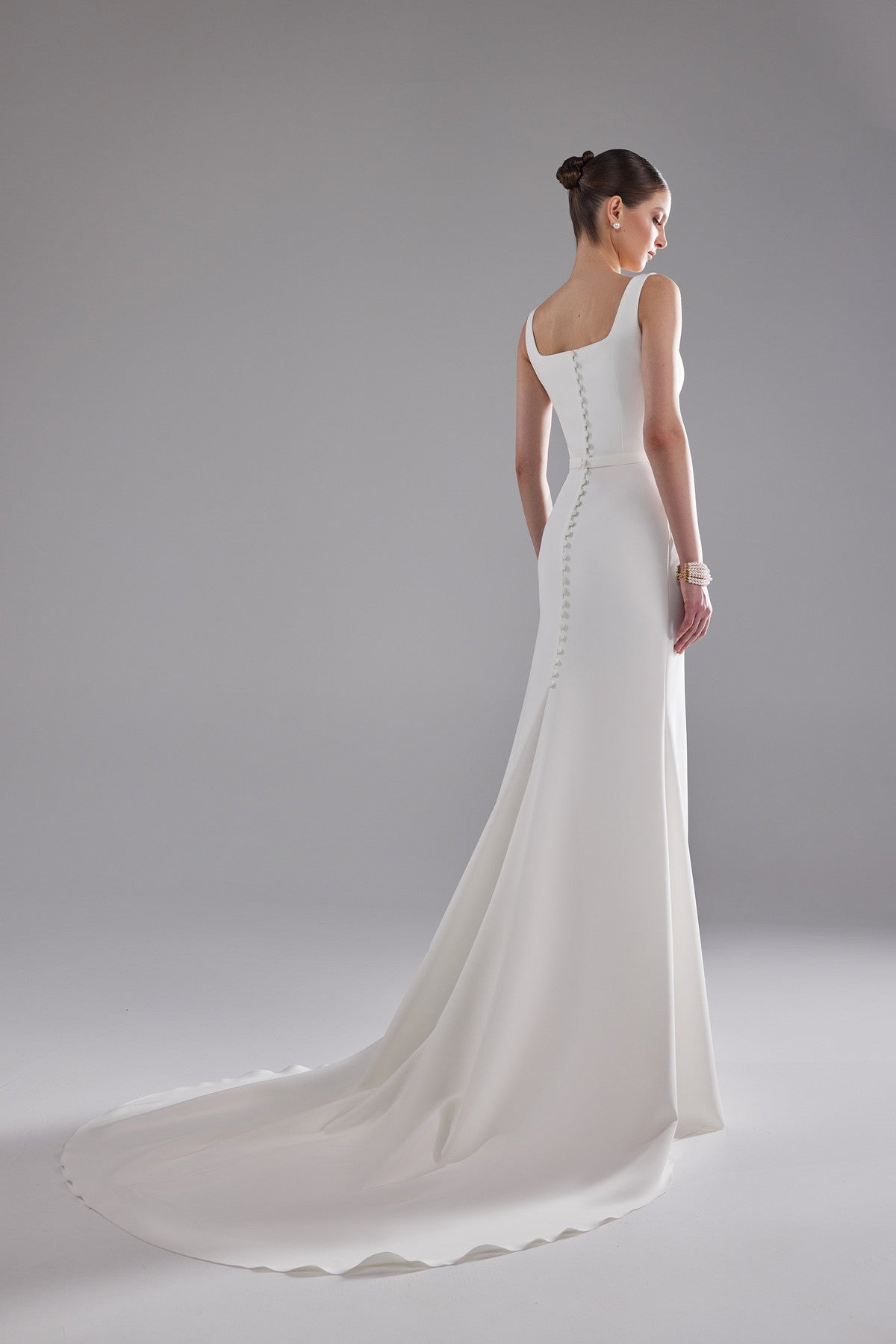 A modern wedding dress with a sweetheart neck and square back, adorned with a row of cute buttons. A sleeveless, long wedding gown with a flattering skirt and chapel train for a classic look.