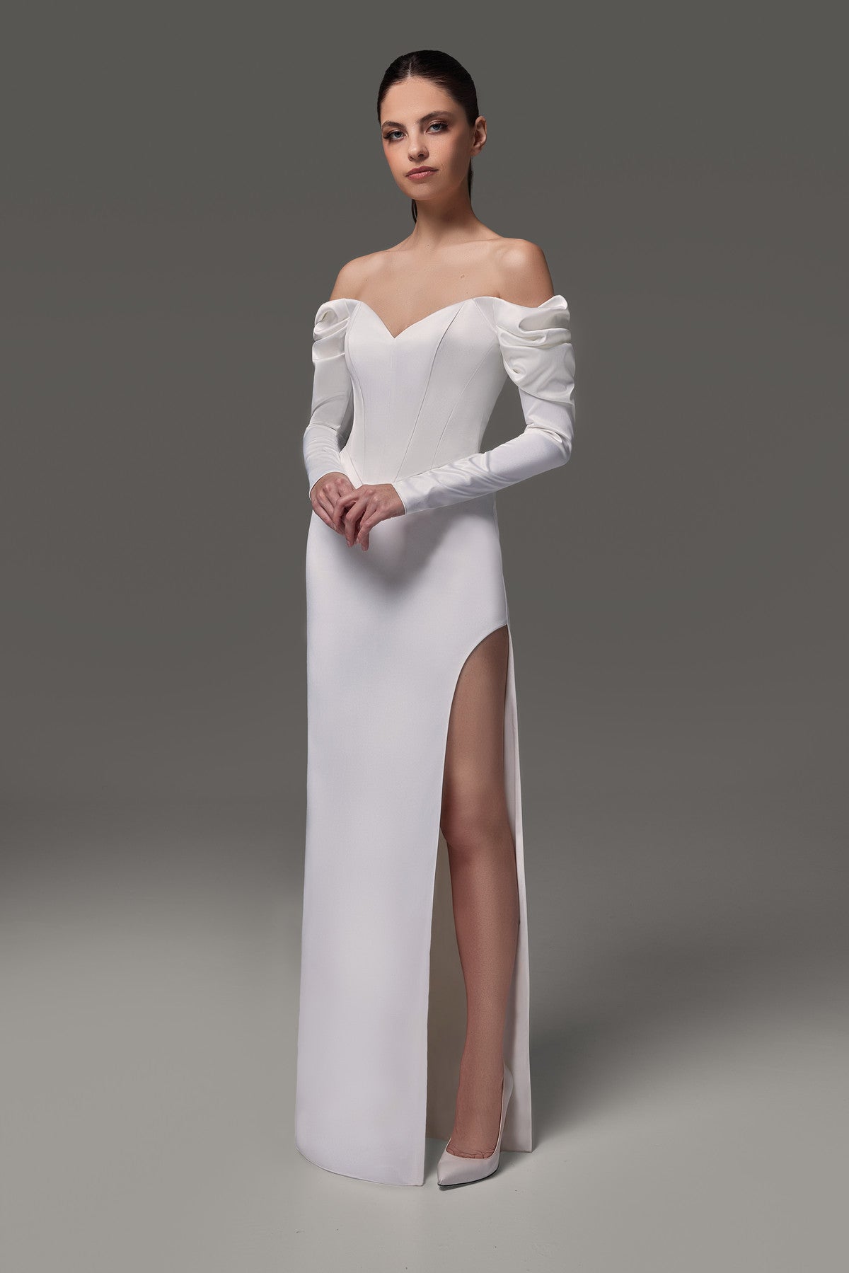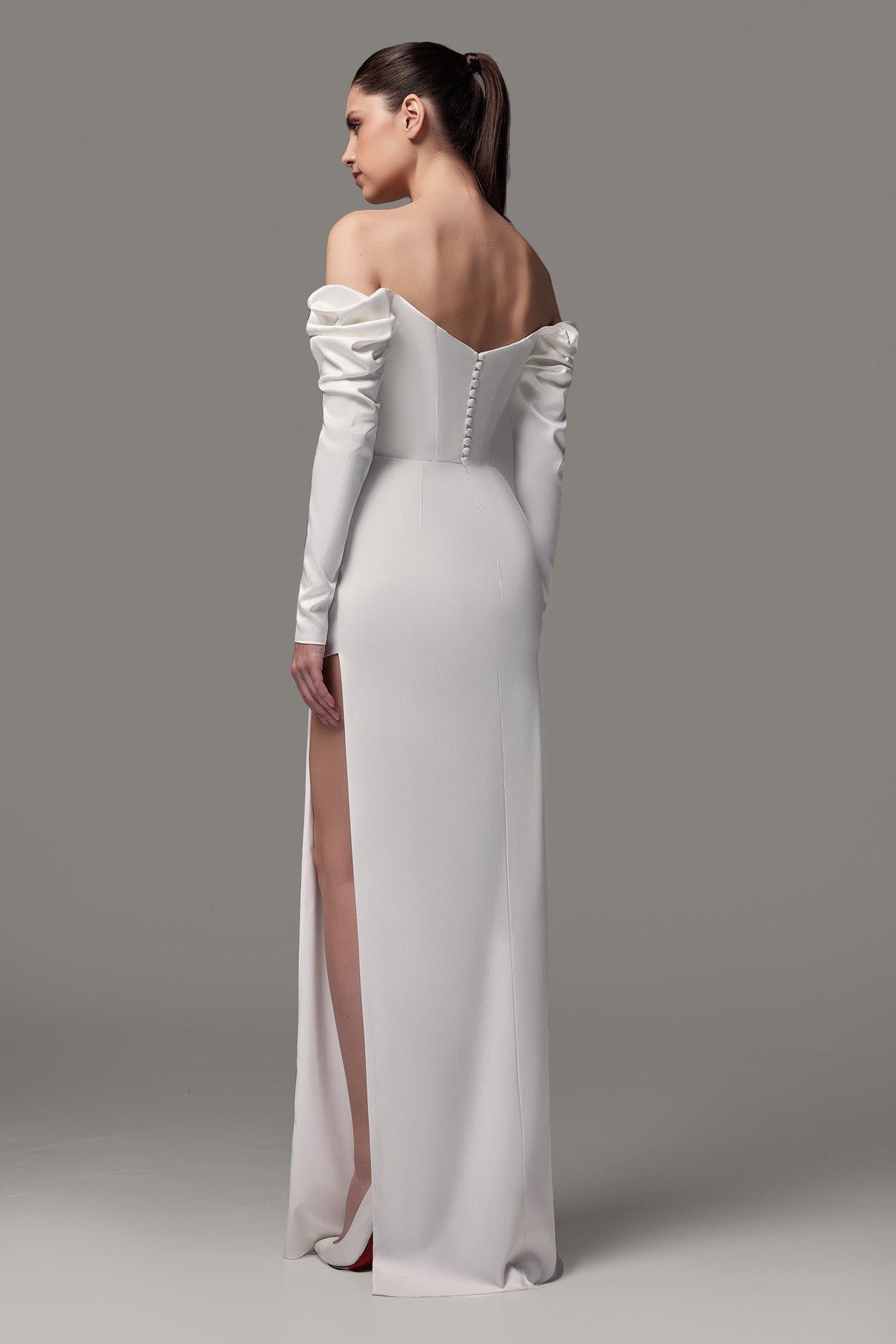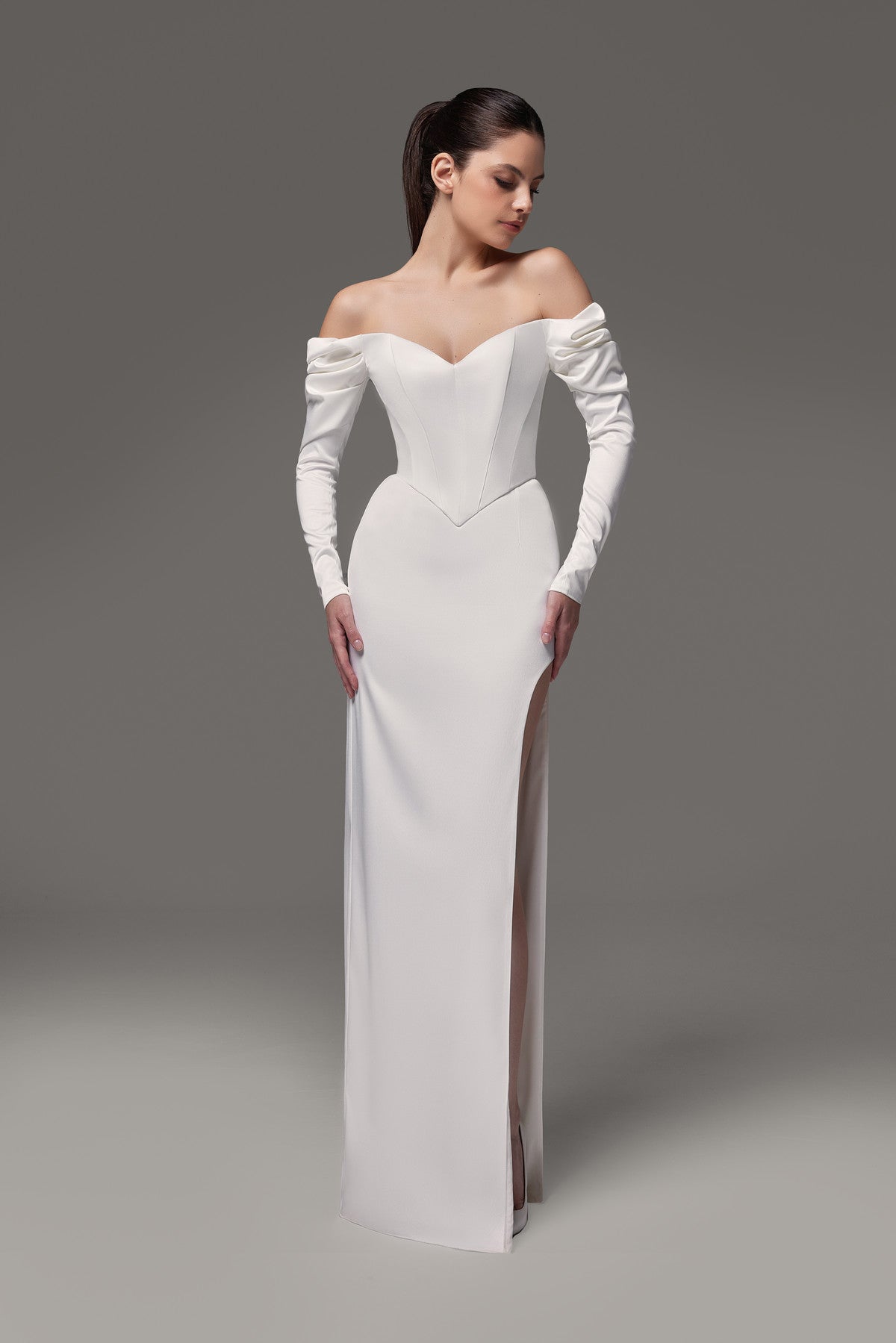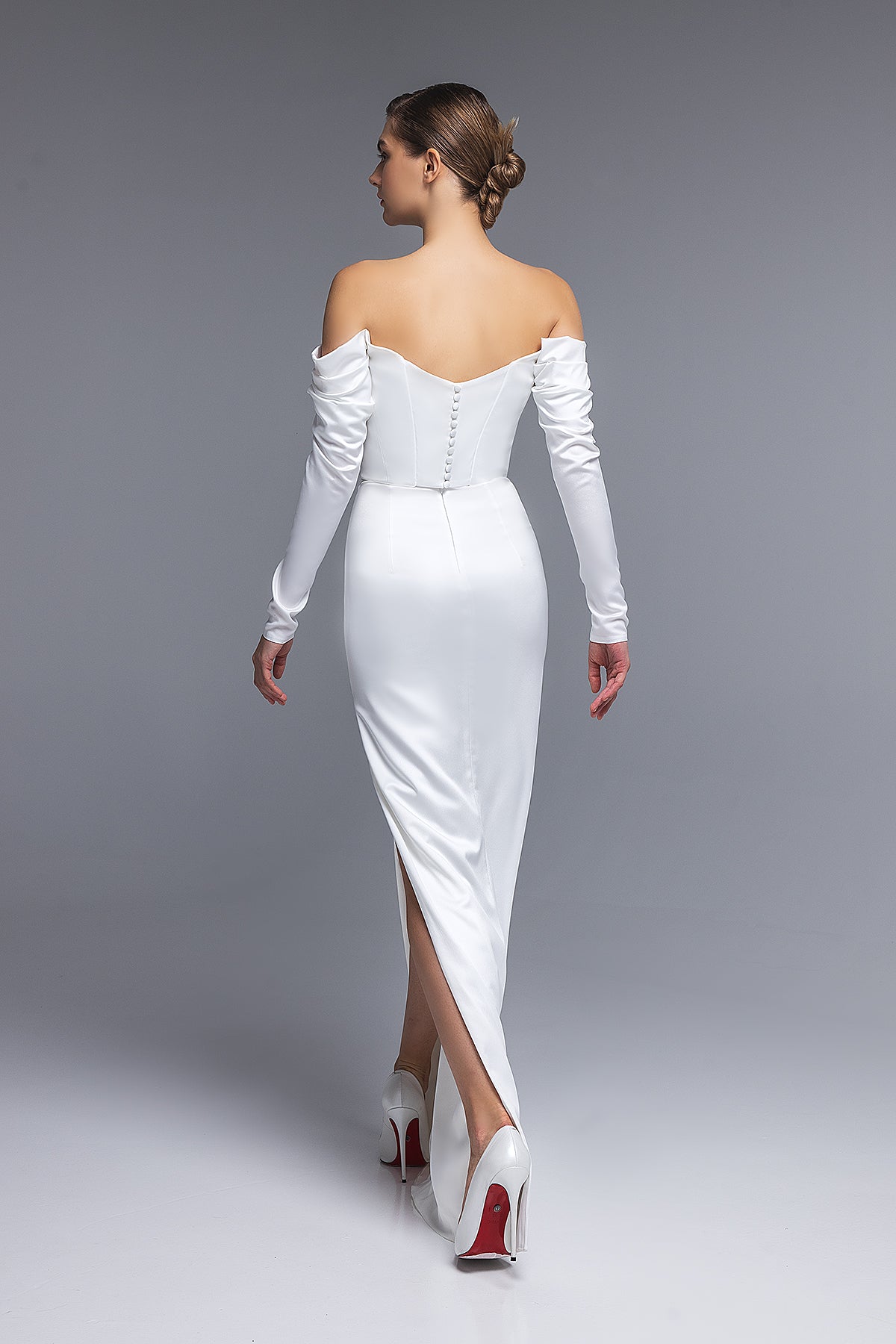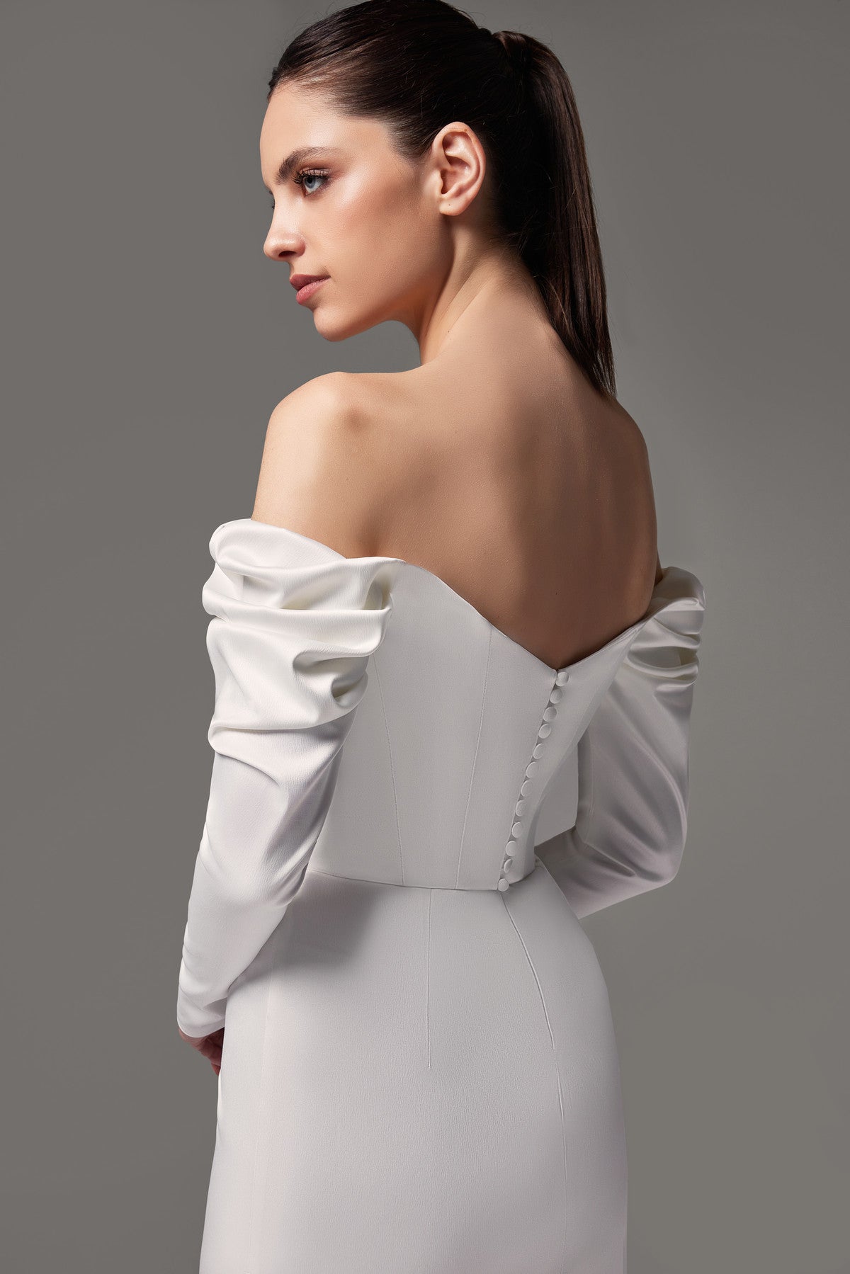 This modern set is so chic and stylish! It's made of stretch satin and has a corset top and a skirt. The corset has an embossed design and is elongated in the front. Lacing is hidden behind a placket with buttons at the back. The neckline is heart-shaped with flowing sleeves that drape at the top to show off your neck and shoulders. A pencil skirt with a high slit is a perfect choice for modern brides seeking style.
