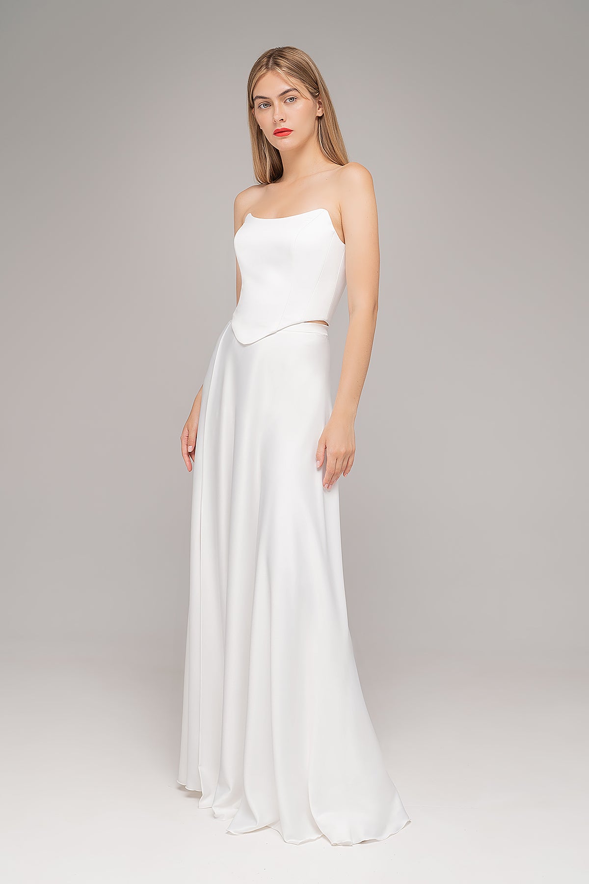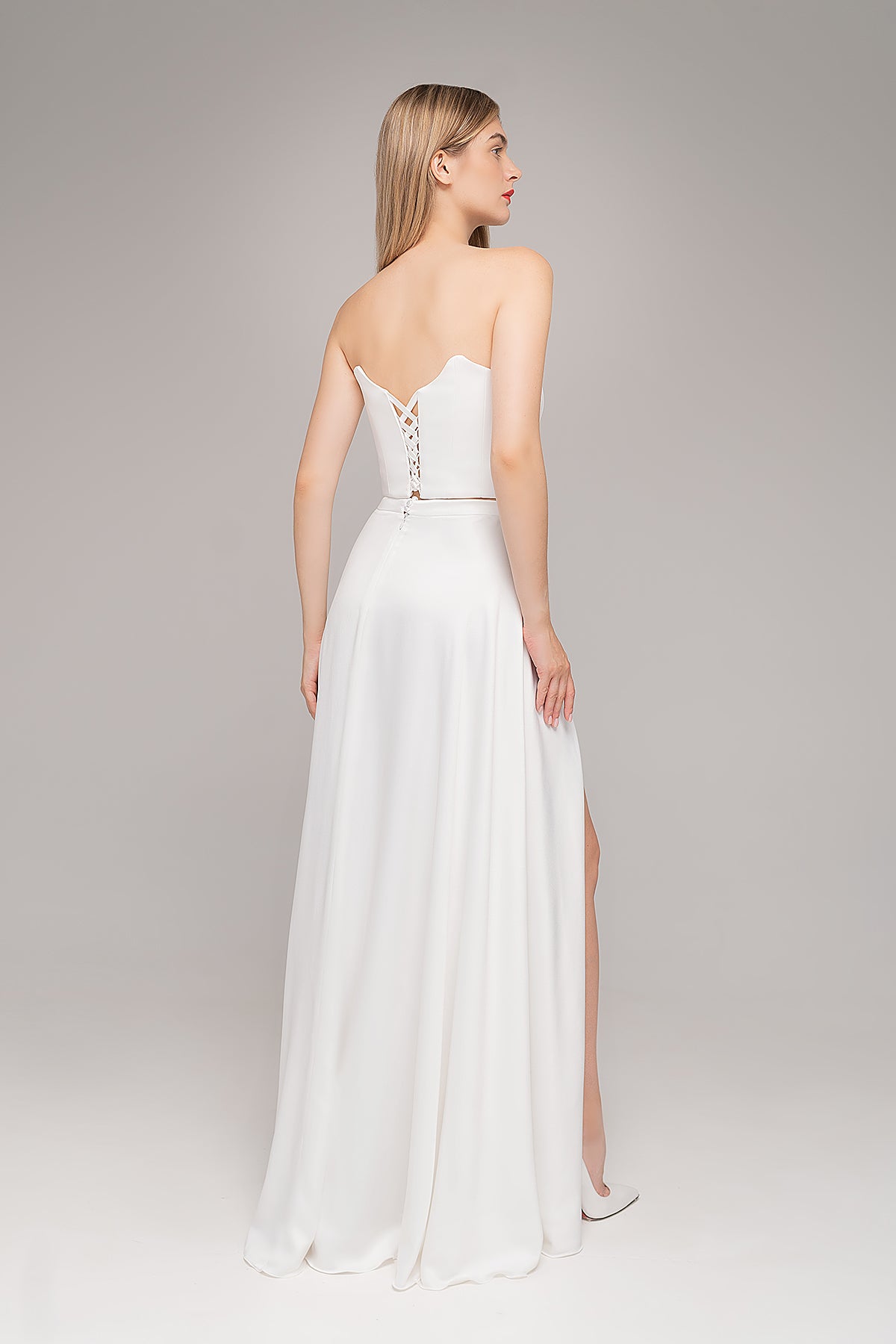 The set consists of a silk-wrap style skirt with high slit and a satin corset top covered with silk and laced on the back.