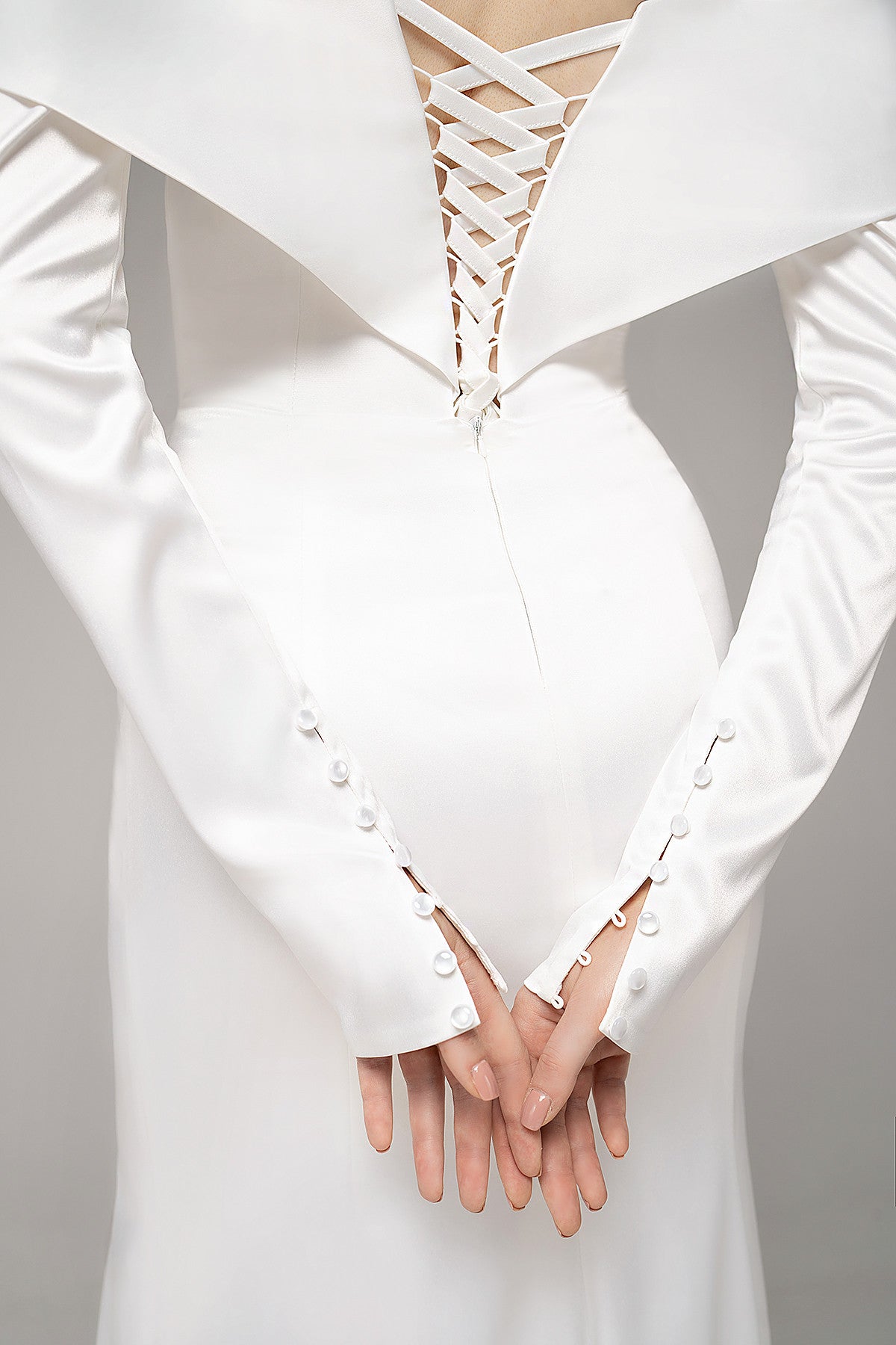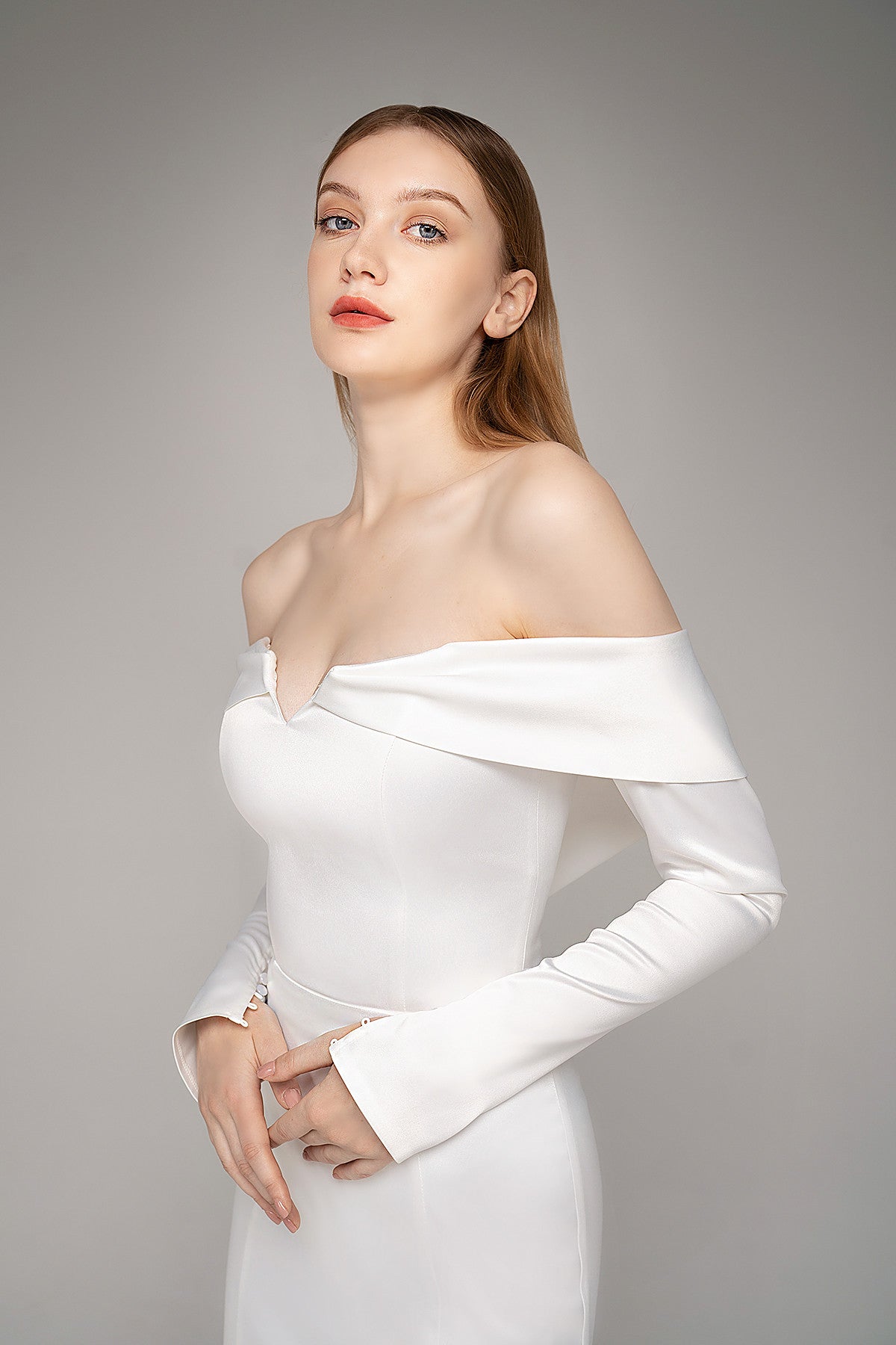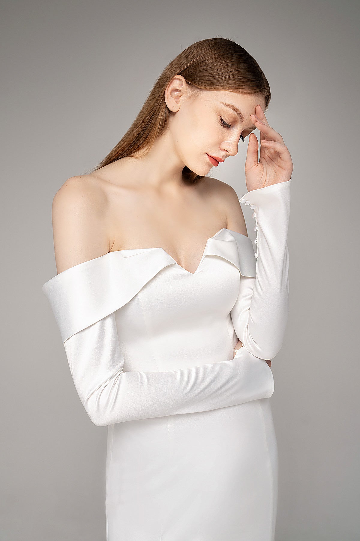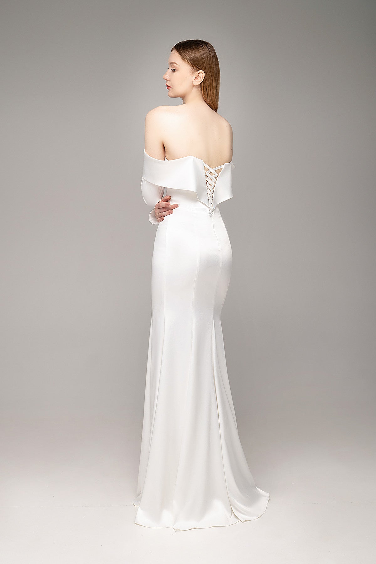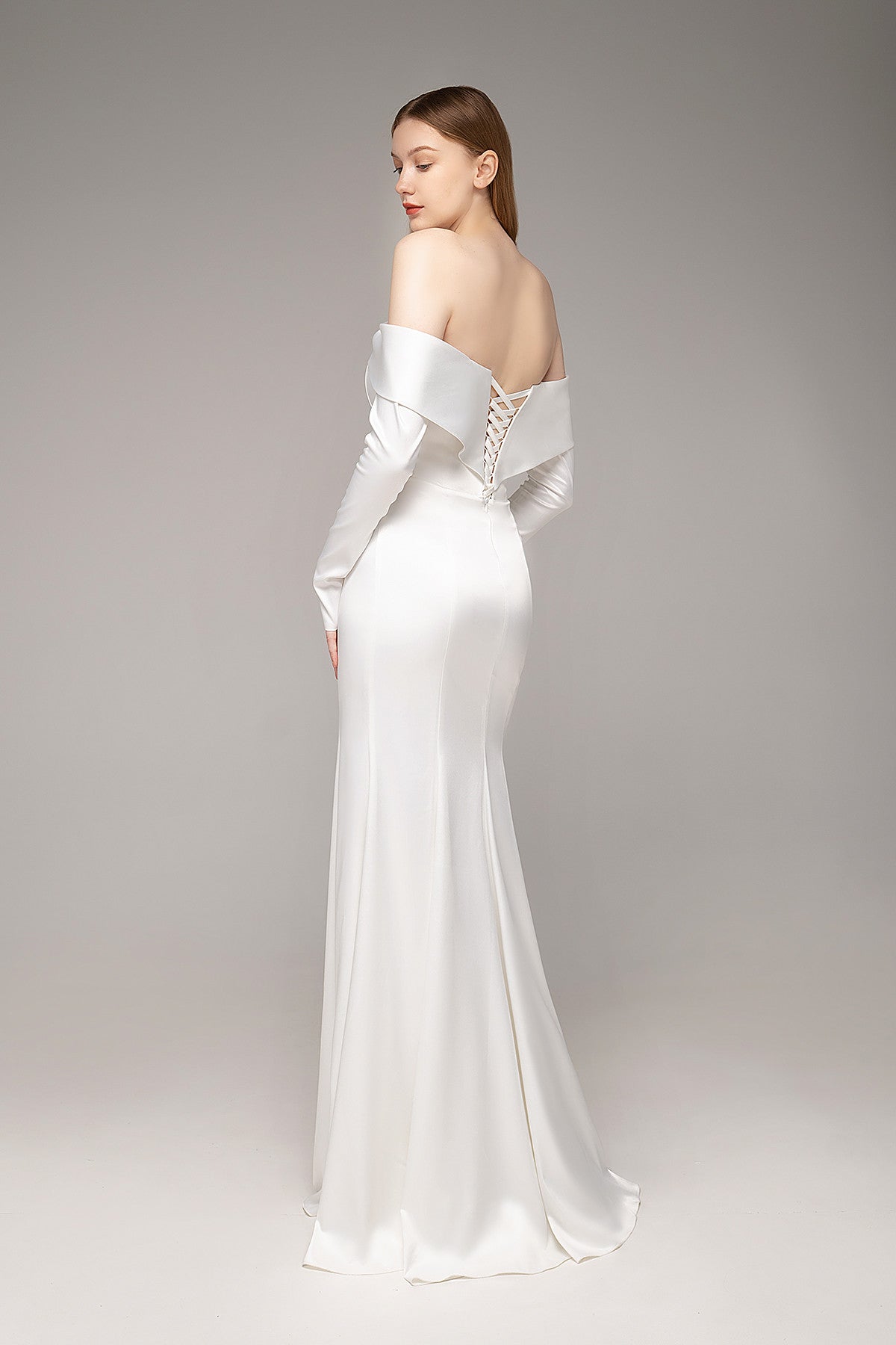 Whether you're just looking for a reception dress or you want to look romantically, this dress is for you! It's a long fit & flare dress made from stretchy satin with off-the-shoulder neckline and removable sleeves. The sleeves flare out and have split cuffs, and there's even a side slit that adds some drama to the look.