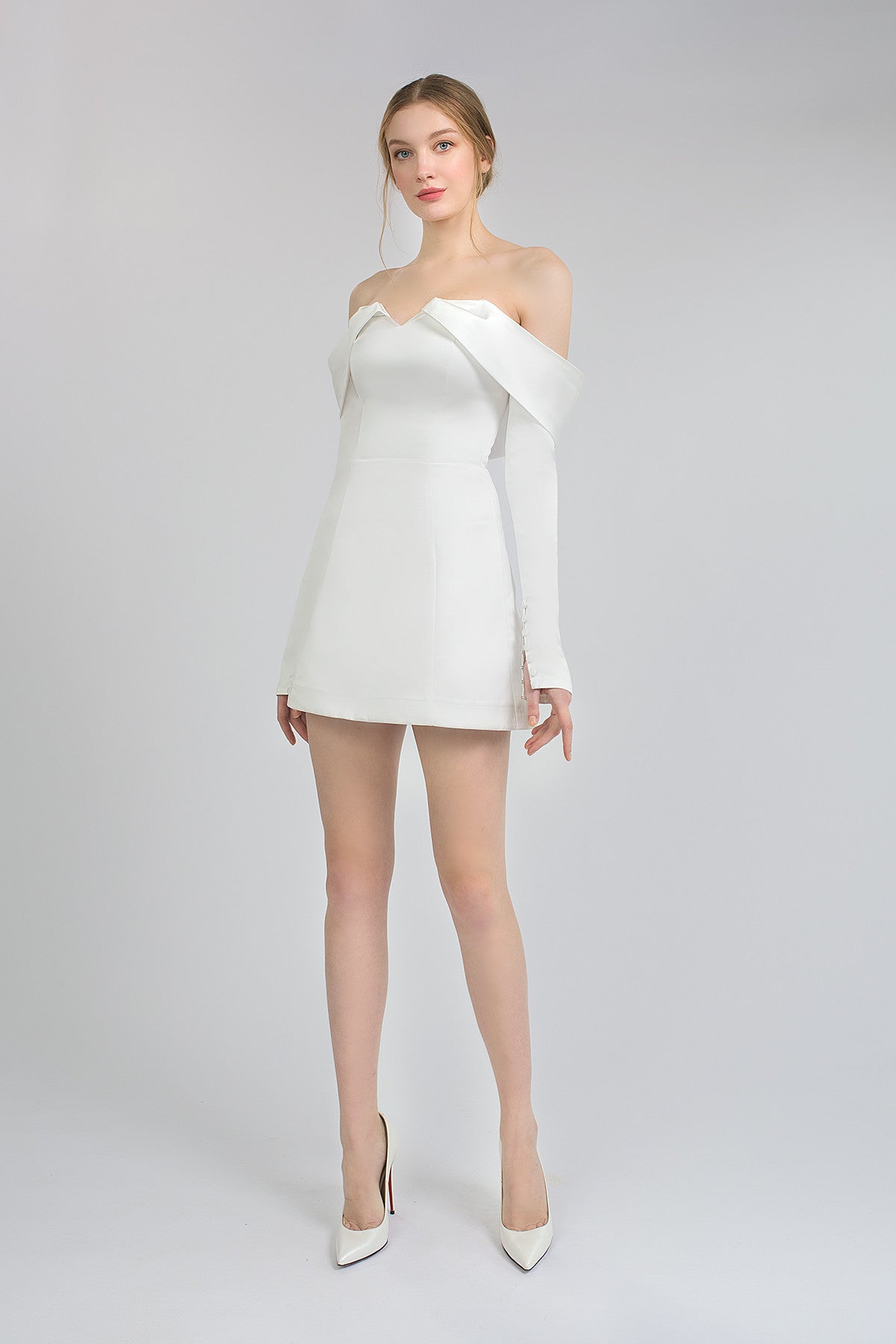 Whether you're looking for a fun night out or want to feel like a real princess, this dress is perfect for you! It's a short, stretchy satin cocktail dress with a sexy off-the-shoulder neckline that will make you feel like a star. The sleeves of the garment are removable and flare out with split cuffs.