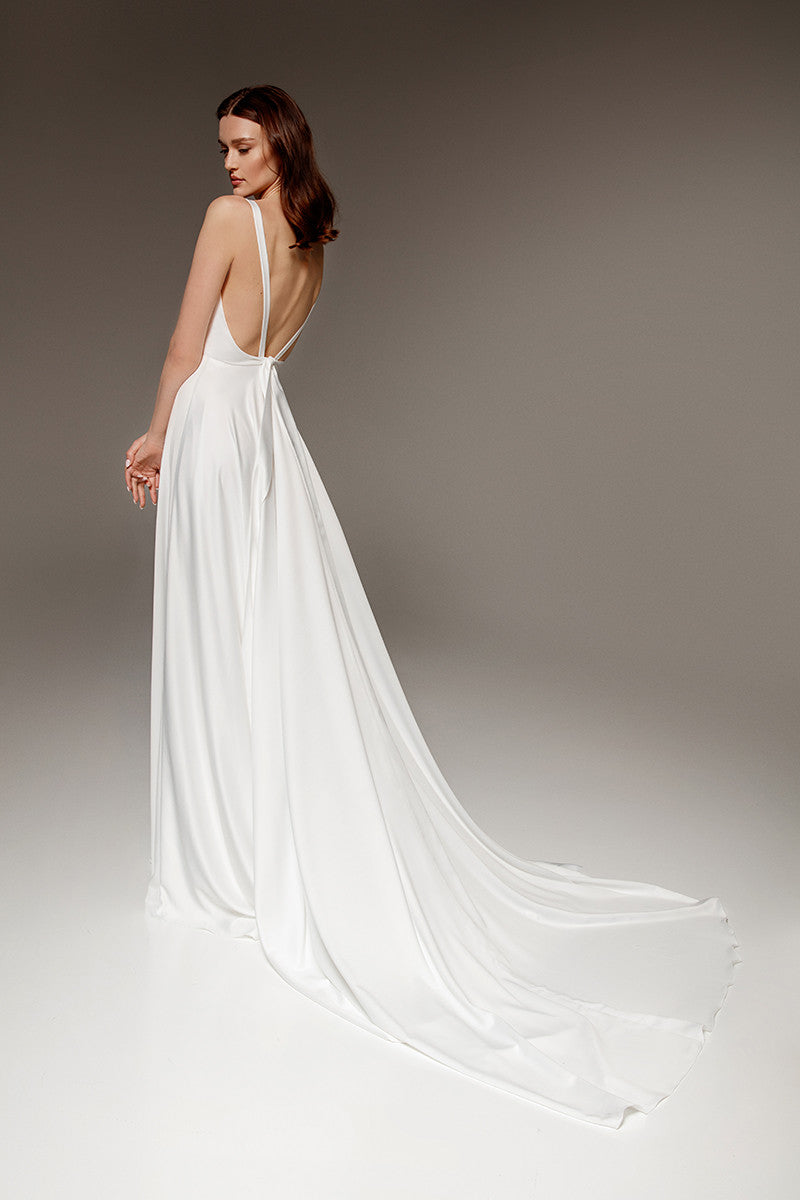 A maxi silk dress with an A-line skirt and a high split. The V-neck dips to a delicate strap, showing off your shoulders and collarbones. The back is tied with a bow or dangling ribbons, and there's a belt for some extra flair.