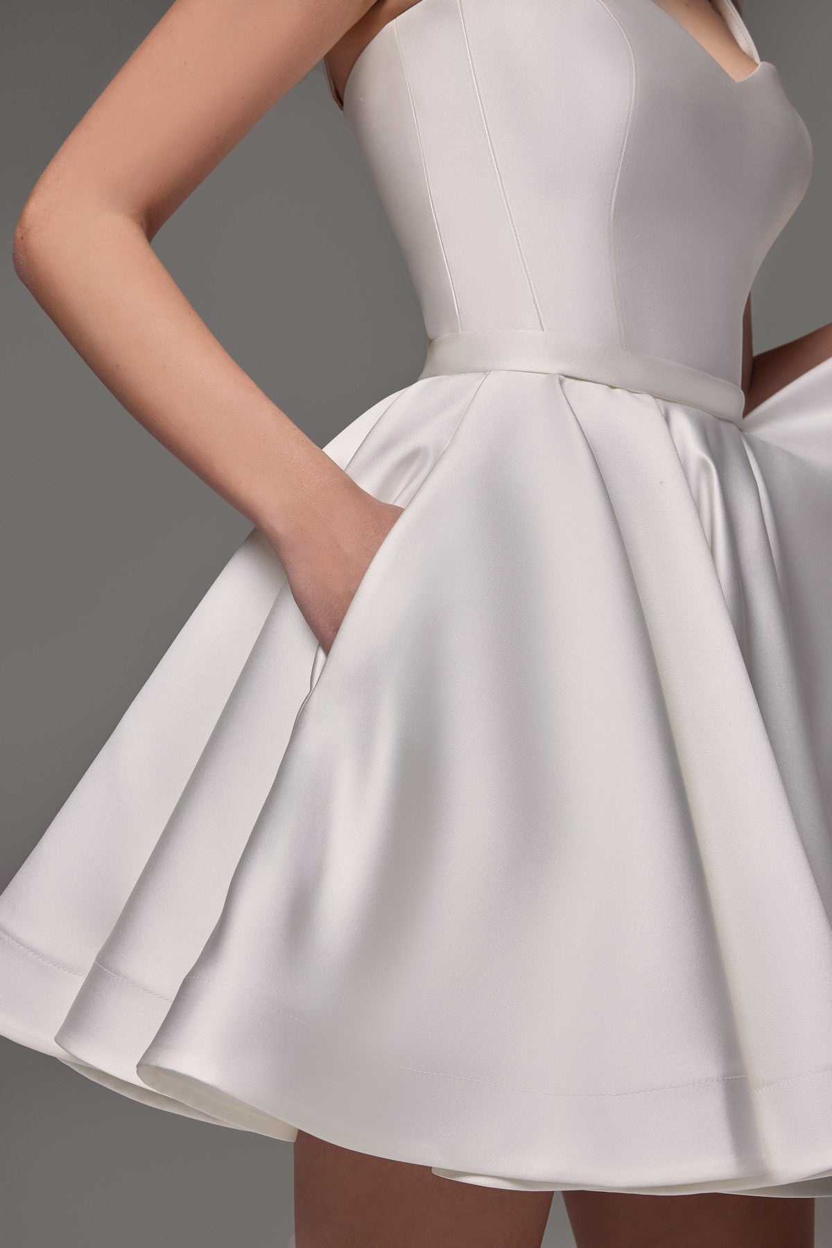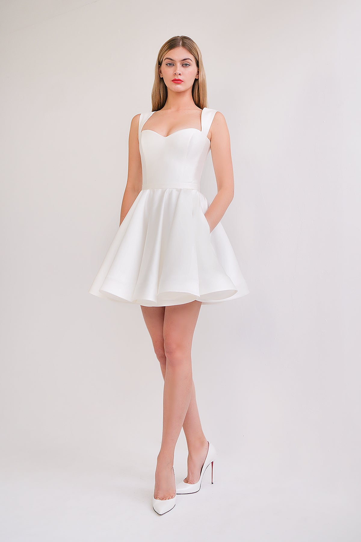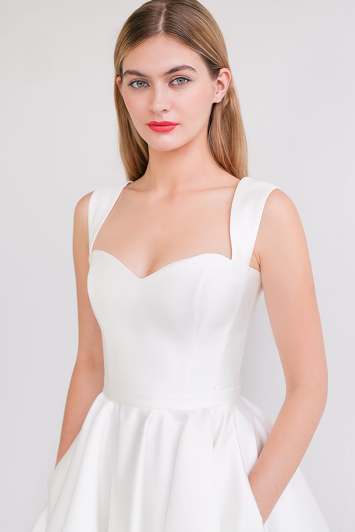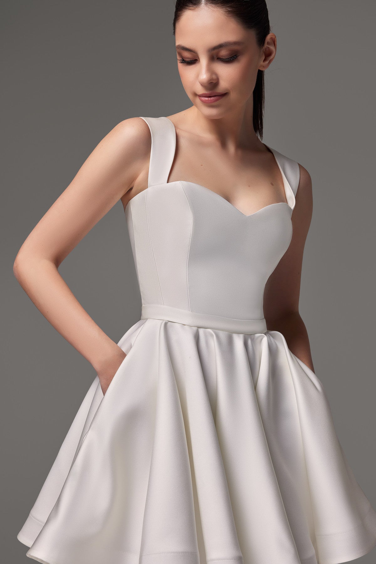 A minimalist corset dress with a sweetheart neckline and wide straps provides a great support for any size. The dress features full satin skirt with pockets.