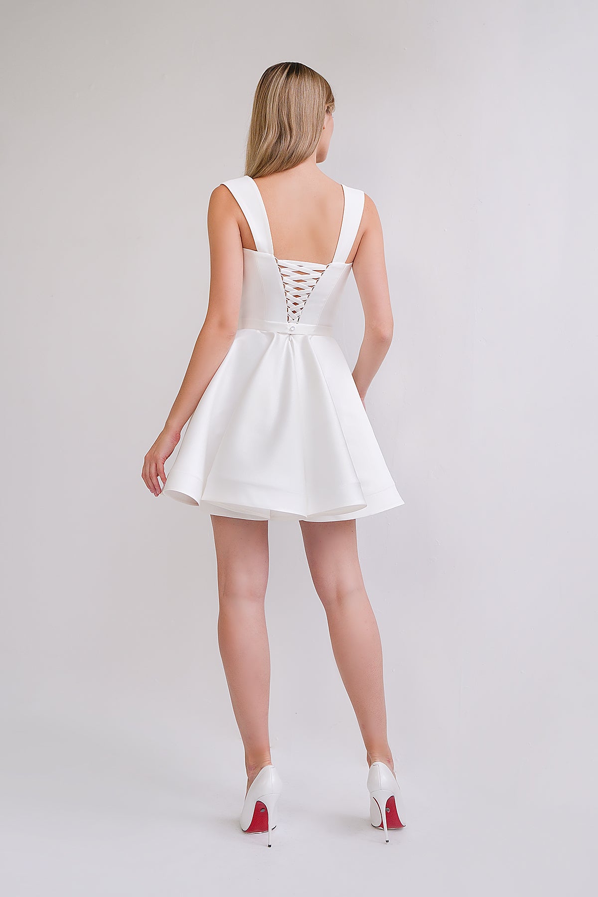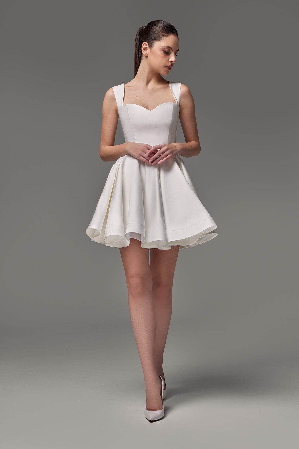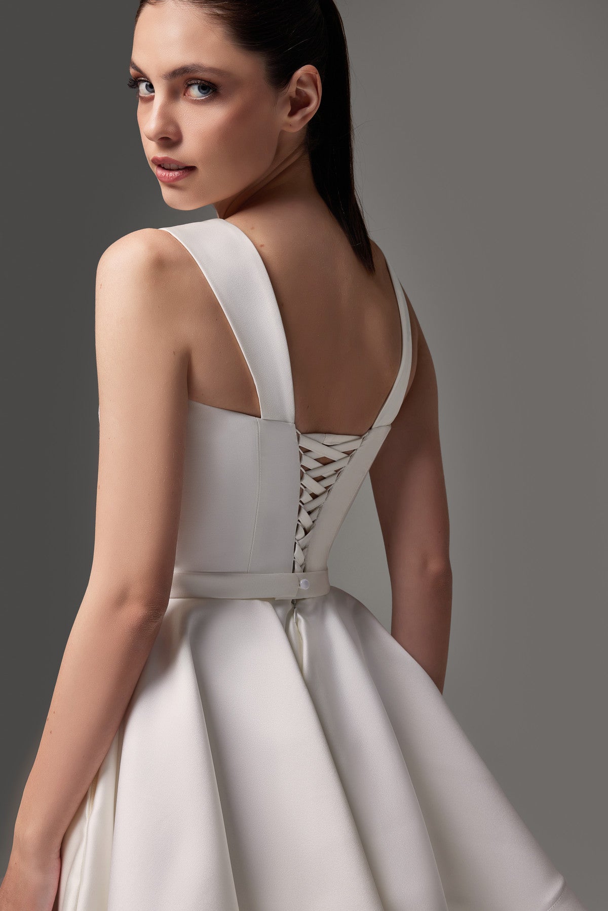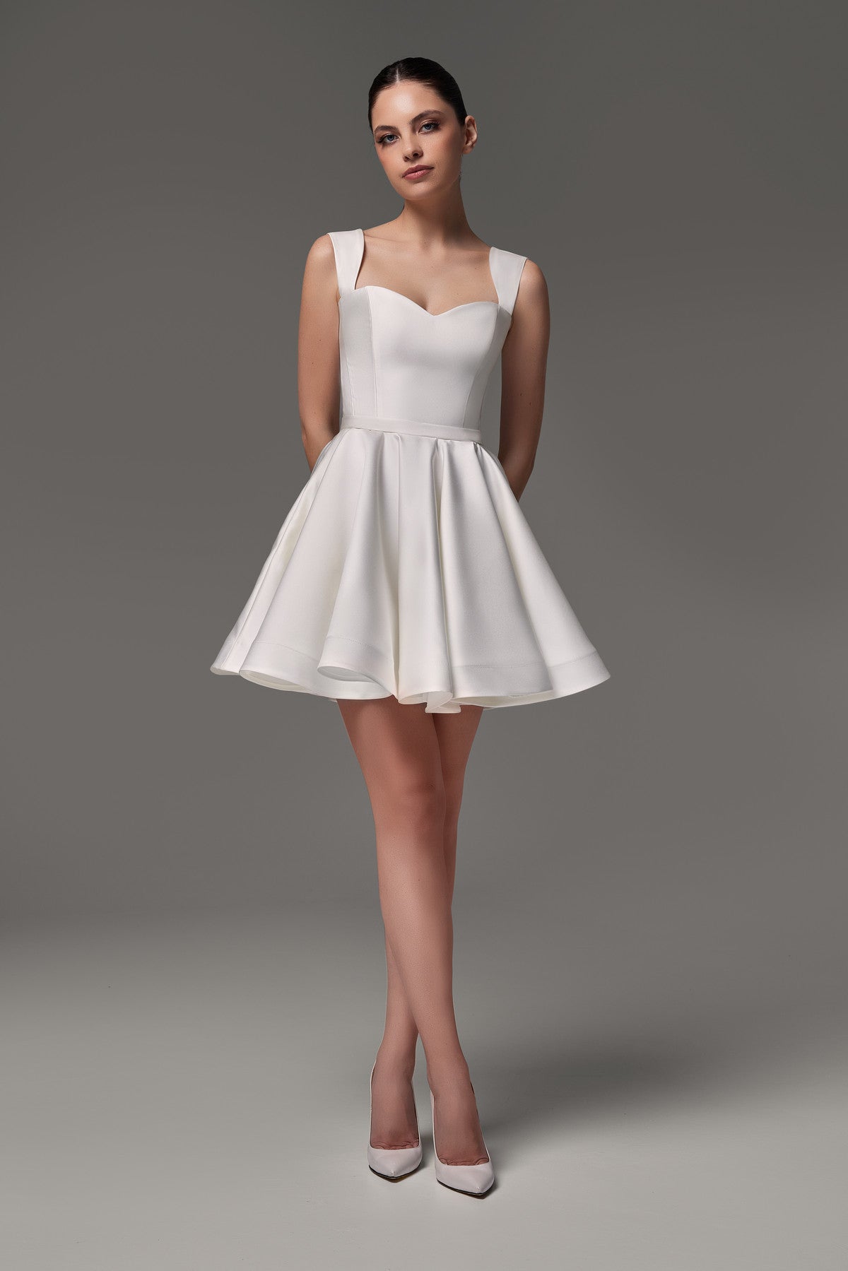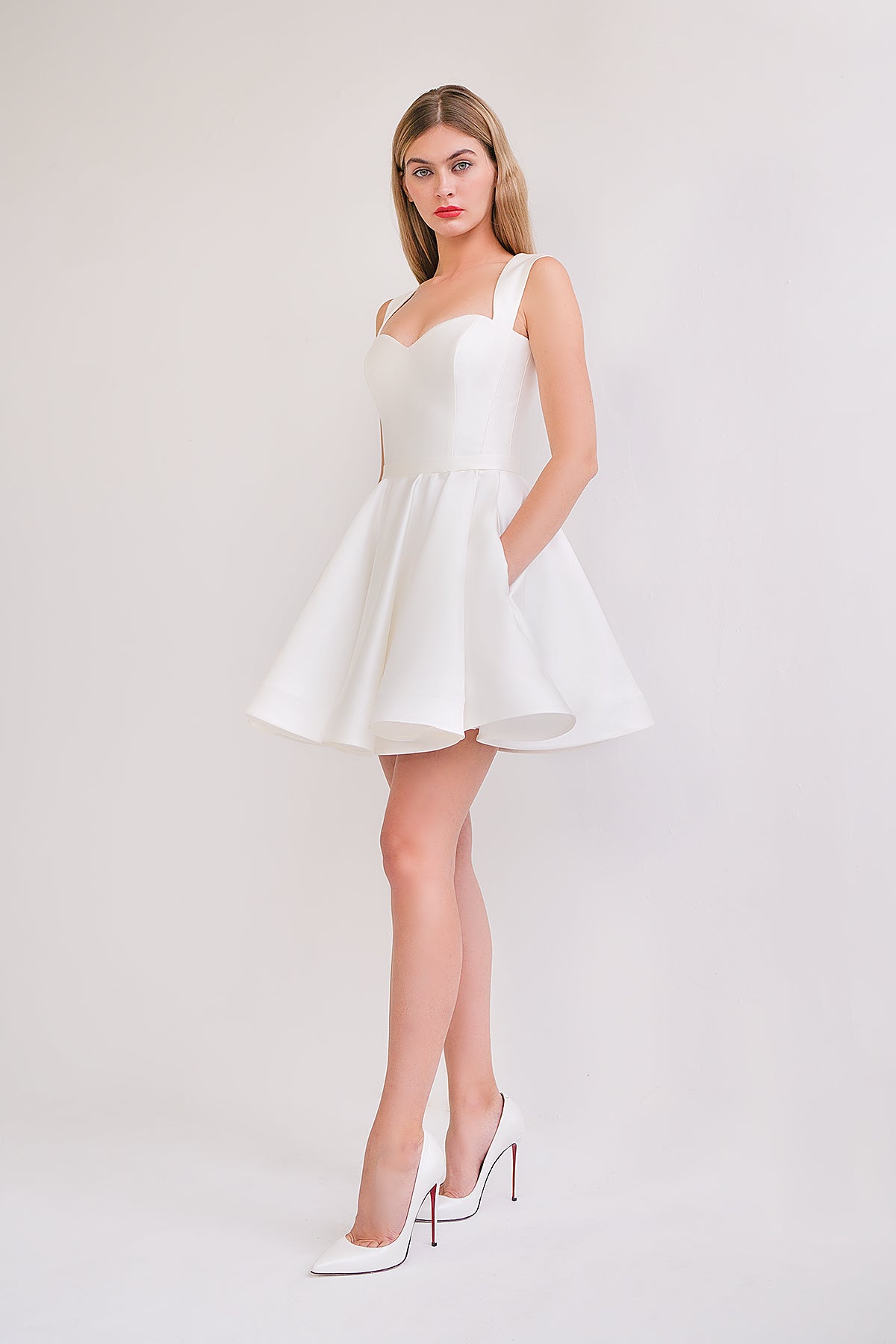 A minimalist corset dress with a sweetheart neckline and wide straps provides a great support for any size. The dress features full satin skirt with pockets.