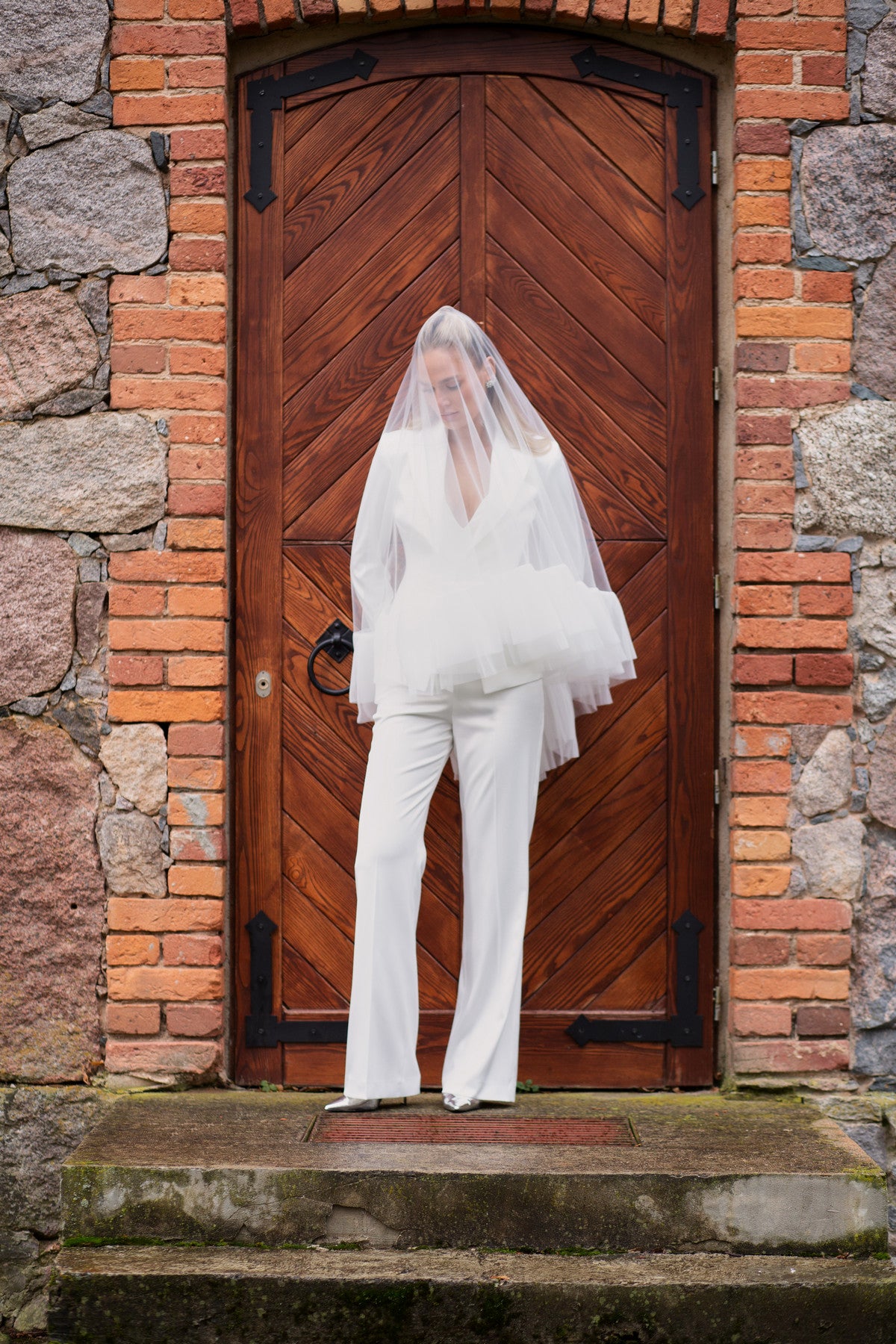 Modern Bridal Pantsuit Elif With Satin Drop Waist Corset And Long Sleeve Jacket