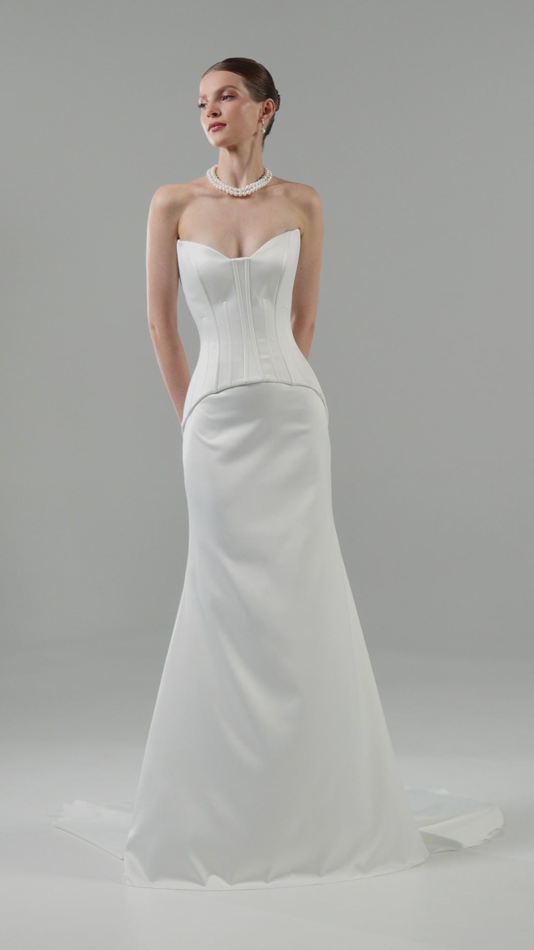 The clean, sweetheart neckline adds a soft, romantic touch, while the sleek satin skirt skims the figure before flowing into a dramatic, sweeping train. Designed for the confident bride who adores simplicity with a high-fashion edge, this gown embodies effortless sophistication.