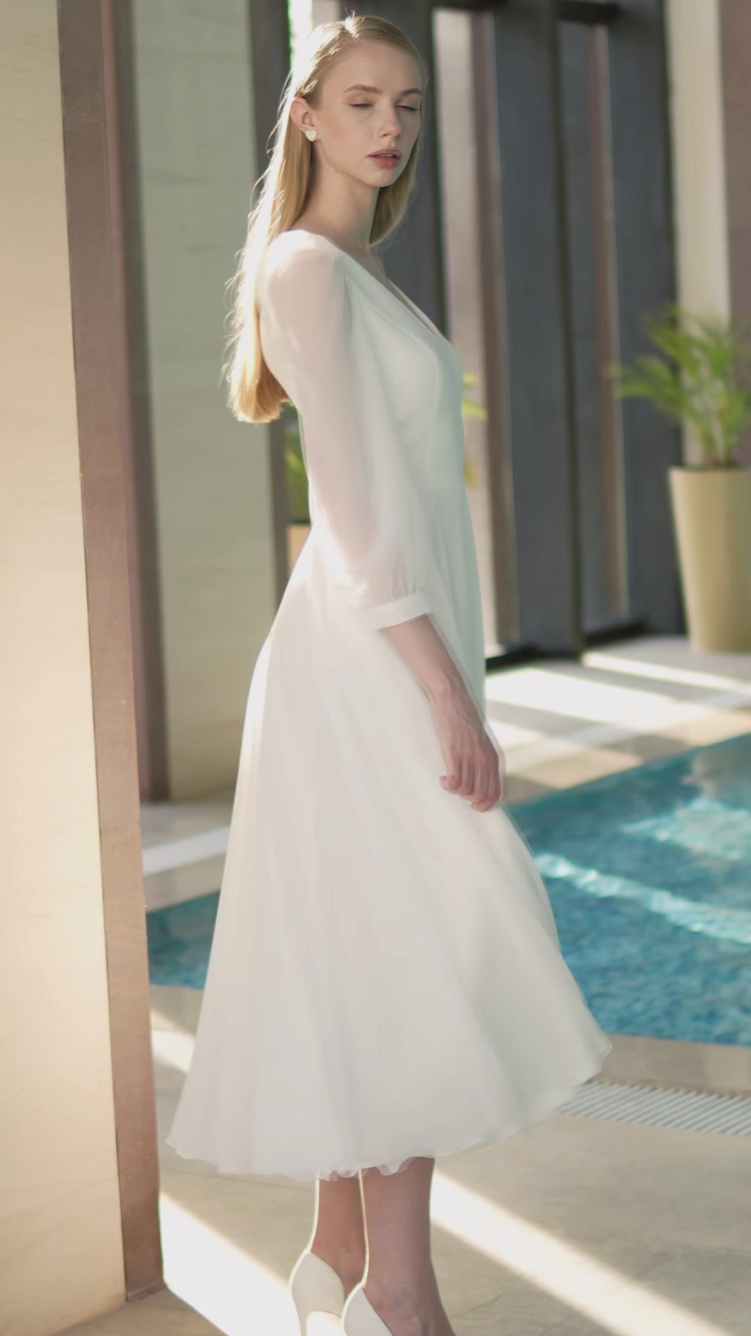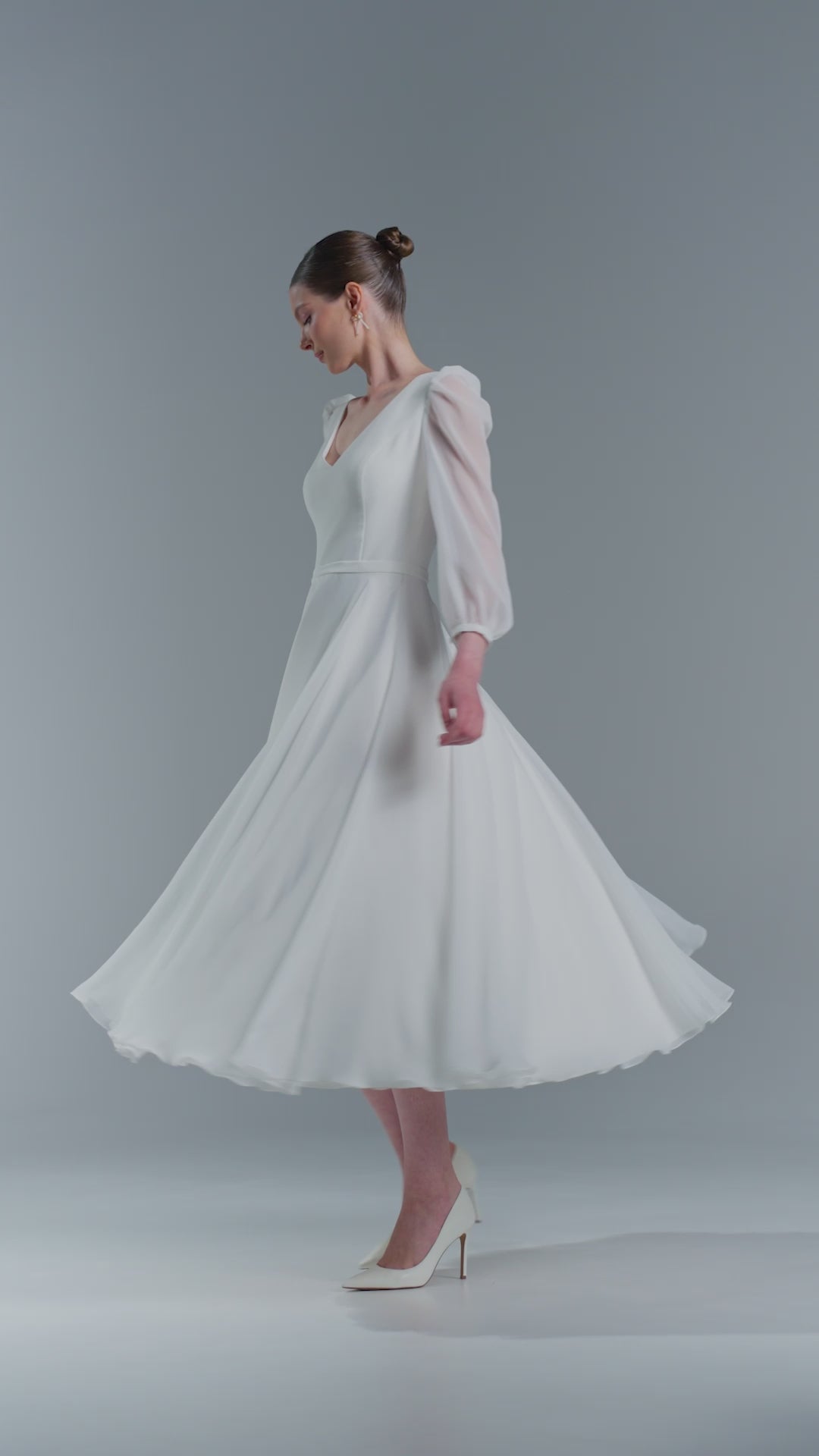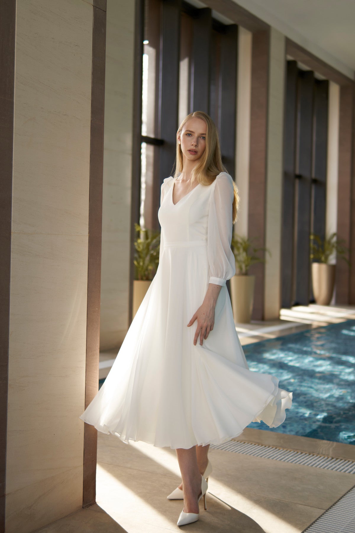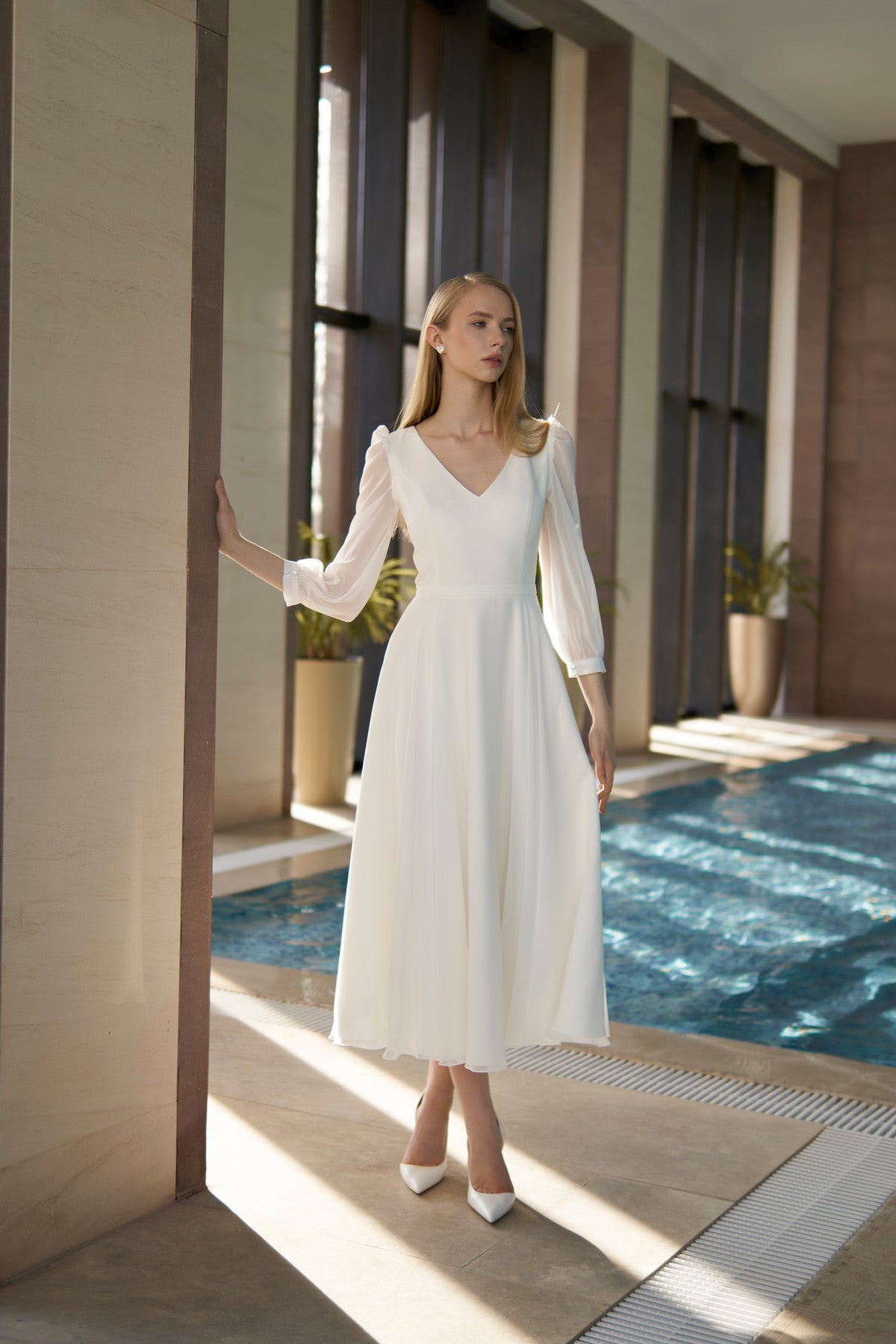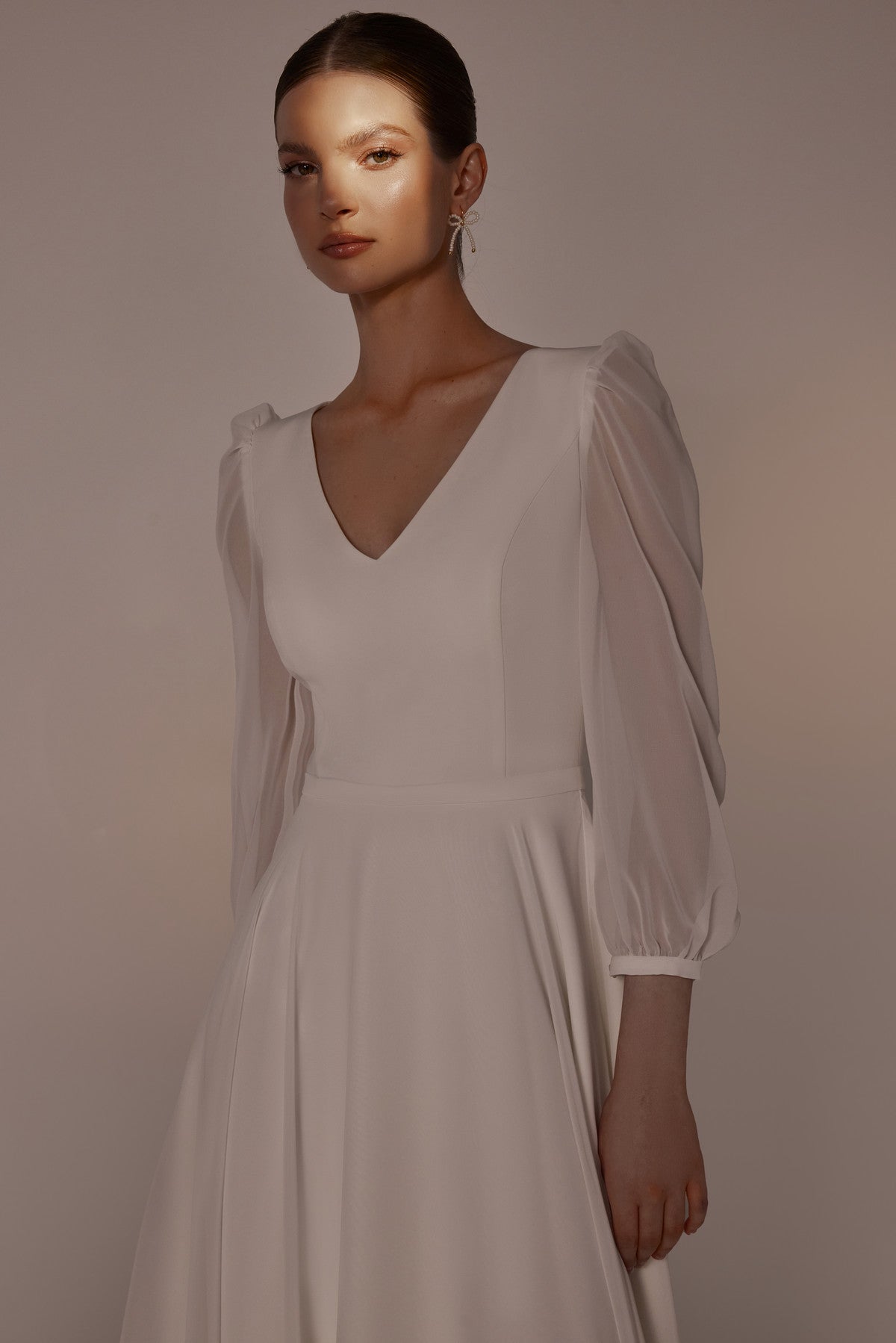 Modest A-line Midi Wedding Dress Valerie with Chiffon Sleeves