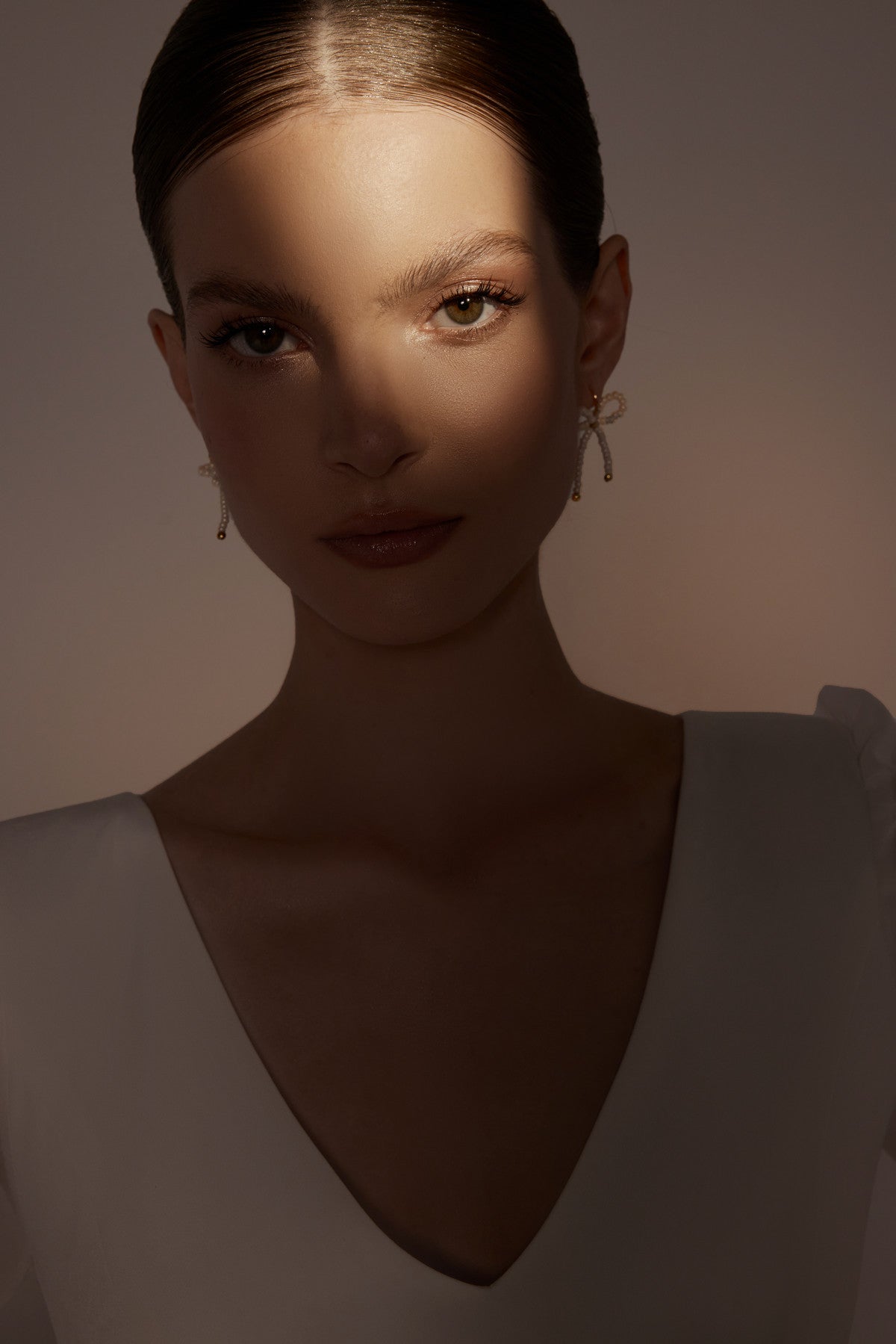 Get swept away in the Valerie dress, a simple A-line wedding gown wrapped in a soft layer of delicate chiffon. The V-neck accentuates the soft crepe bodice, while semi-transparent 3/4 length chiffon sleeves add a romantic touch to this versatile wedding look. A clean and simple aesthetic is completed by a soft A-line skirt that flows and moves with every step, this wedding dress is also available in plus sizes.