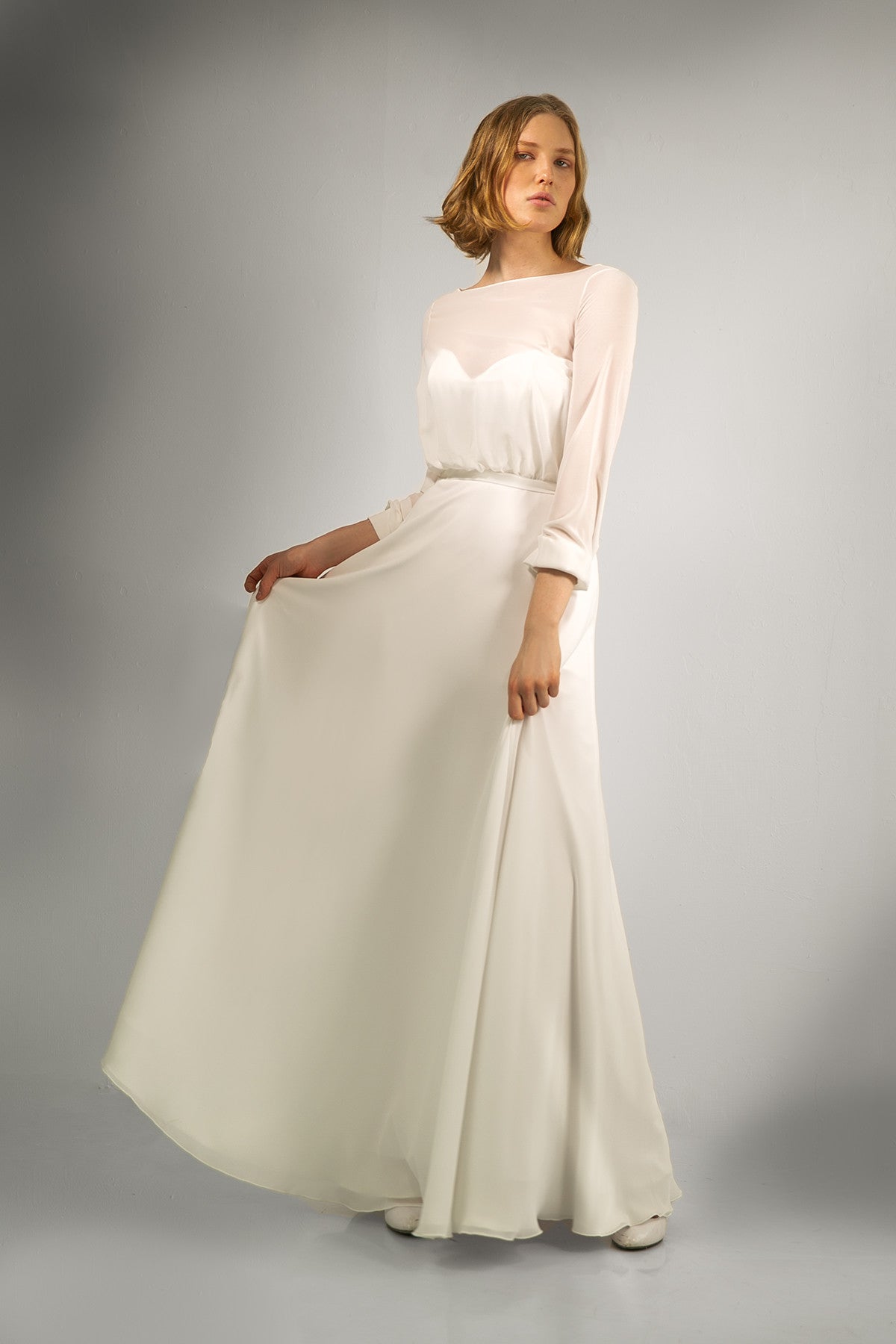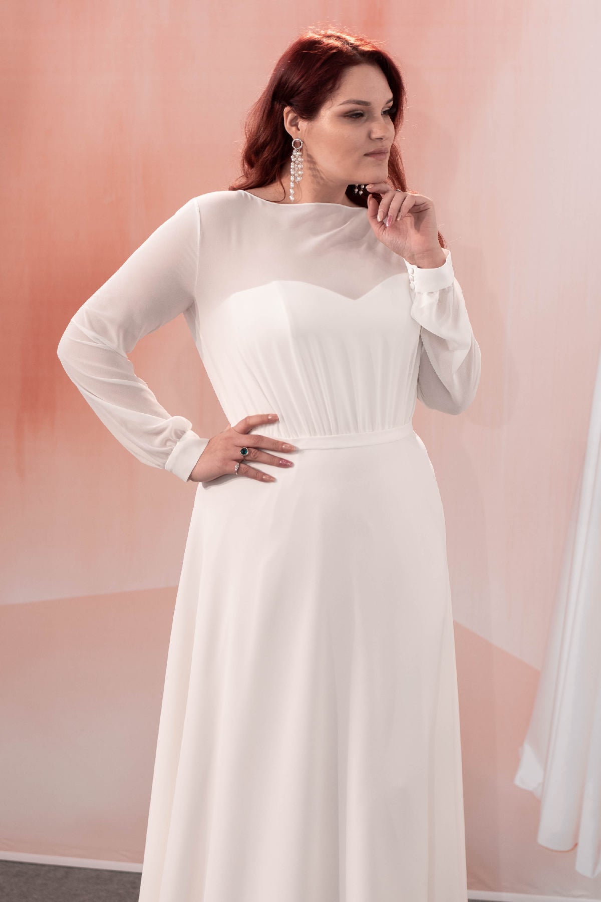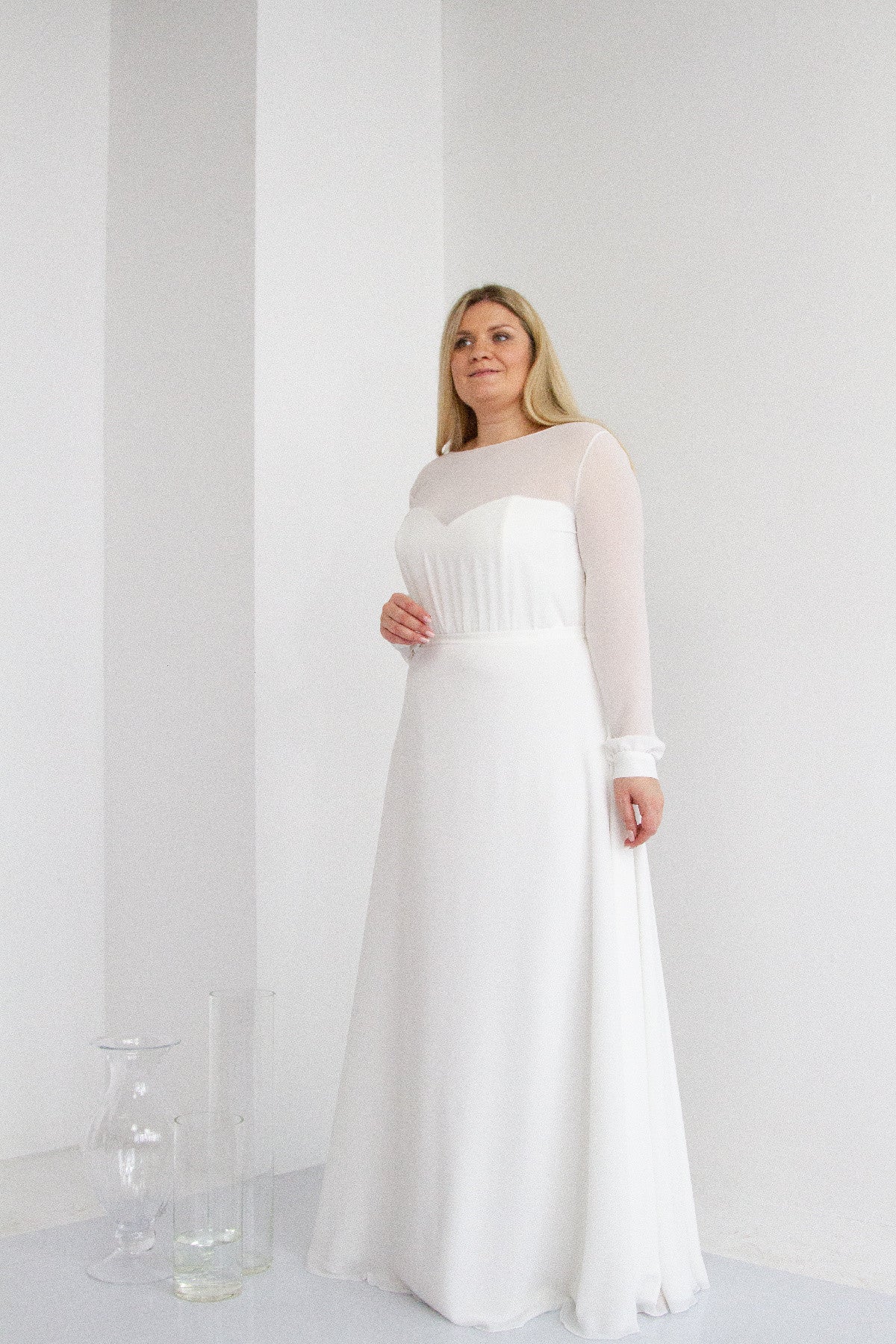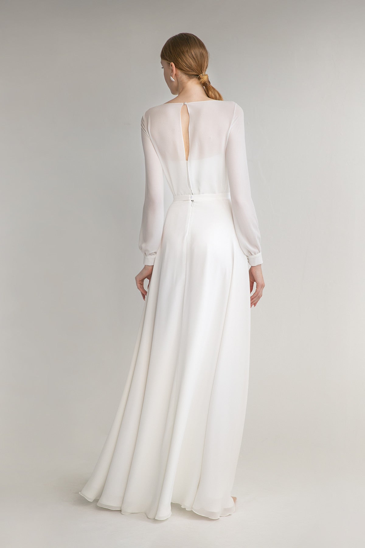 The wedding dress Vivian is so simple and elegant! It has a corset top made of viscose silk, which is covered with a see-through chiffon material. Long sleeves with buttoned cuffs add a touch of sophistication, while the boat-neck design of the neckline adds a hint of femininity. A semi-circle A-line silhouette maxi length skirt hugs the waist and is accentuated by a thin belt.