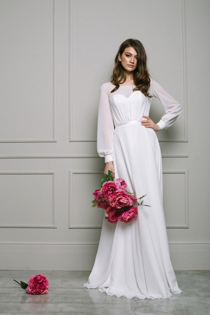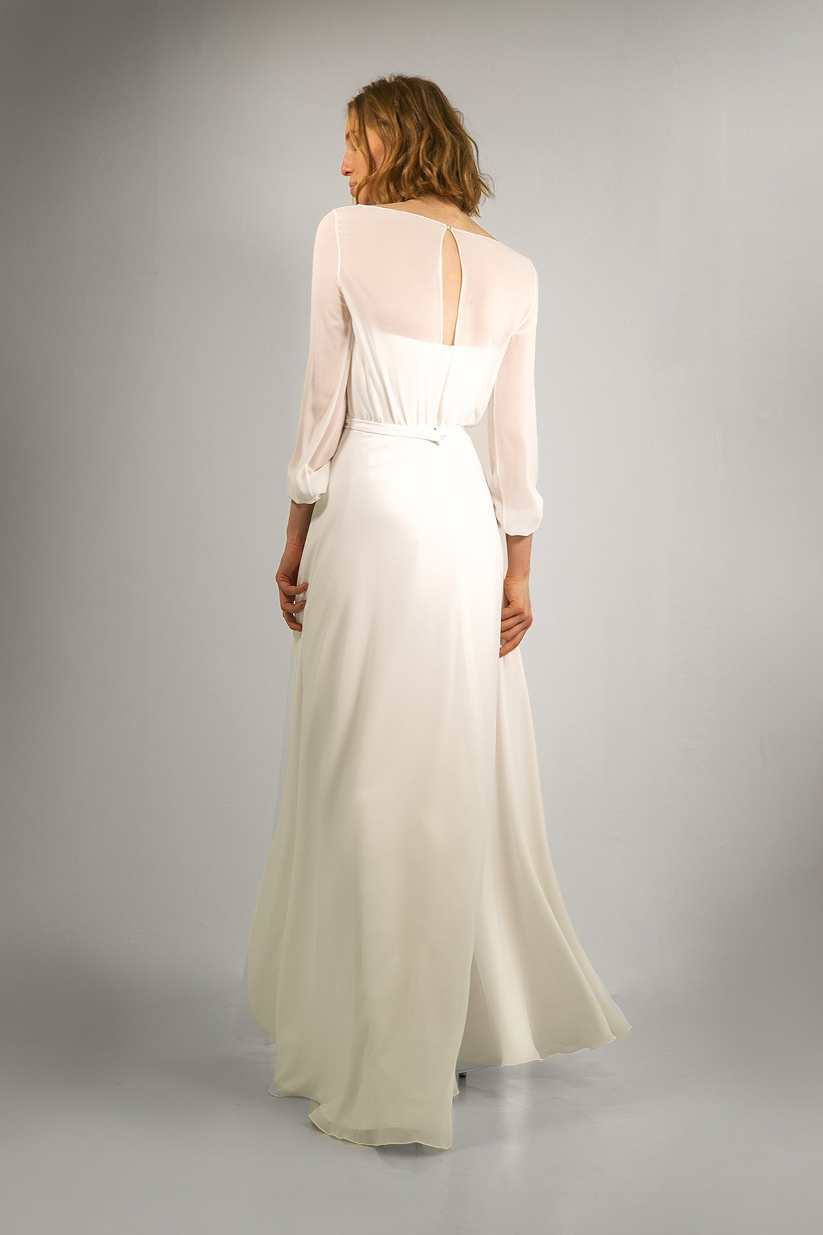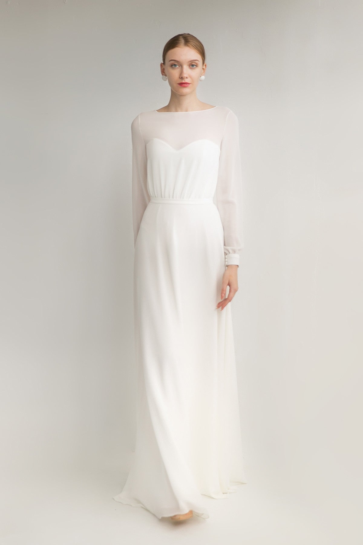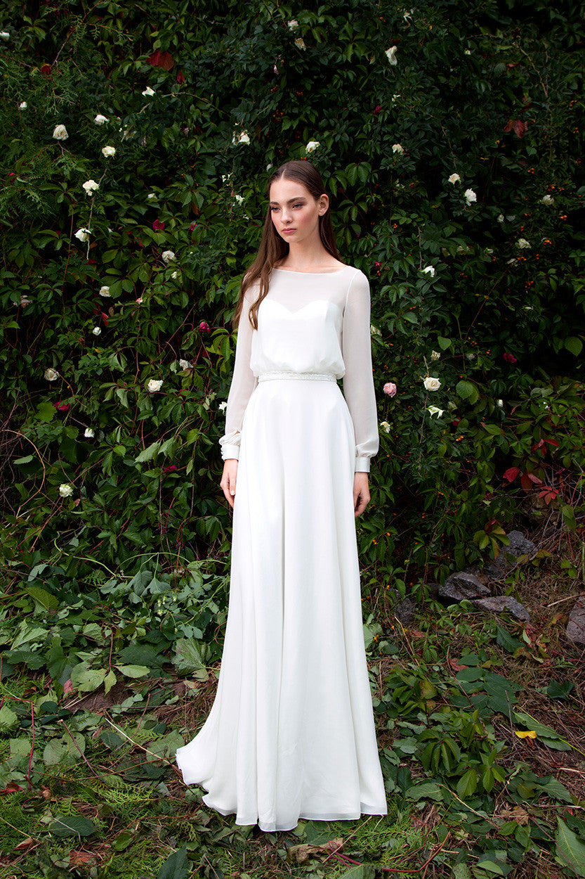 The wedding dress Vivian is so simple and elegant! It has a corset top made of viscose silk, which is covered with a see-through chiffon material. Long sleeves with buttoned cuffs add a touch of sophistication, while the boat-neck design of the neckline adds a hint of femininity. A semi-circle A-line silhouette maxi length skirt hugs the waist and is accentuated by a thin belt.