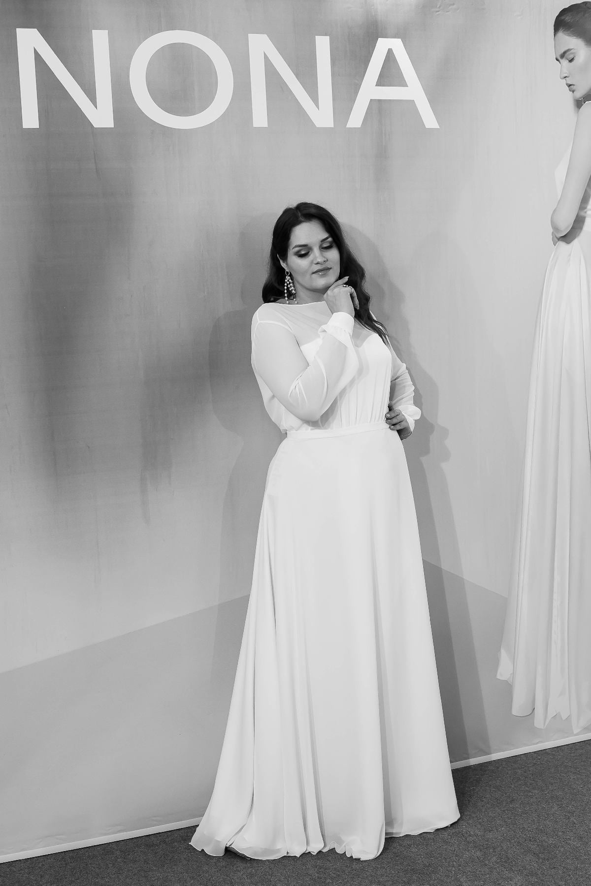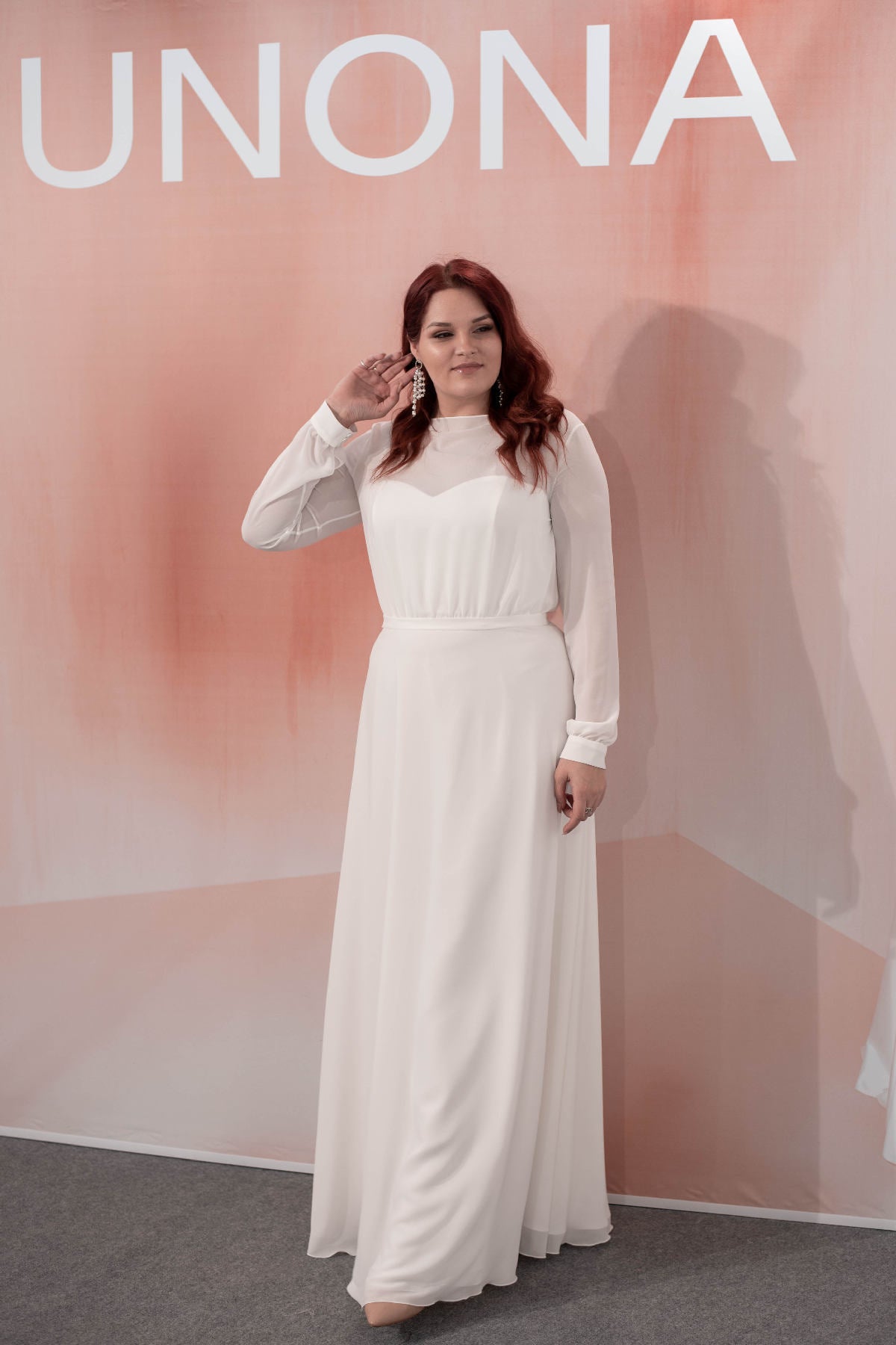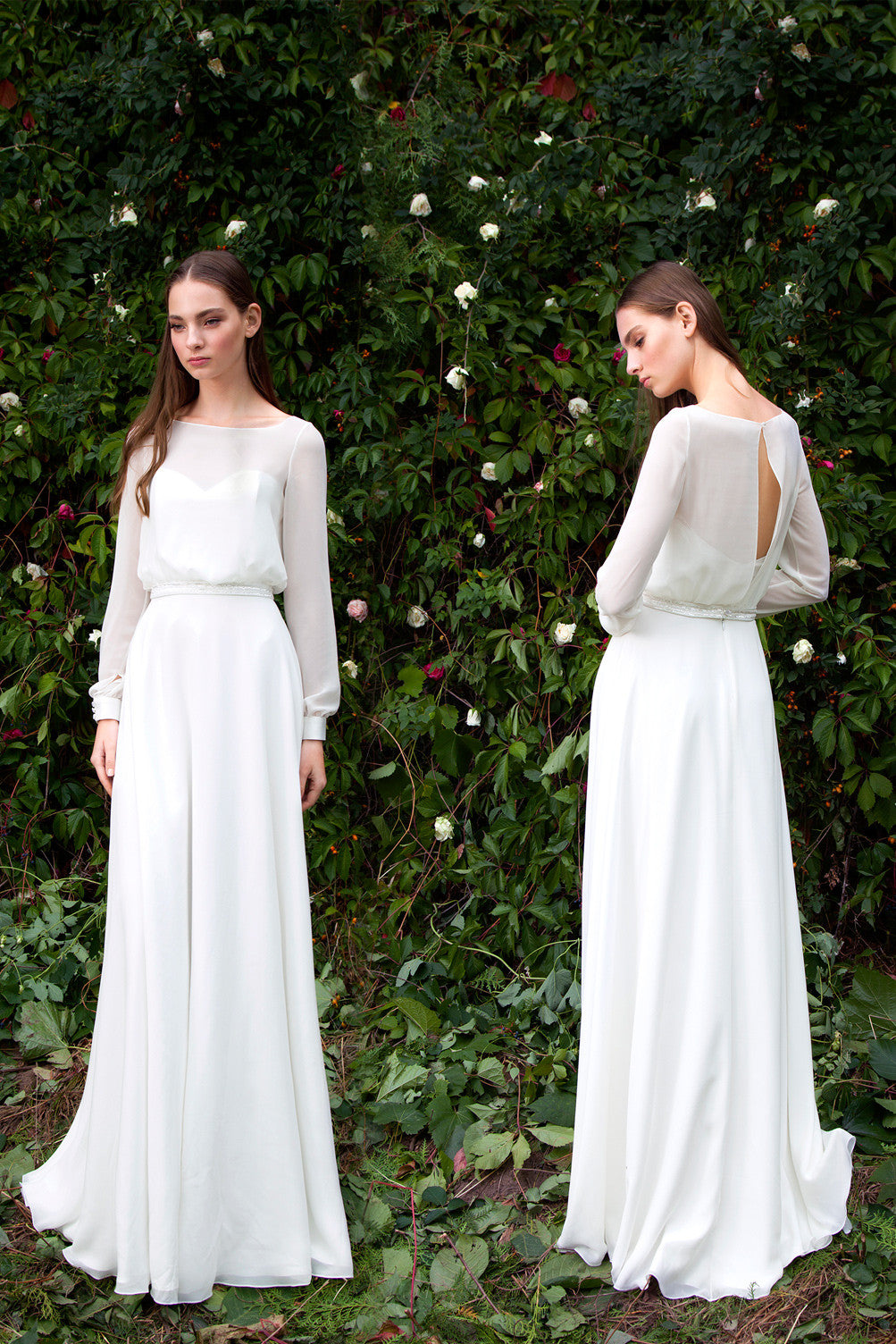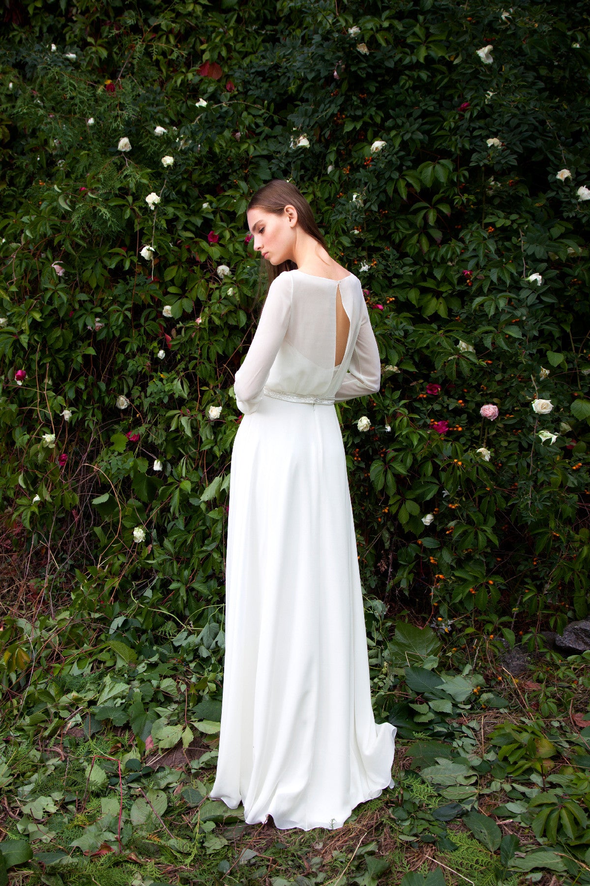 The wedding dress Vivian is so simple and elegant! It has a corset top made of viscose silk, which is covered with a see-through chiffon material. Long sleeves with buttoned cuffs add a touch of sophistication, while the boat-neck design of the neckline adds a hint of femininity. A semi-circle A-line silhouette maxi length skirt hugs the waist and is accentuated by a thin belt.