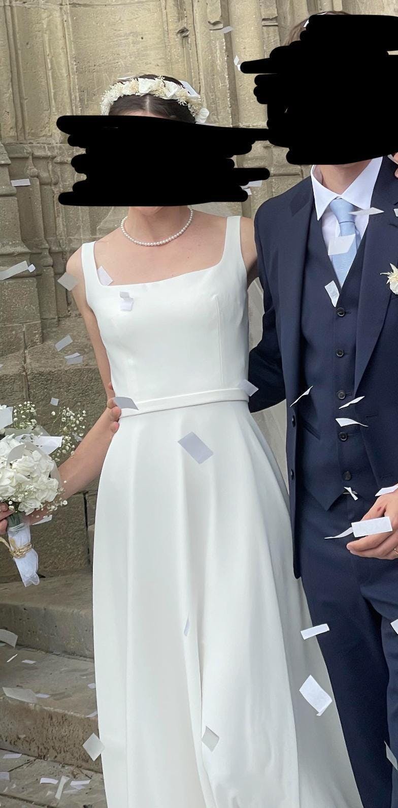 A simple crepe dress with a chiffon skirt is a good choice for a modern bride who is looking for an A-line wedding dress with a square neckline and a natural waist that's cinched with a belt. The long wedding gown has a zipper at the back.