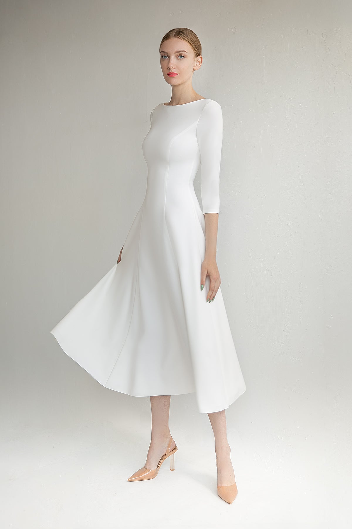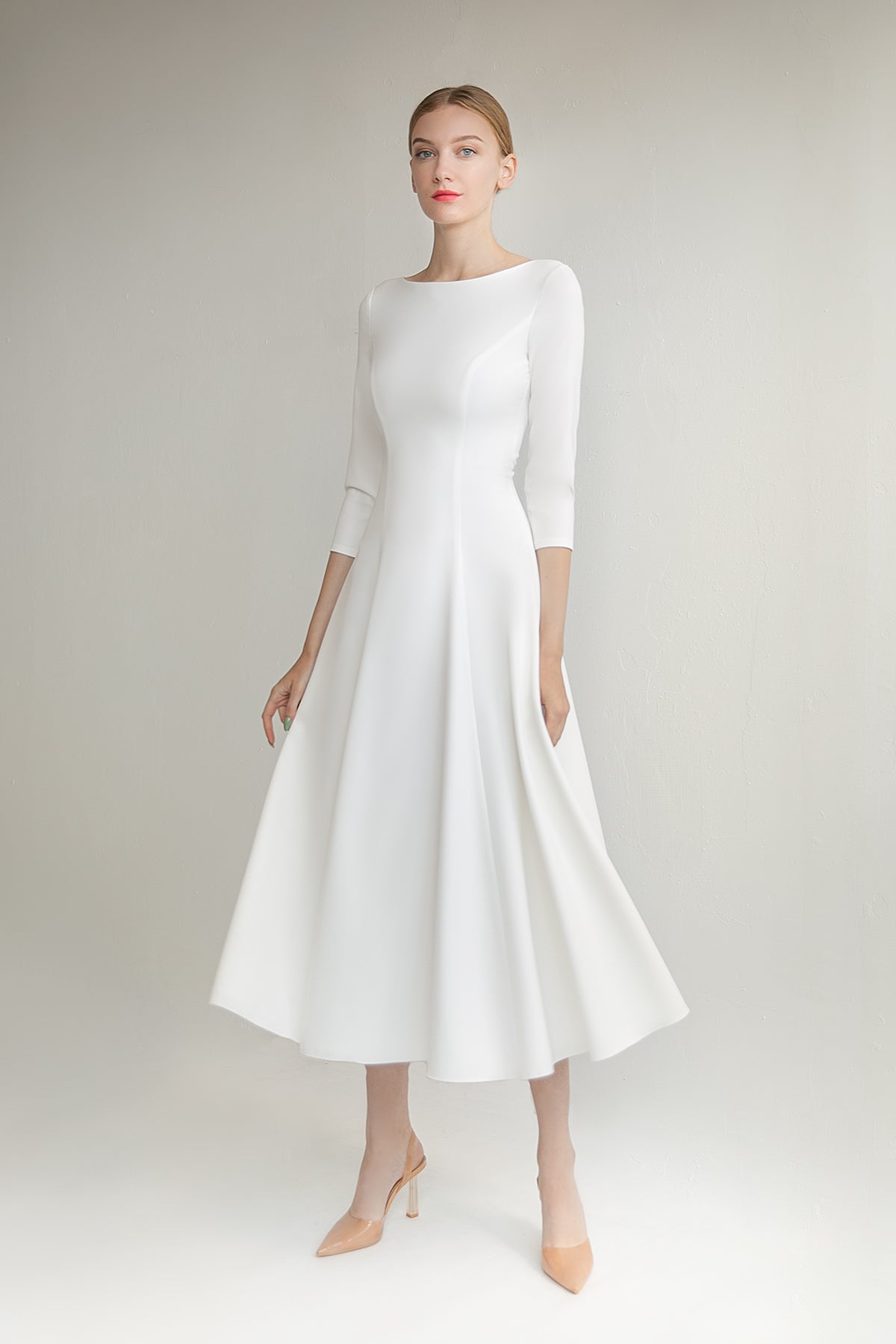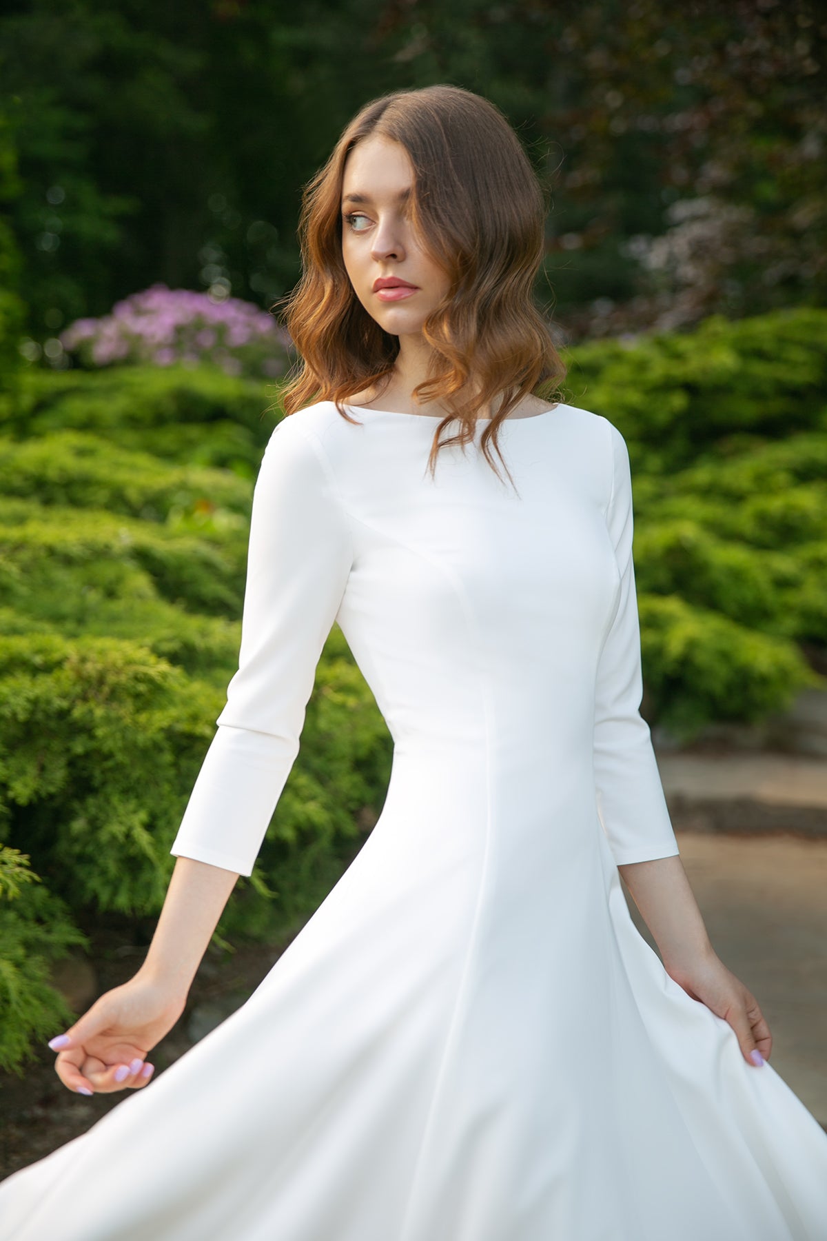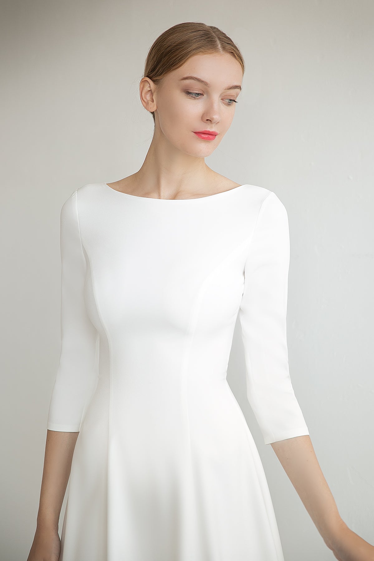 A semi-fitted, tea length wedding dress made from crepe stretch material with a boat neckline and three-quarter length sleeves. The front and back have princess seams, which visually elongate the silhouette and create a smooth, flowing effect from the waist down.