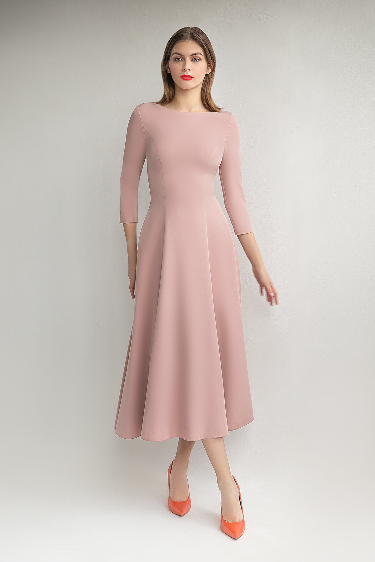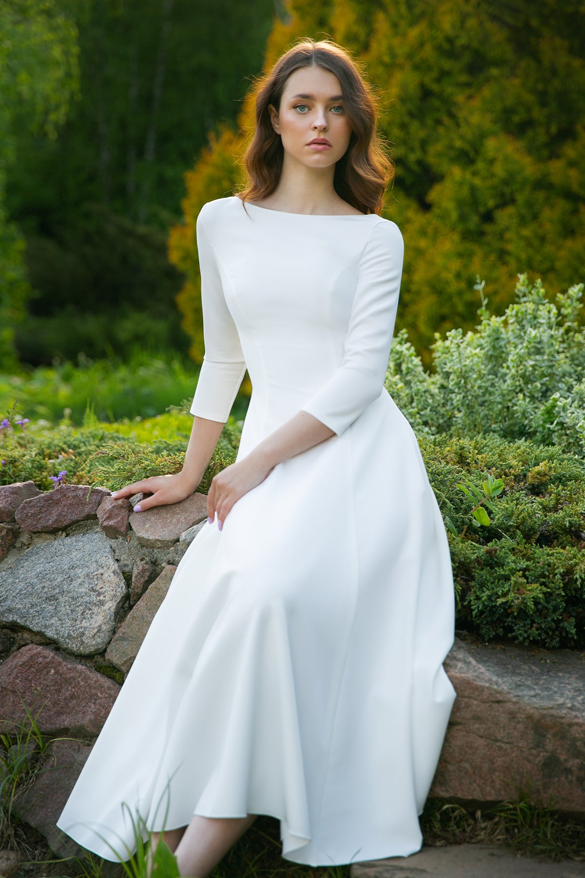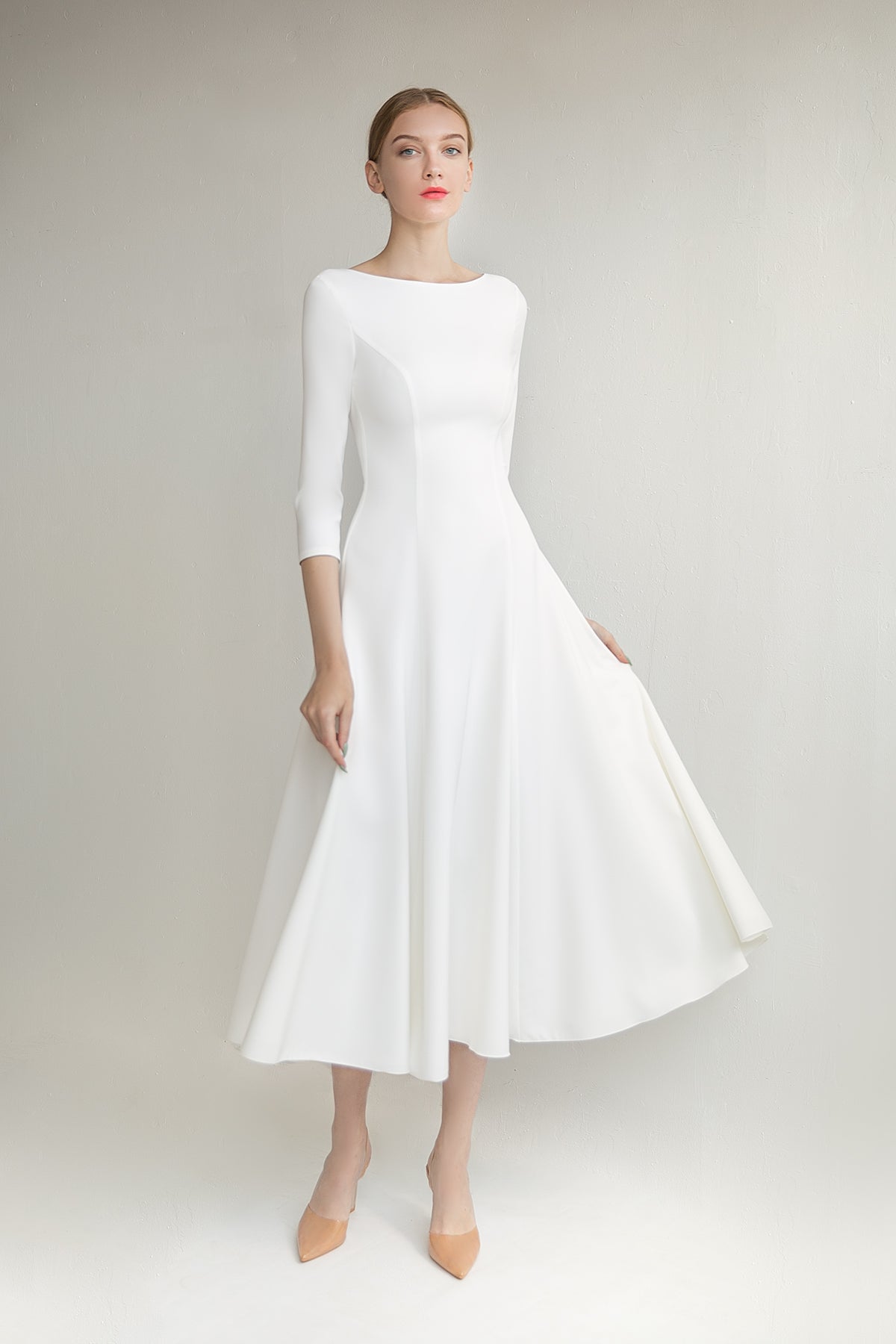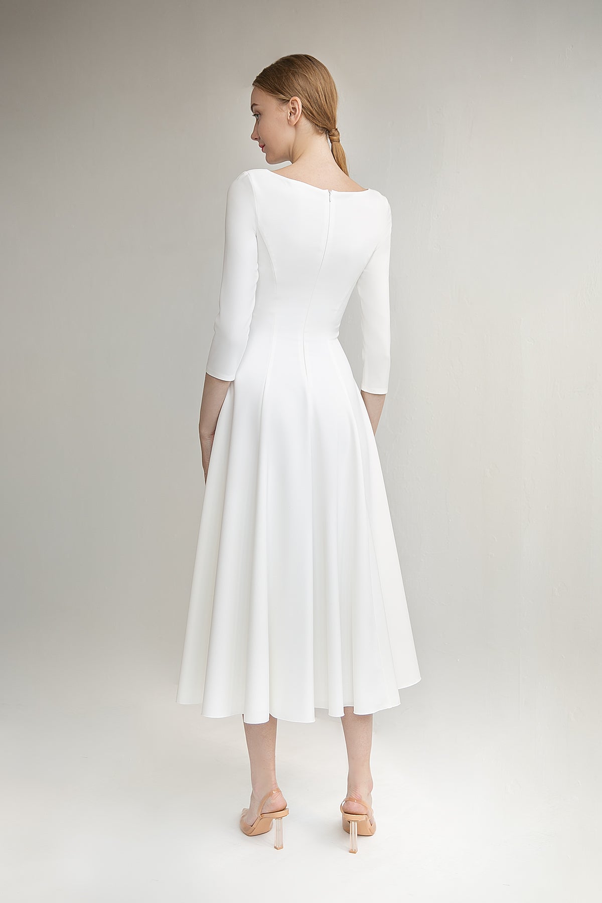 A semi-fitted, tea length wedding dress made from crepe stretch material with a boat neckline and three-quarter length sleeves. The front and back have princess seams, which visually elongate the silhouette and create a smooth, flowing effect from the waist down.