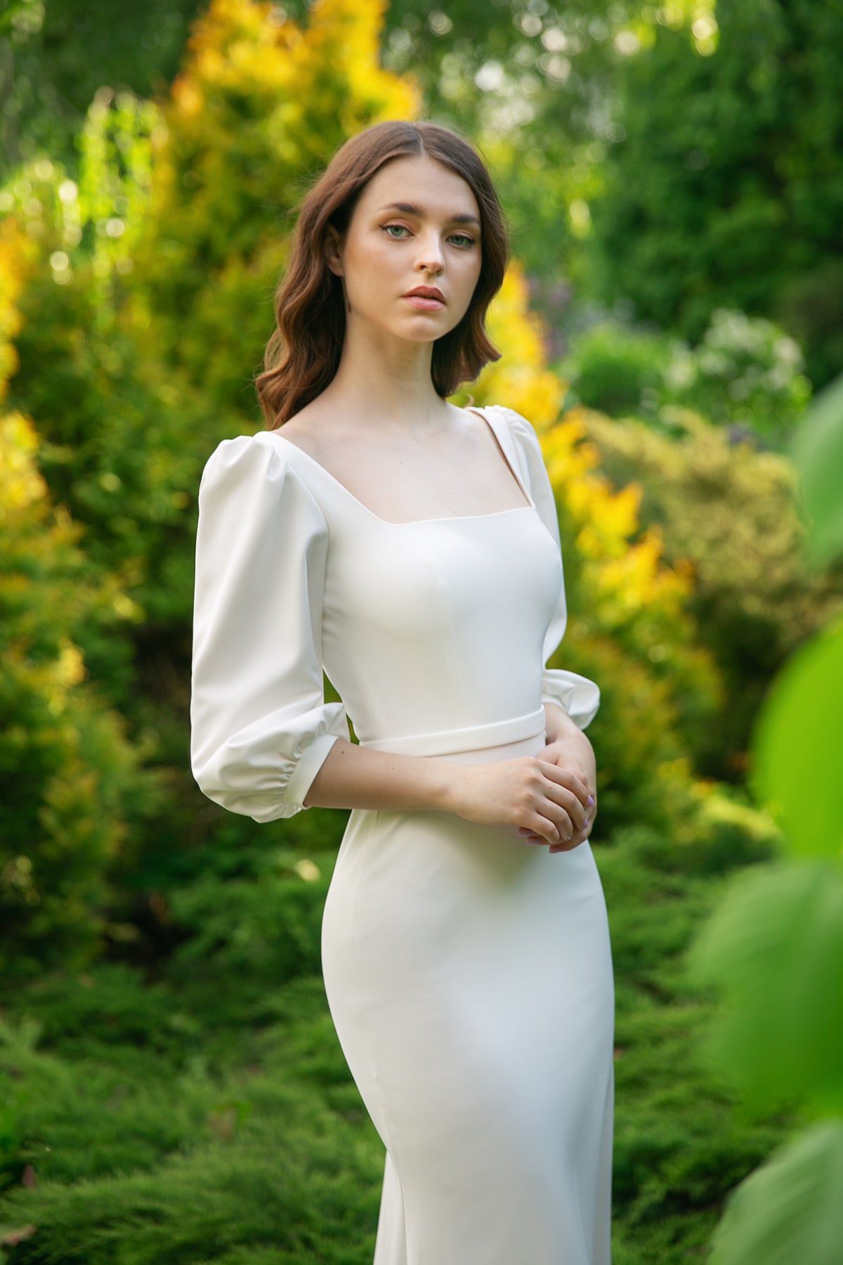 This simple wedding dress features a sophisticated pairing of square neckline and bishop sleeves, as well as a fit & flare skirt of tea length. In timeless luxe neutral shades, this style will live in your closet for years to come and look gorgeous every time. Our elegant and simple wedding dress is the perfect choice for brides who want a modest and minimalistic wedding dress.