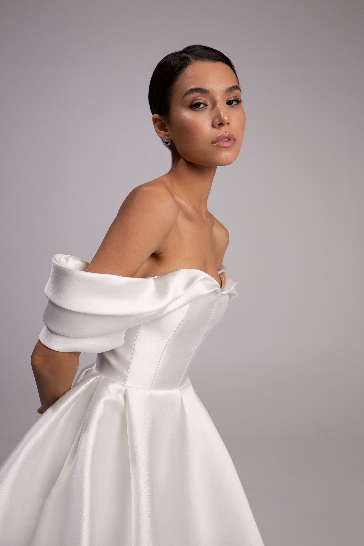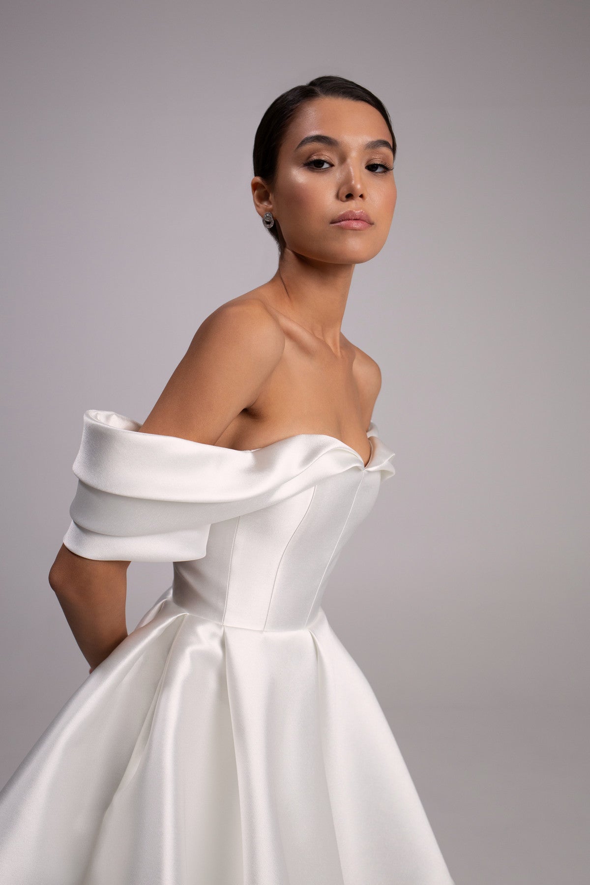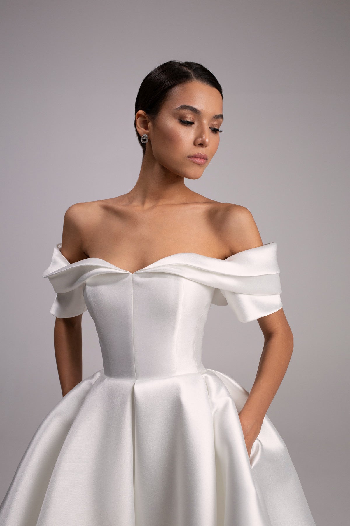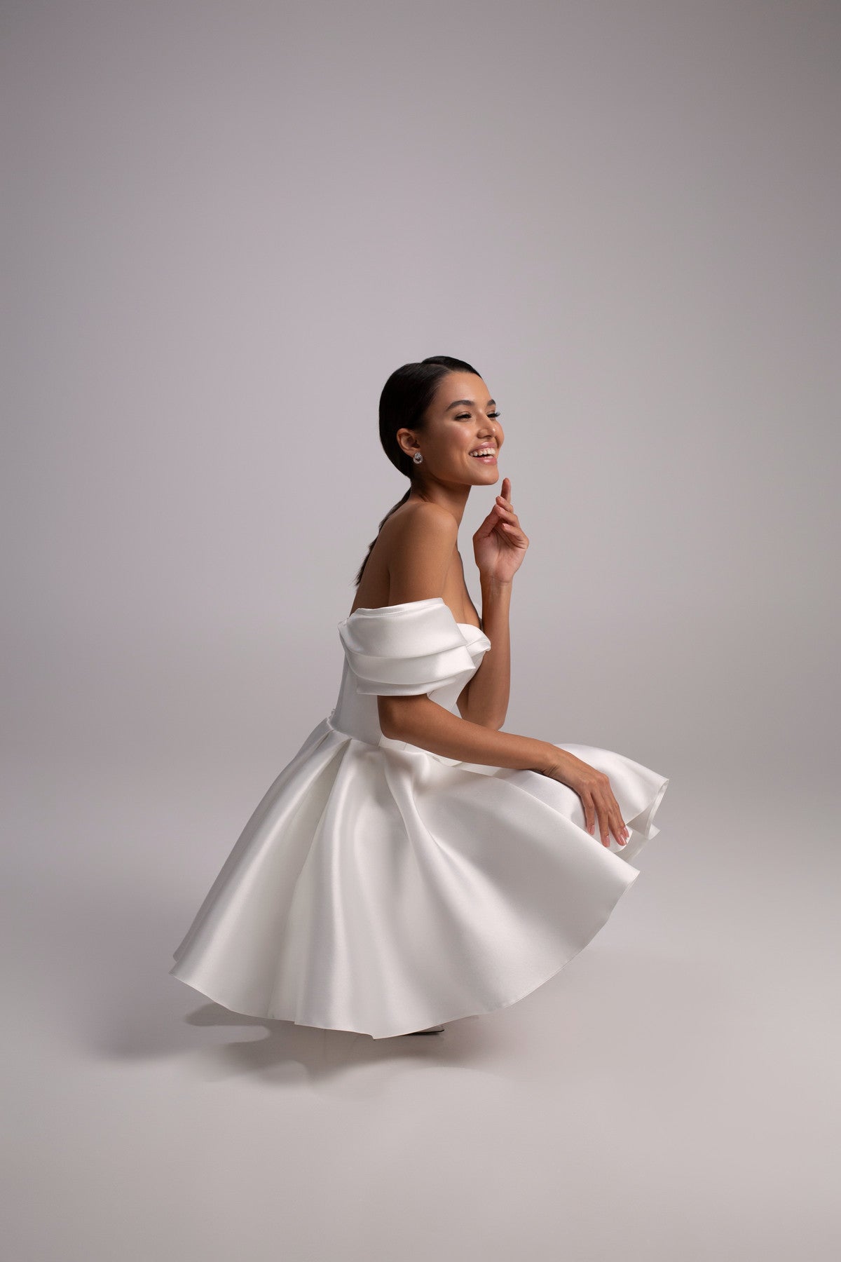 Our mini off-the-shoulder dress exudes elegance, with a fitted top and a voluminous skirt with pockets! It's the perfect mini wedding dress for any modern bride who wants to feel a bit like a princess! It would be great for a quick and simple elopement, a reception, an engagement party, or even a bridal shower!