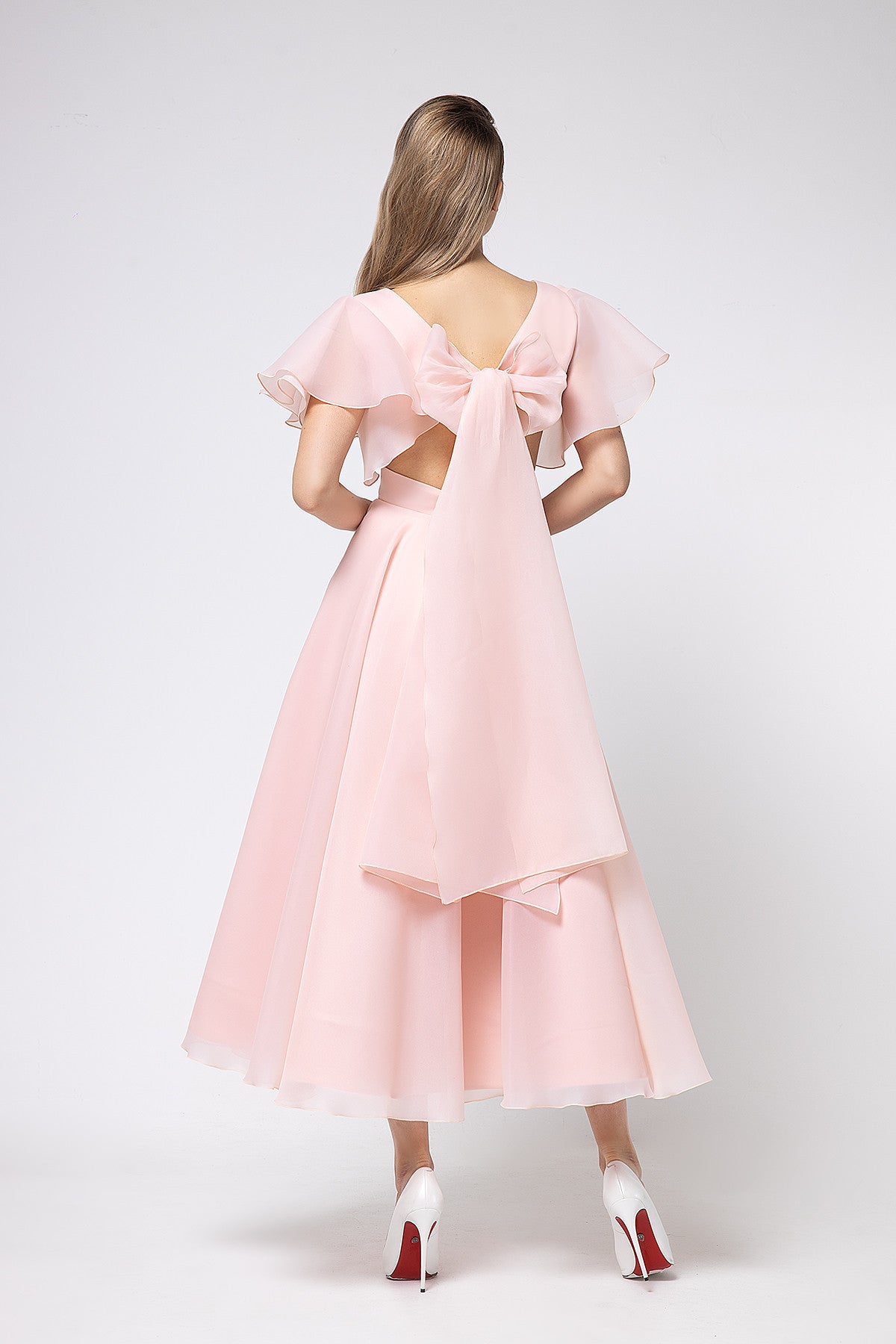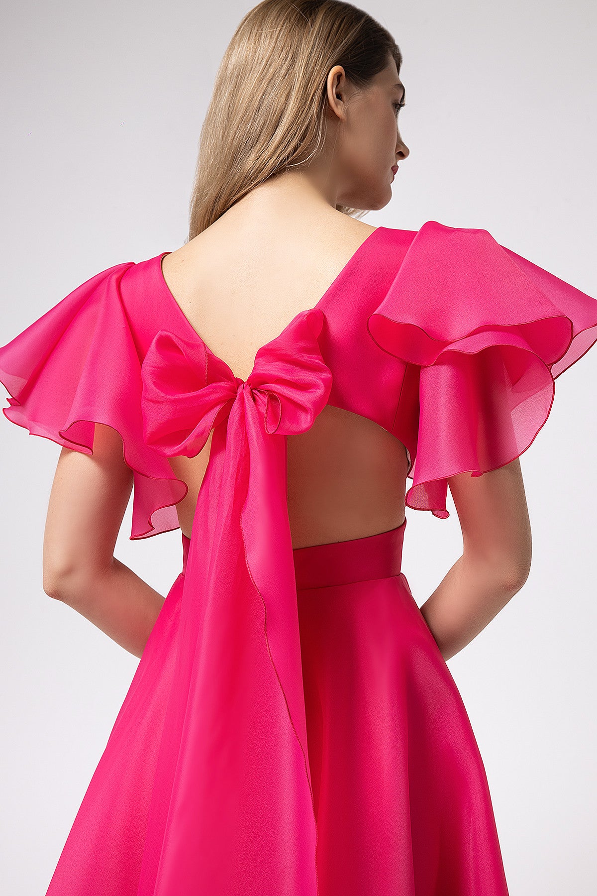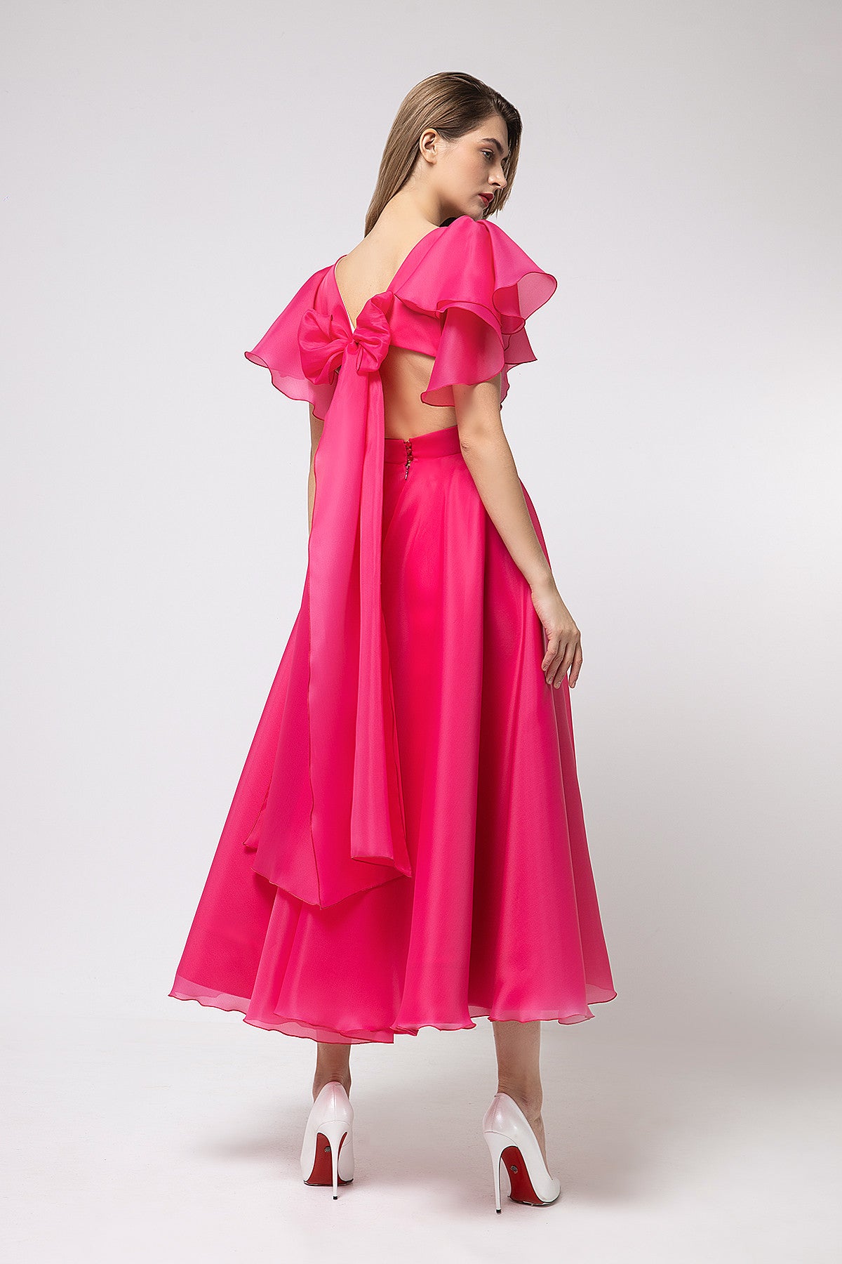 Show off your curves in a romantic evening dress made of lightweight organza fabric. A tea-length dress expresses your elegance, with clear and graphic lines intertwining in the bodice and soft, flowing flounces on the sleeves. The plunging illusion neckline emphasizes the chest, while the curled neckline at the back flows down to the front, revealing the body. At the back, the bodice is held in place by long ties at shoulder level, and the dress is completed with a wide, figure-hugging belt.