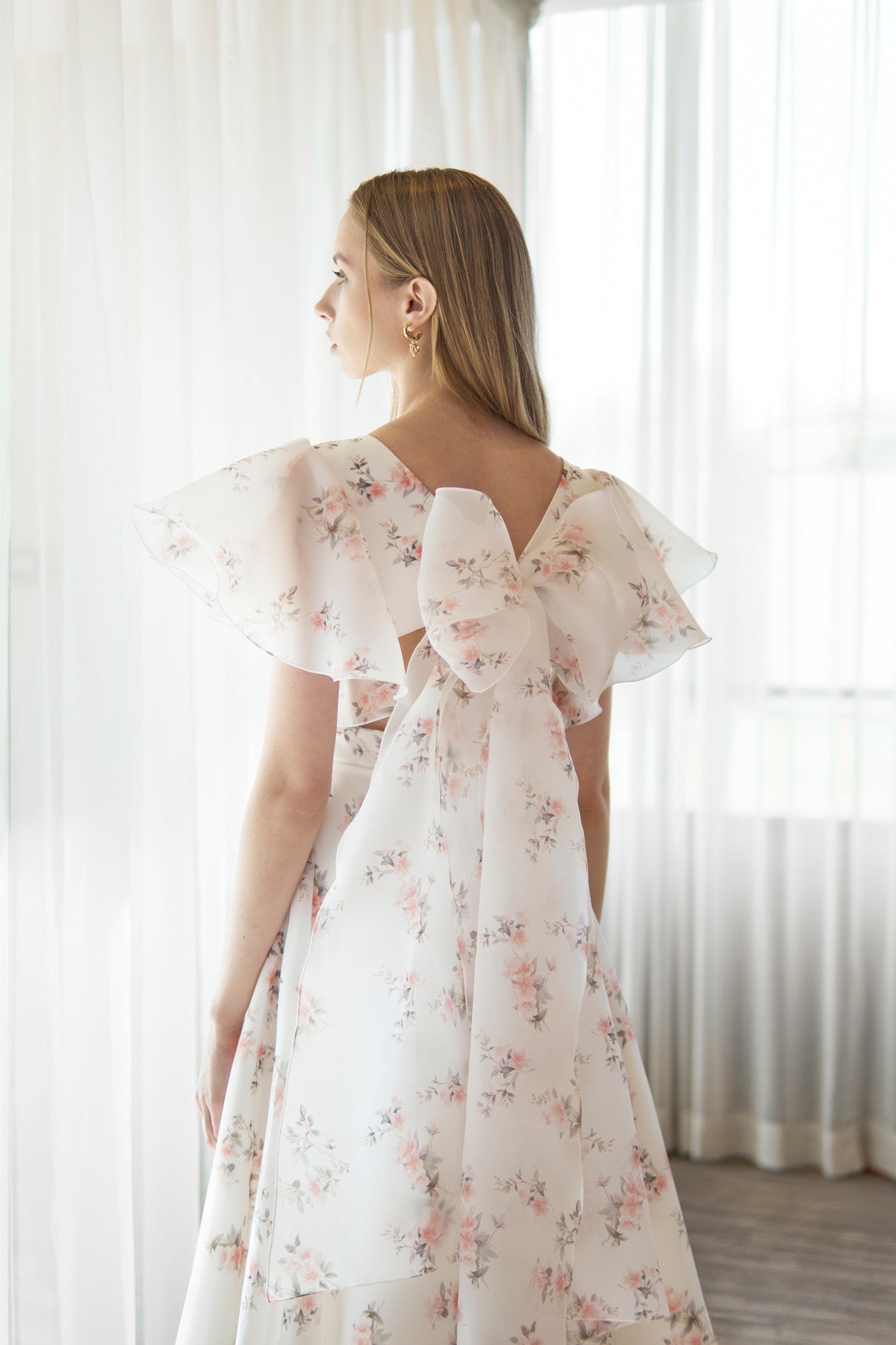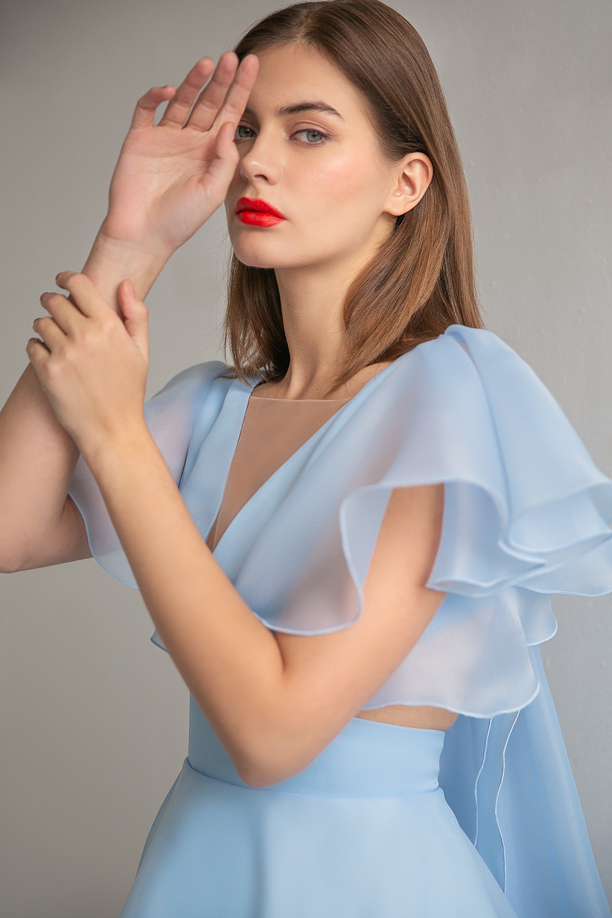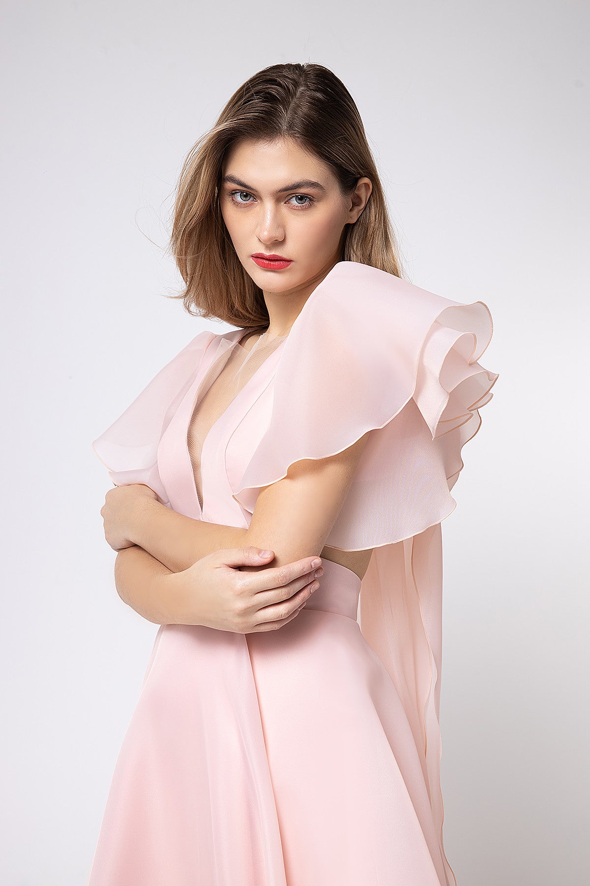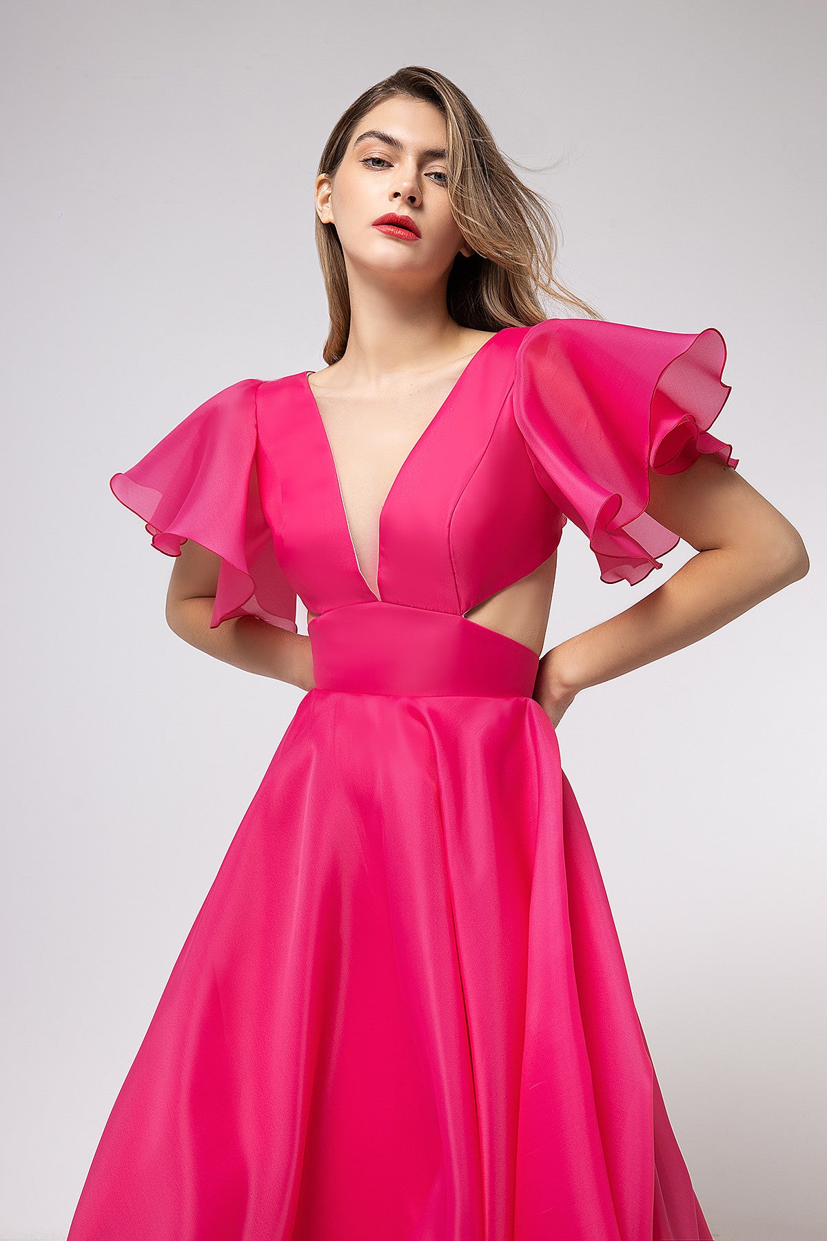 Show off your curves in a romantic evening dress made of lightweight organza fabric. A tea-length dress expresses your elegance, with clear and graphic lines intertwining in the bodice and soft, flowing flounces on the sleeves. The plunging illusion neckline emphasizes the chest, while the curled neckline at the back flows down to the front, revealing the body. At the back, the bodice is held in place by long ties at shoulder level, and the dress is completed with a wide, figure-hugging belt.