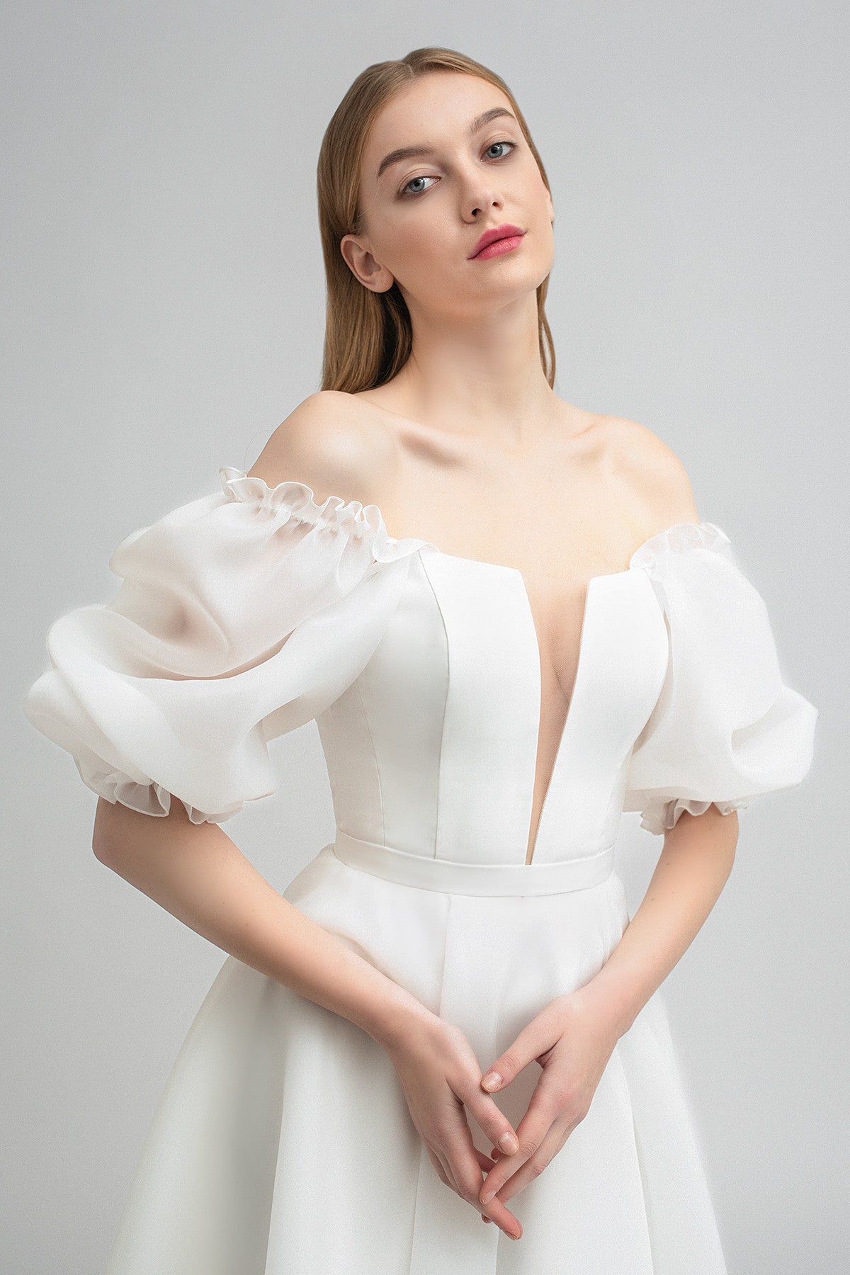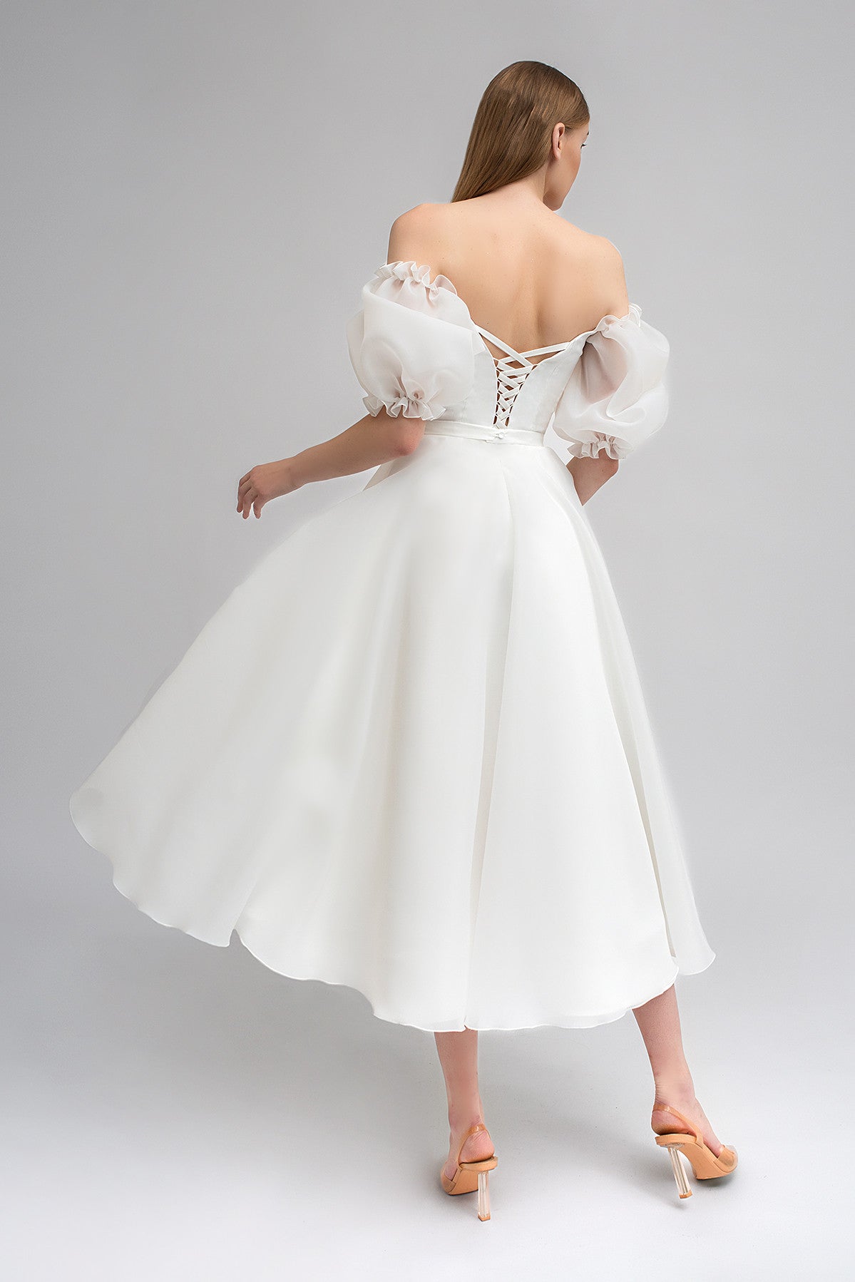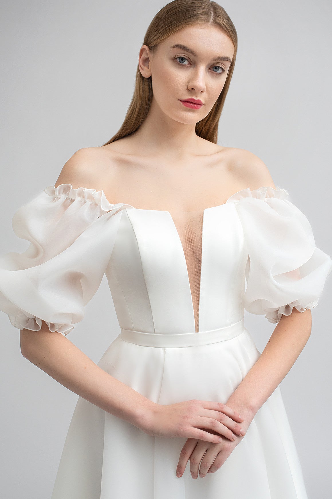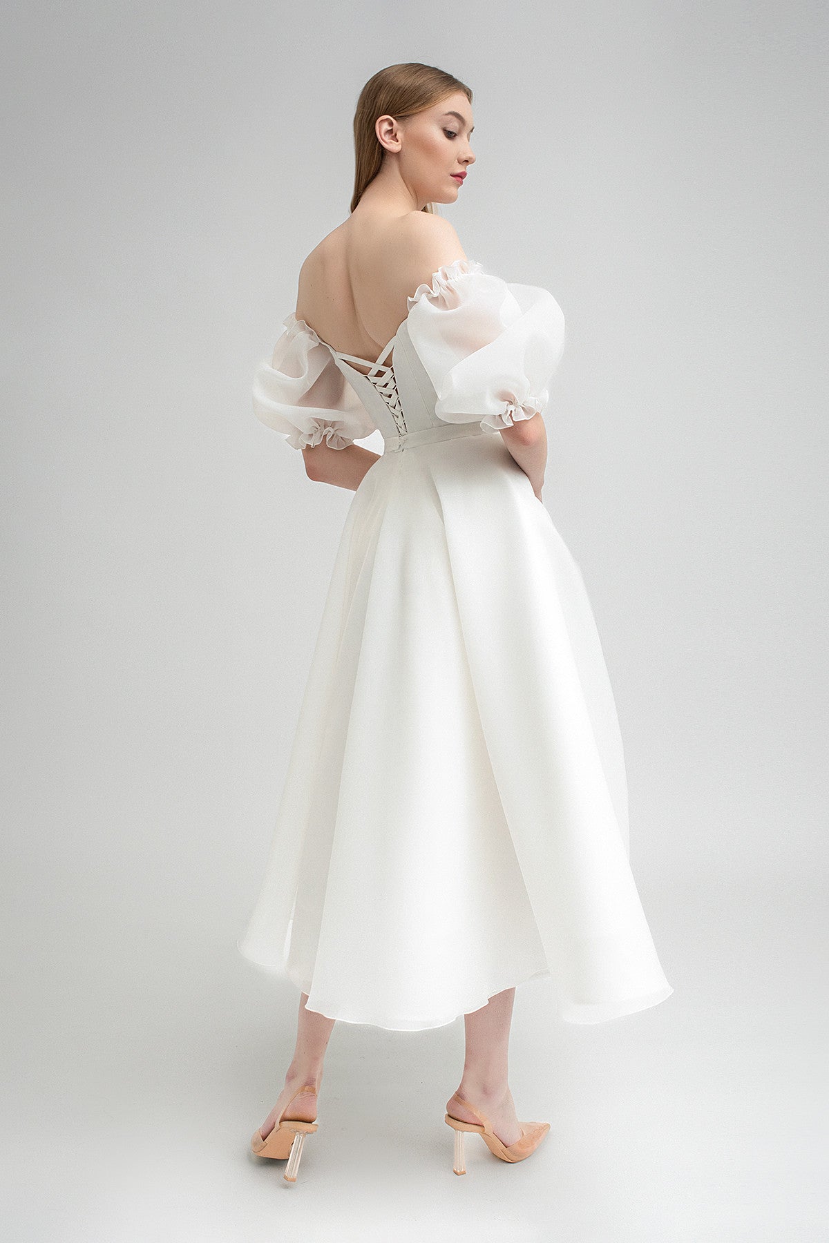 Organza Plunge Neck Midi Wedding Dress Katarina With Puffy Sleeves