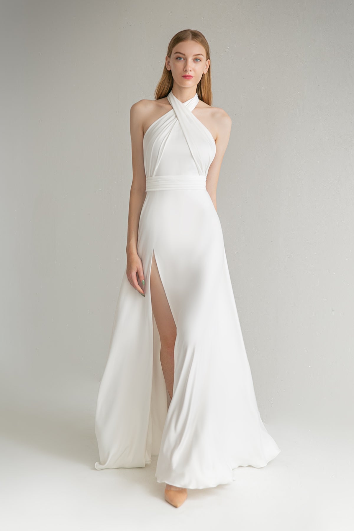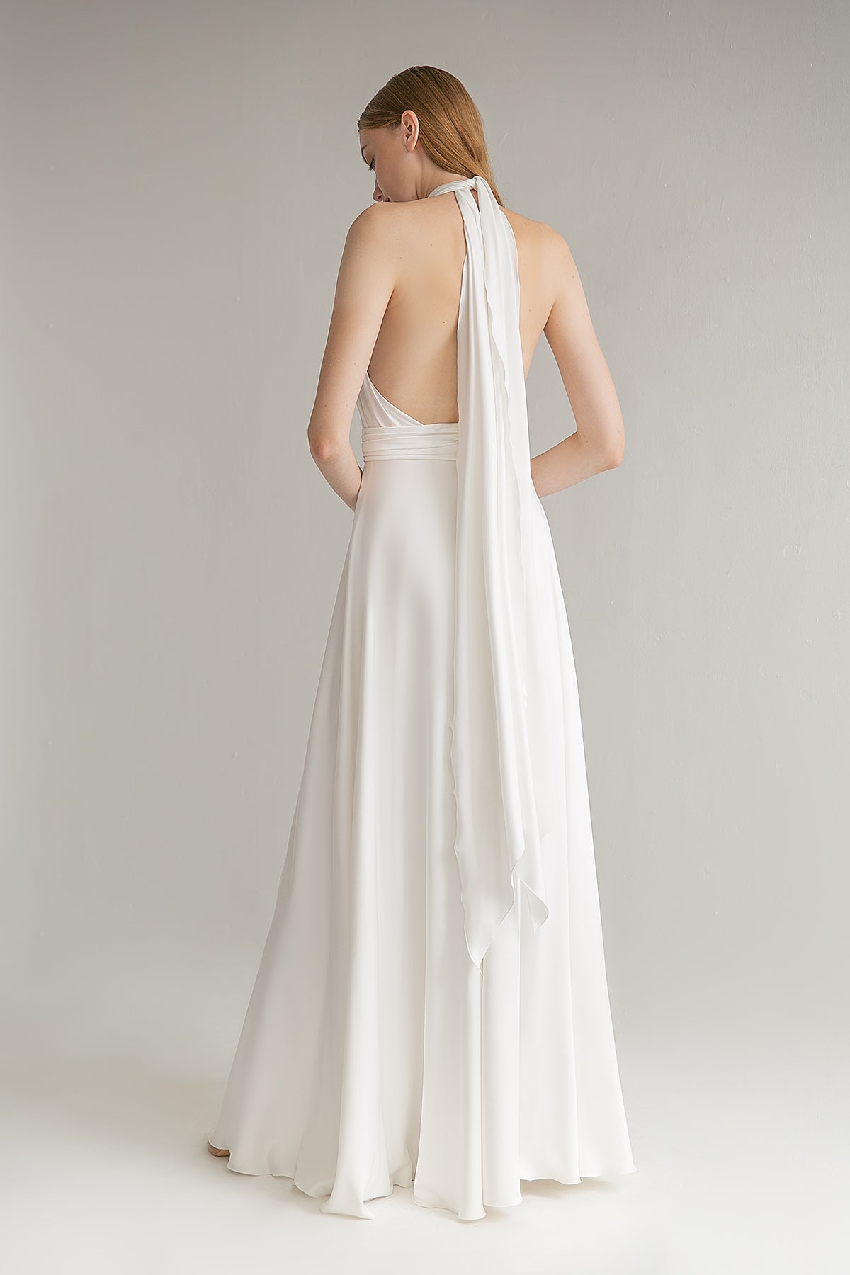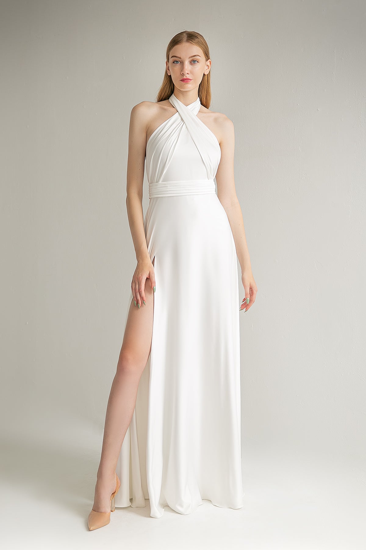 A silk infinity dress with a draped top and a long skirt with a high slit. The neckline and back are open, giving it a modern and seductive look. It comes in a variety of colors, and you can tie the long, wide straps in different ways to create different styles. This makes the dress versatile and always on trend.