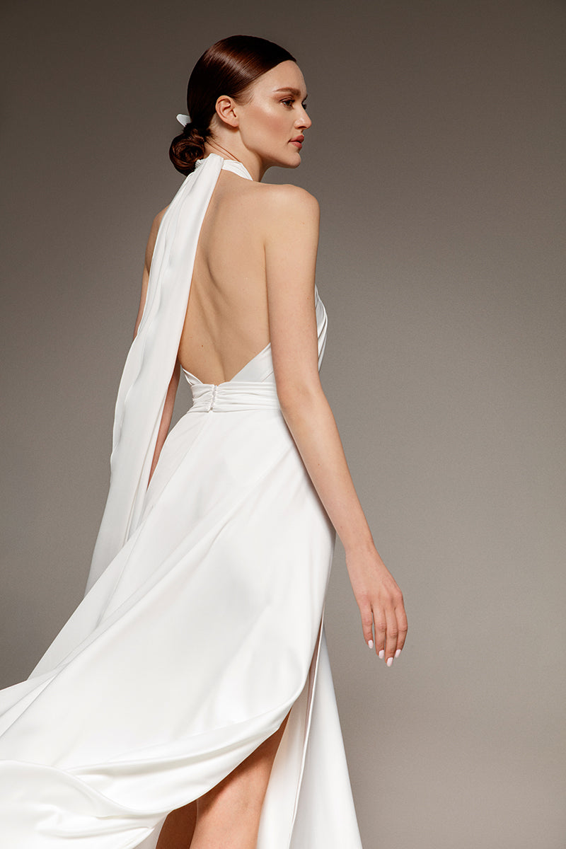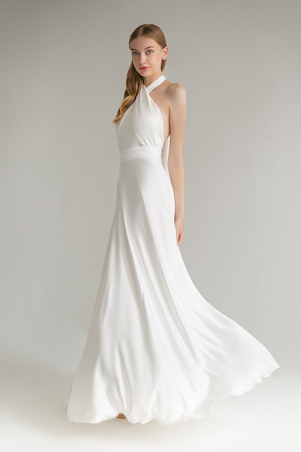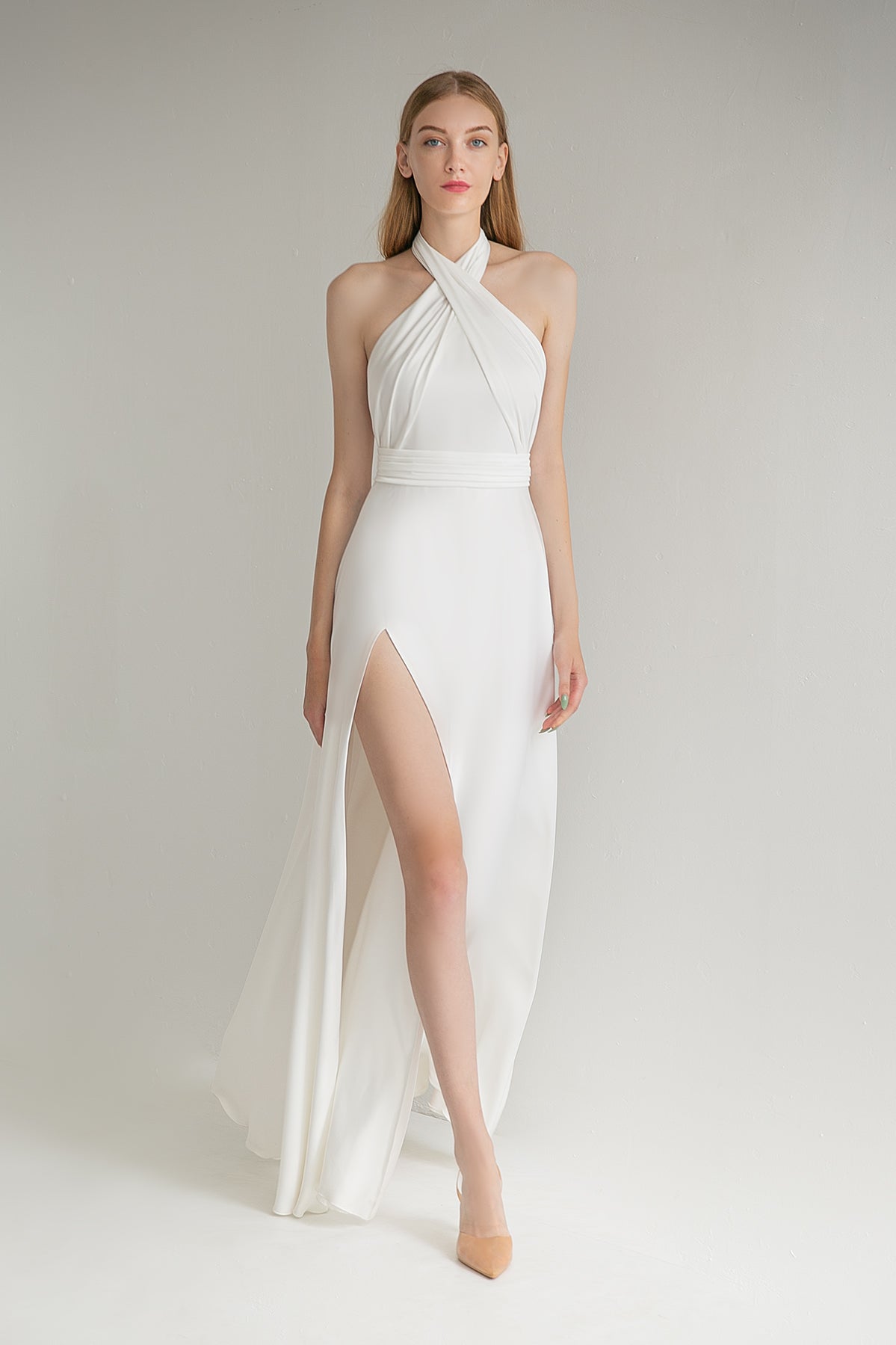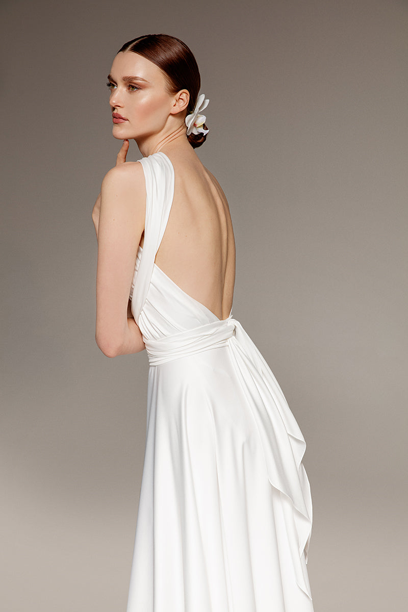 A silk infinity dress with a draped top and a long skirt with a high slit. The neckline and back are open, giving it a modern and seductive look. It comes in a variety of colors, and you can tie the long, wide straps in different ways to create different styles. This makes the dress versatile and always on trend.