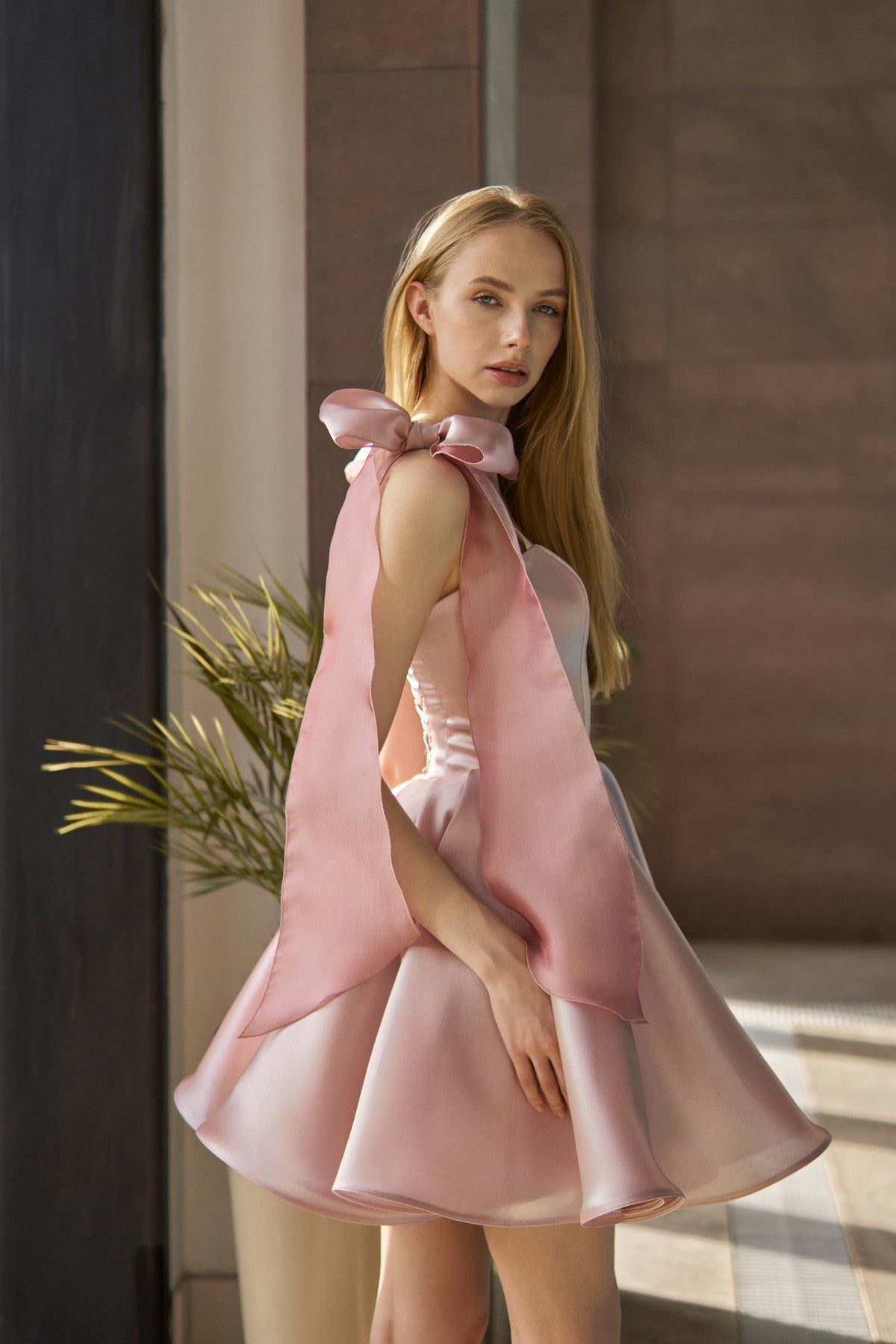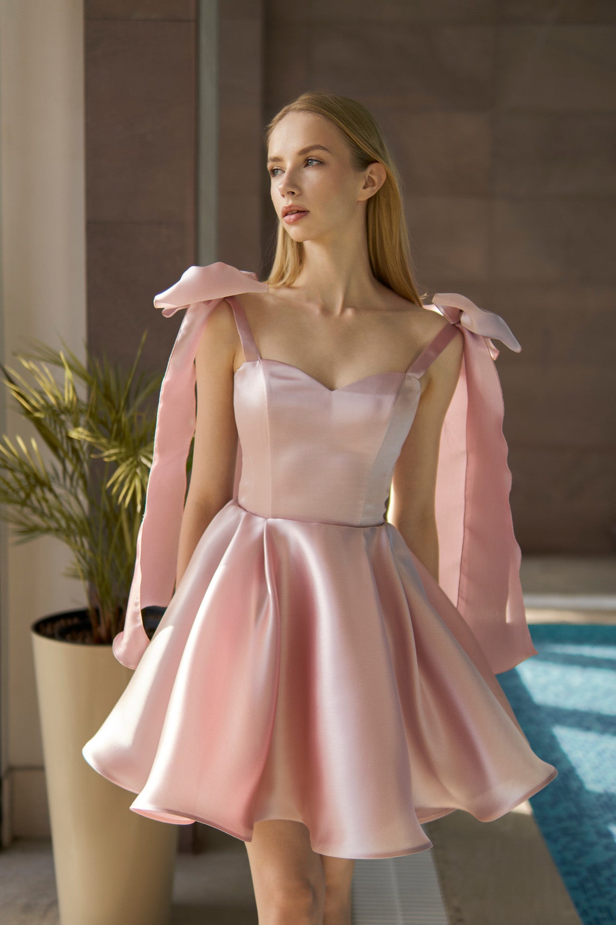 A simple, sweetheart-neckline, organza mini-dress with a full skirt. It's got a shoulder bow and it comes in a pair, so you can add that extra bit of femininity to your wedding look.