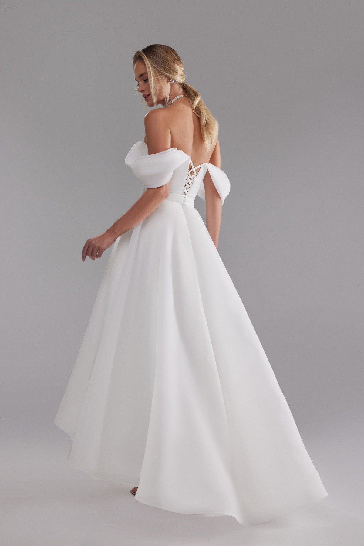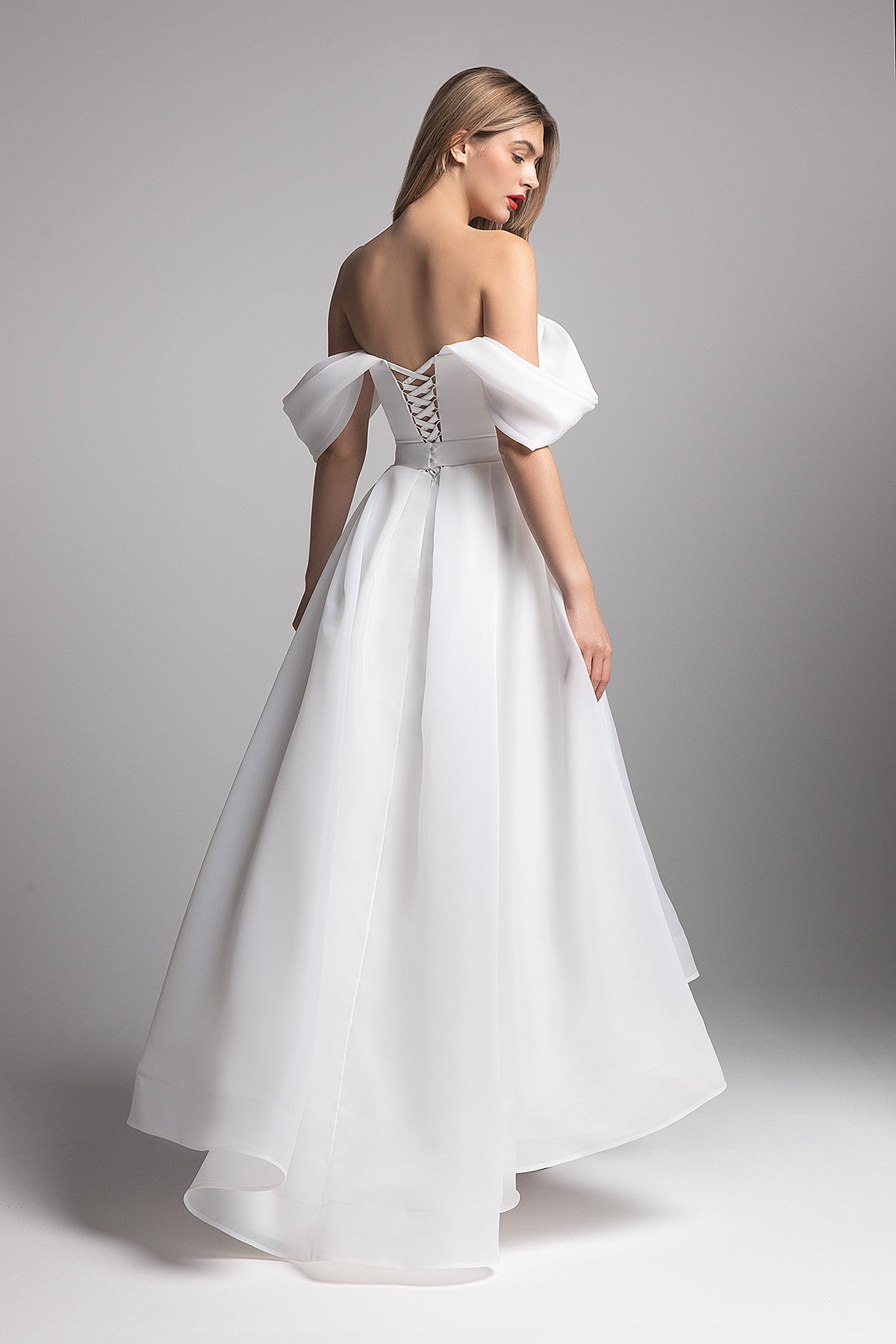A super romantic A-line corset dress made from organza and satin with a full, asymmetrical skirt. The satin corset opens at the heart-shaped neckline, showing off your shoulders. A wide belt hugs your waist, and the dress has cool, draped sleeves that hang down.