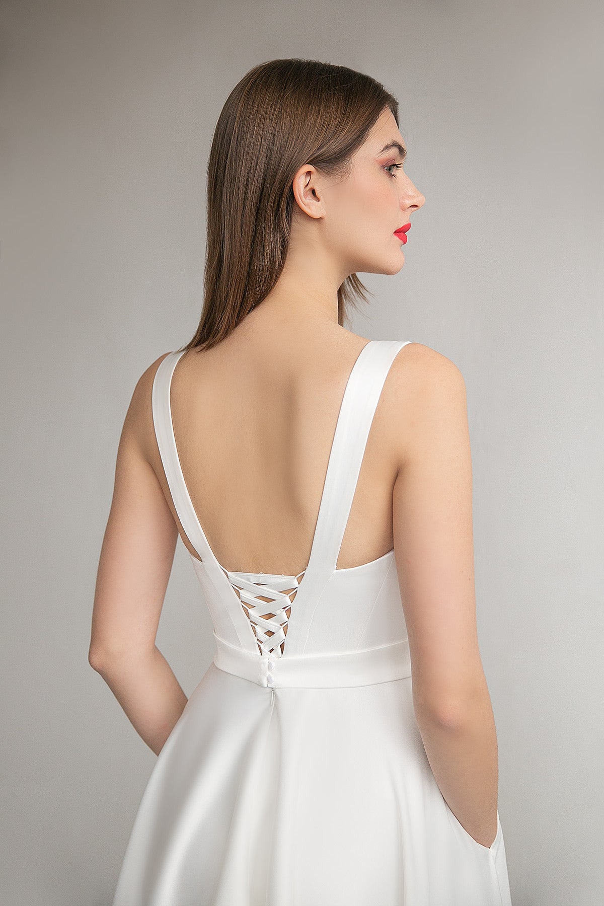 A simple A-line wedding dress, made of stretchy satin with wide straps and a lace-up back. The unique corset design flatters your figure, accentuating your chest and making it suitable for all body types, from standard sizes to plus sizes. The skirt length is perfect for any occasion, from a wedding to a party, and it's tea length.