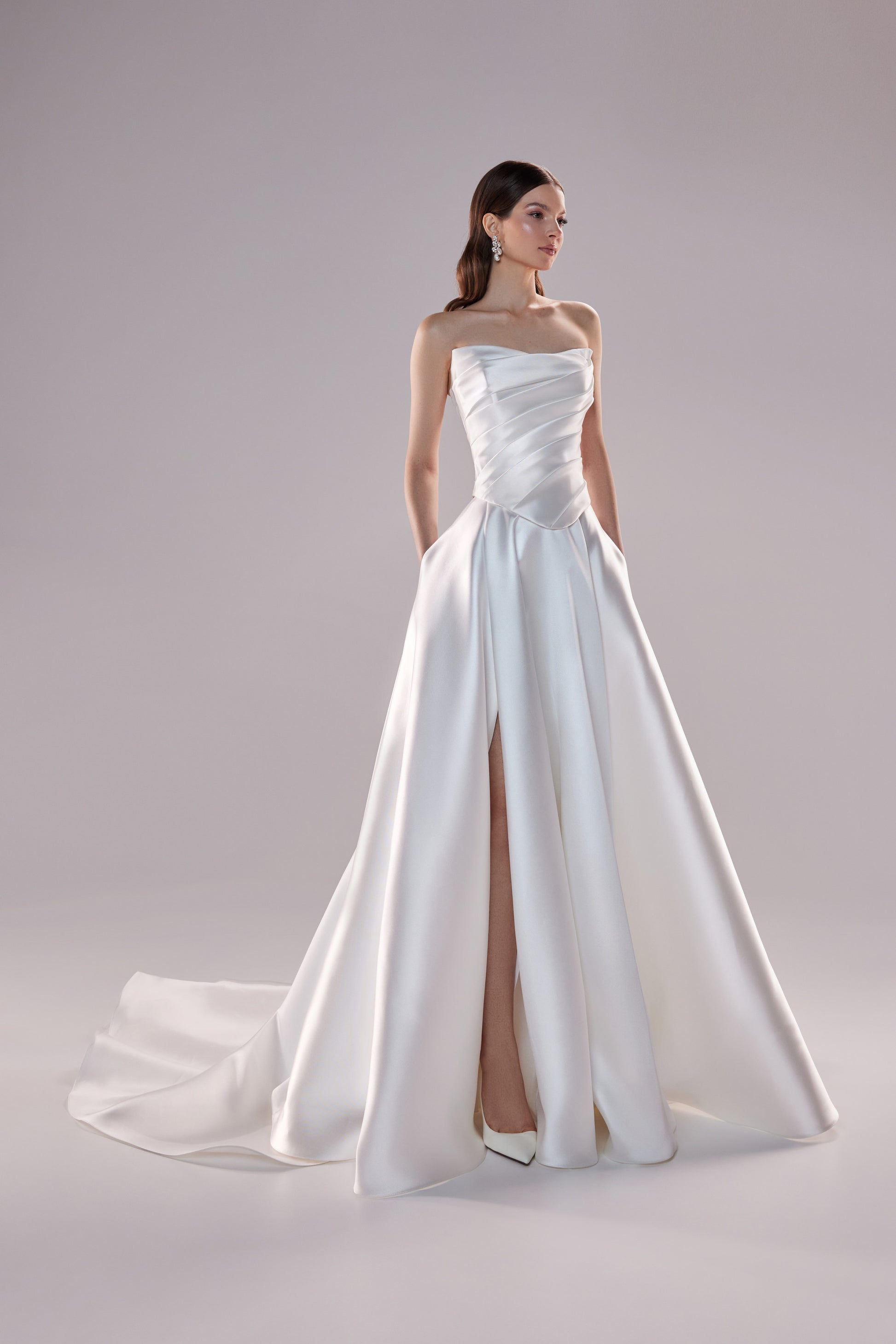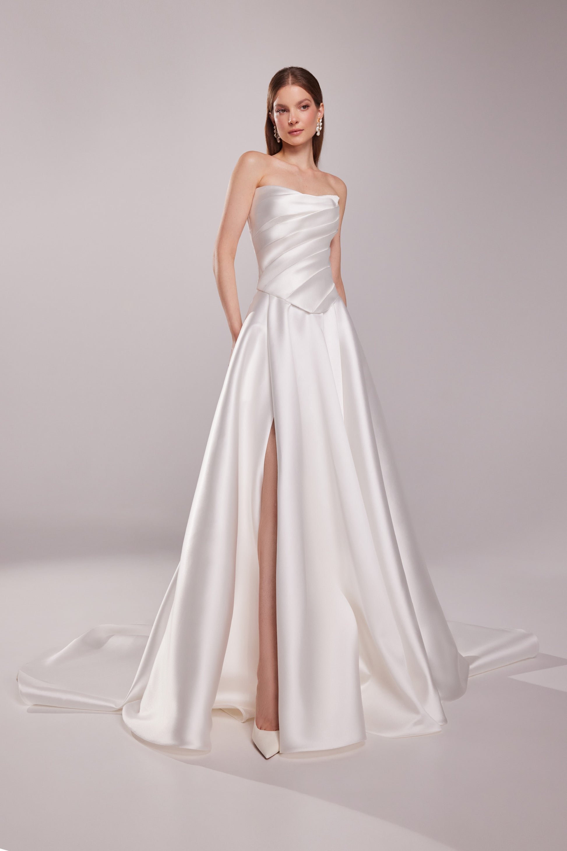 When paired with a flowing satin skirt, Tori looks stunning with every move. The smooth and luminous satin fabric gives a polished and elegant look that's both modern and timeless, making it perfect for brides who want a sleek alternative to traditional dresses. The two-piece design allows for easy styling, perfect for going from ceremony to reception or for creating different bridal looks.