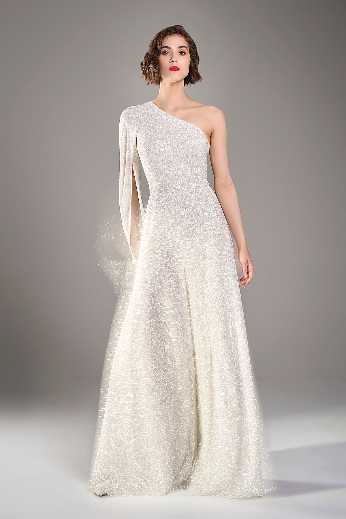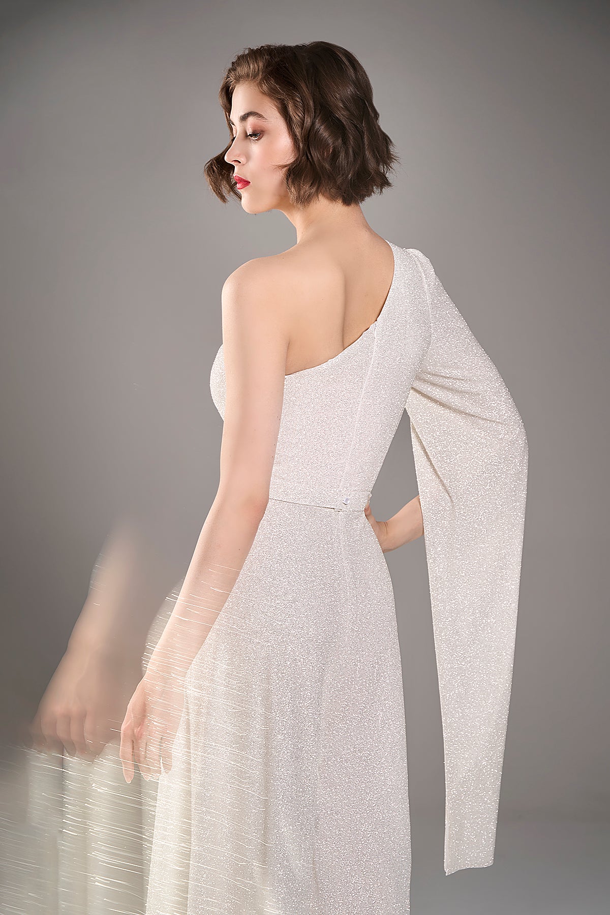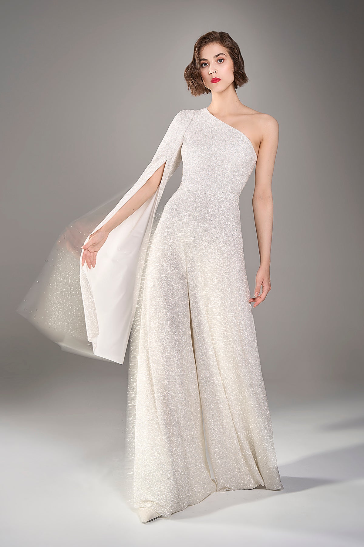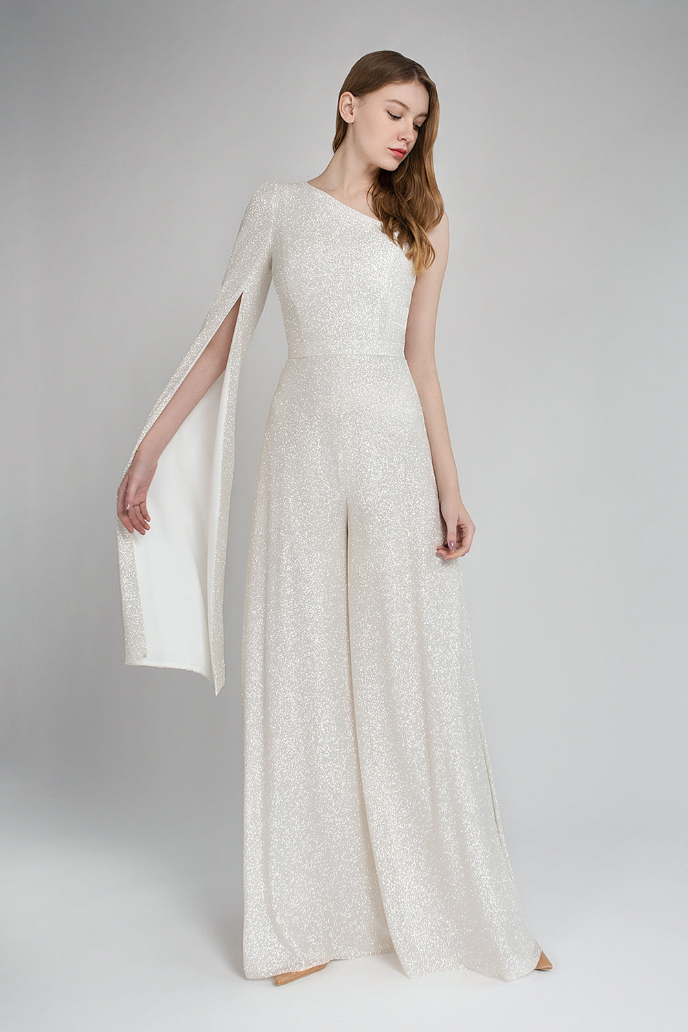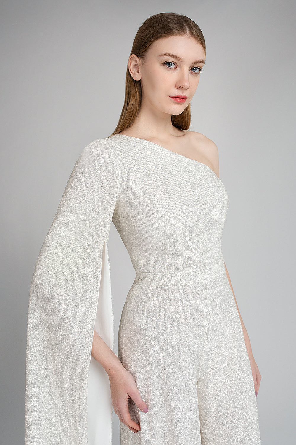Sparkly Bridal One Shoulder Jumpsuit With Cape Sleeve Siera