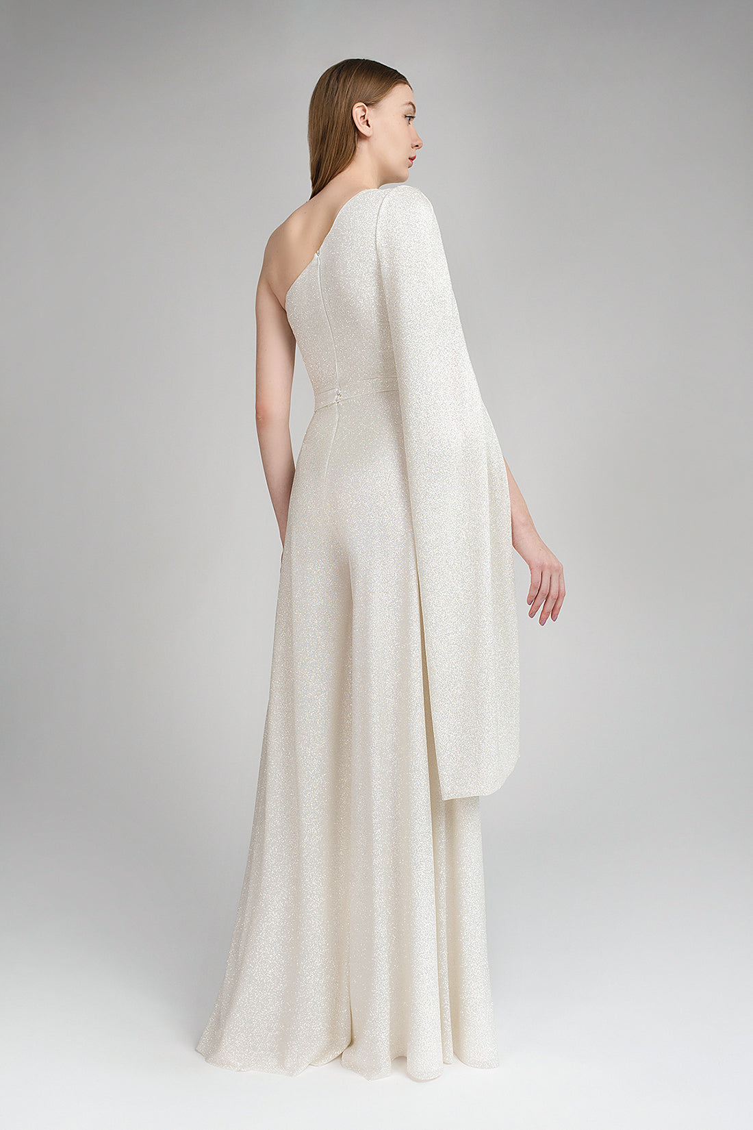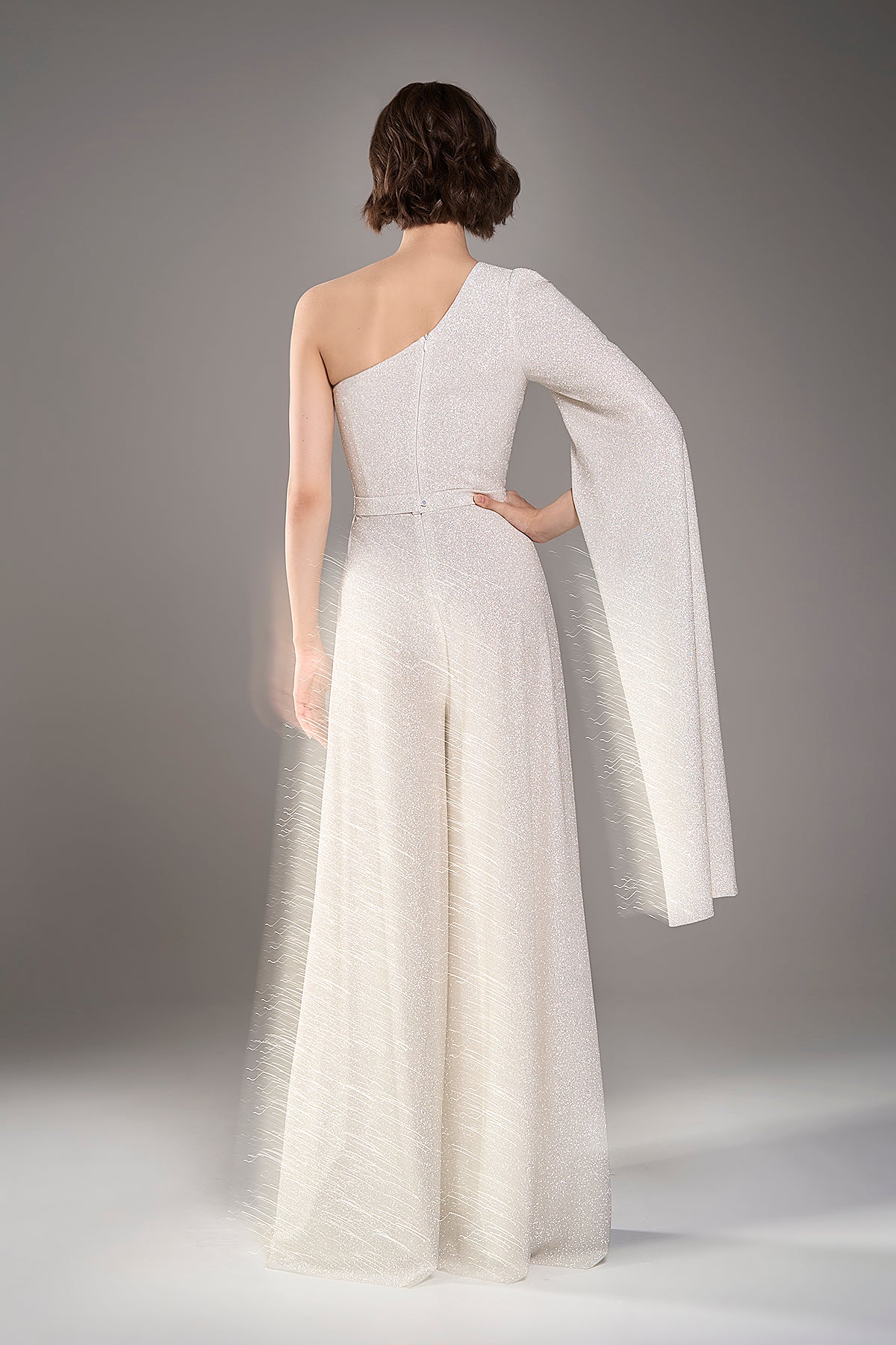 Elegant jumpsuit made of stretch glitter fabric with long palazzo pants and an asymmetric bodice which opens at the shoulder. A long cape sleeve adds a spectacular accent to the jumpsuit.