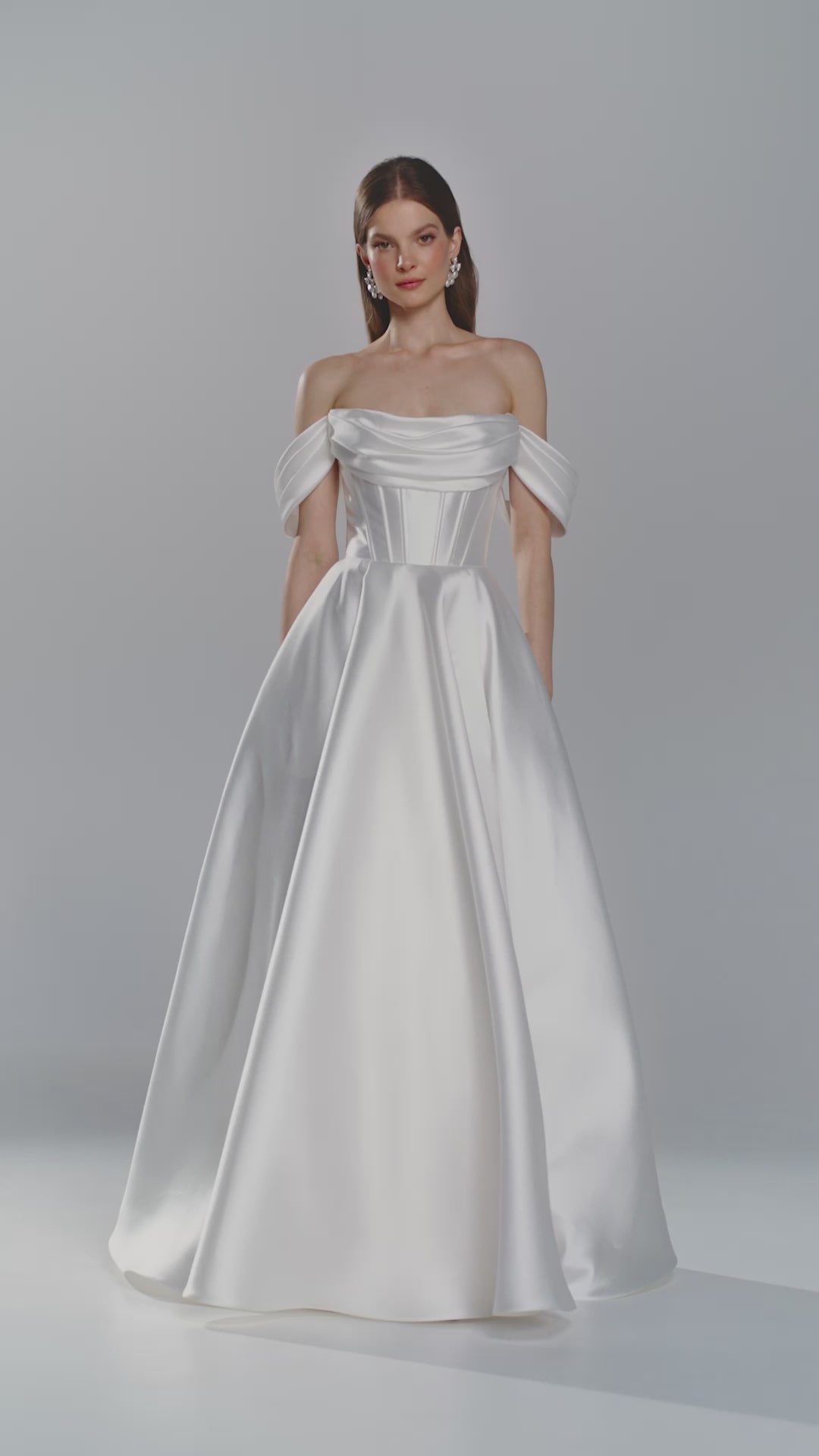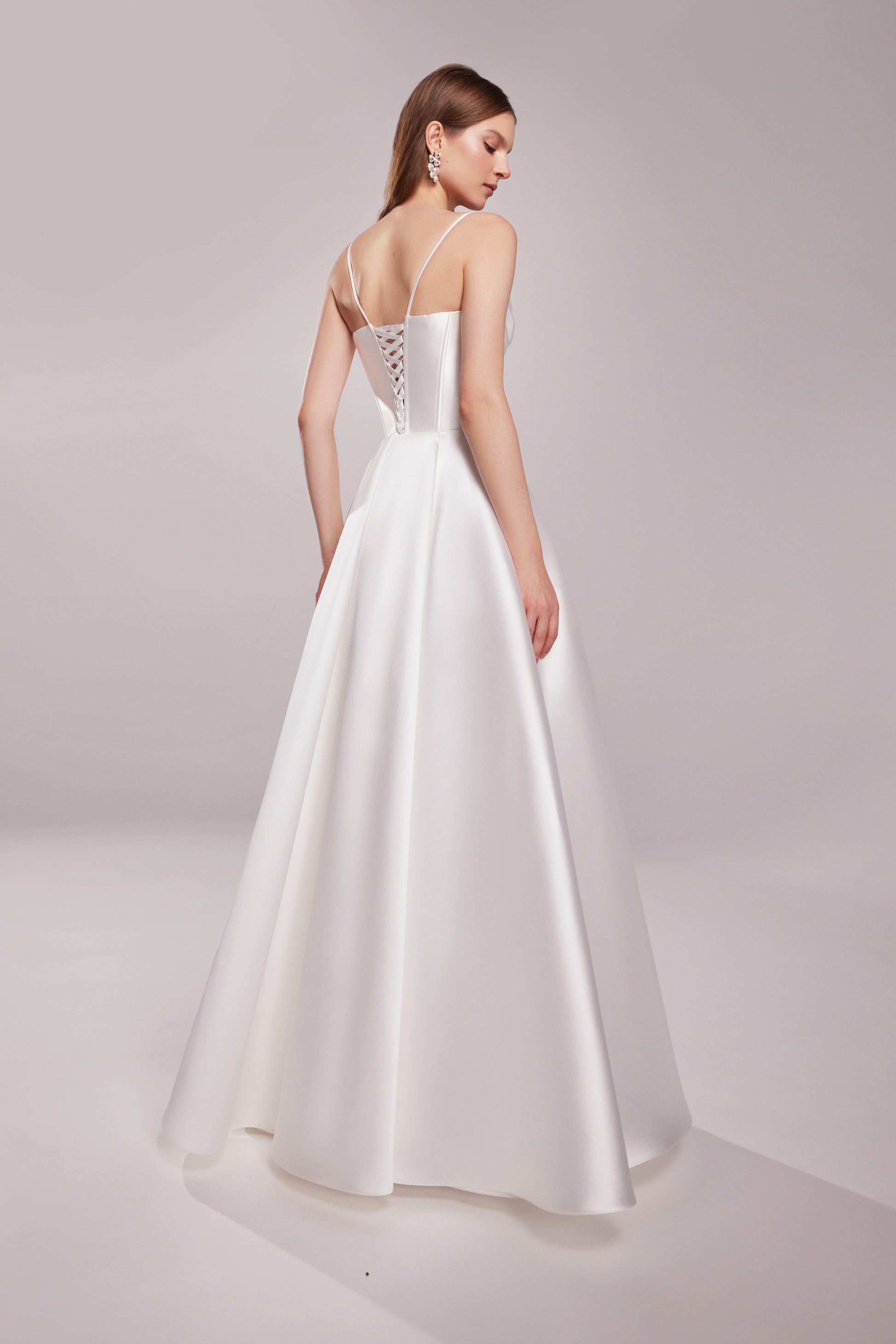 Embrace modern elegance in this stunning white wedding gown. The bodice is structured with delicate boning, creating a graceful neckline that combines architectural precision with a touch of romance. The fitted top flows into a flowing A-line skirt, with a daring front slit for easy movement and a hint of sensuality. Made from luxurious mikado fabric, this dress flatters your figure and ensures comfort. Off-shoulder straps add a touch of delicacy.