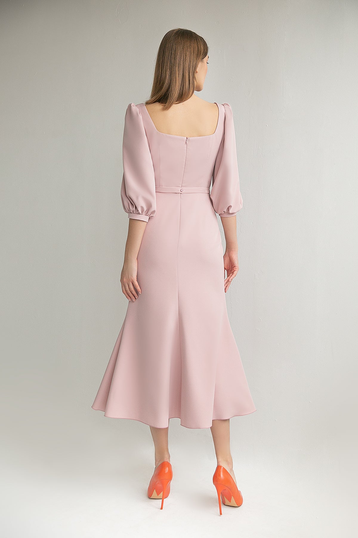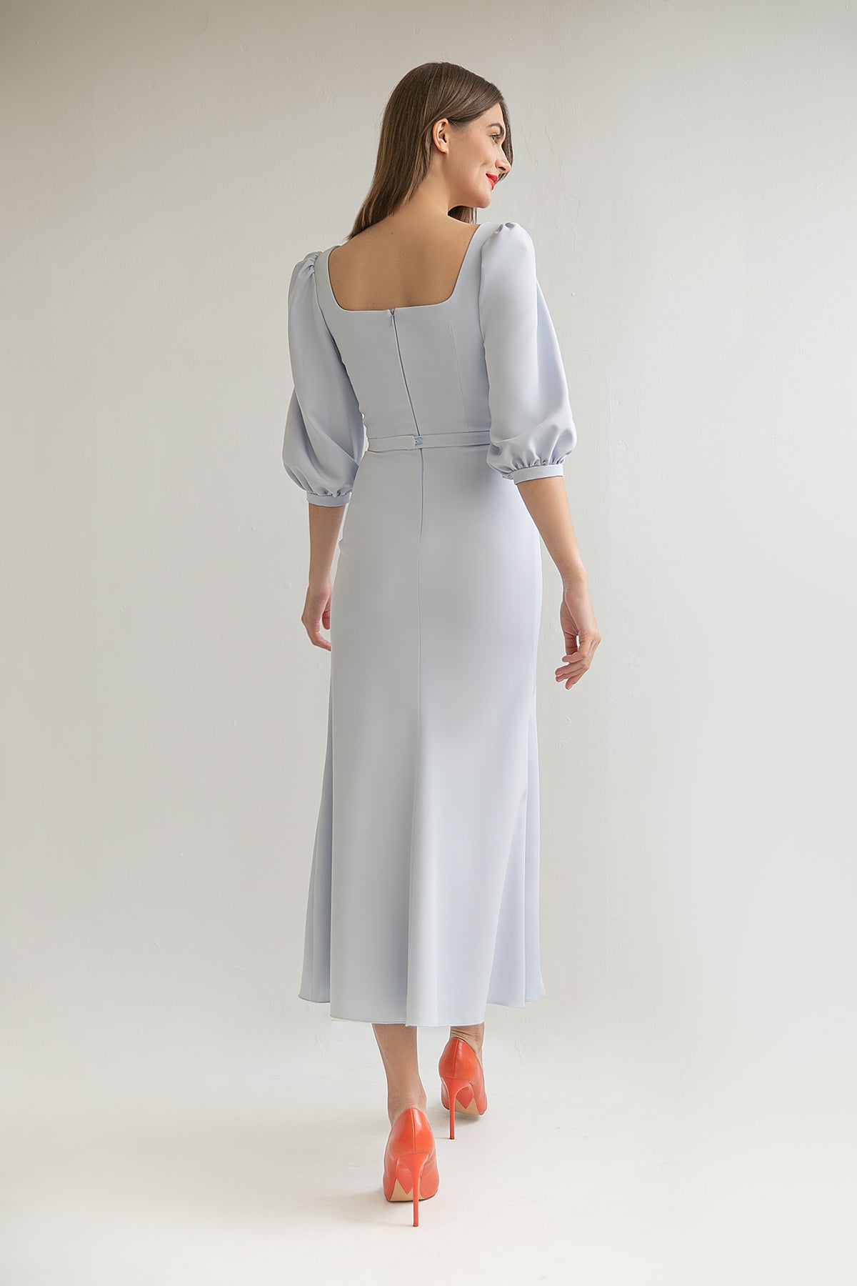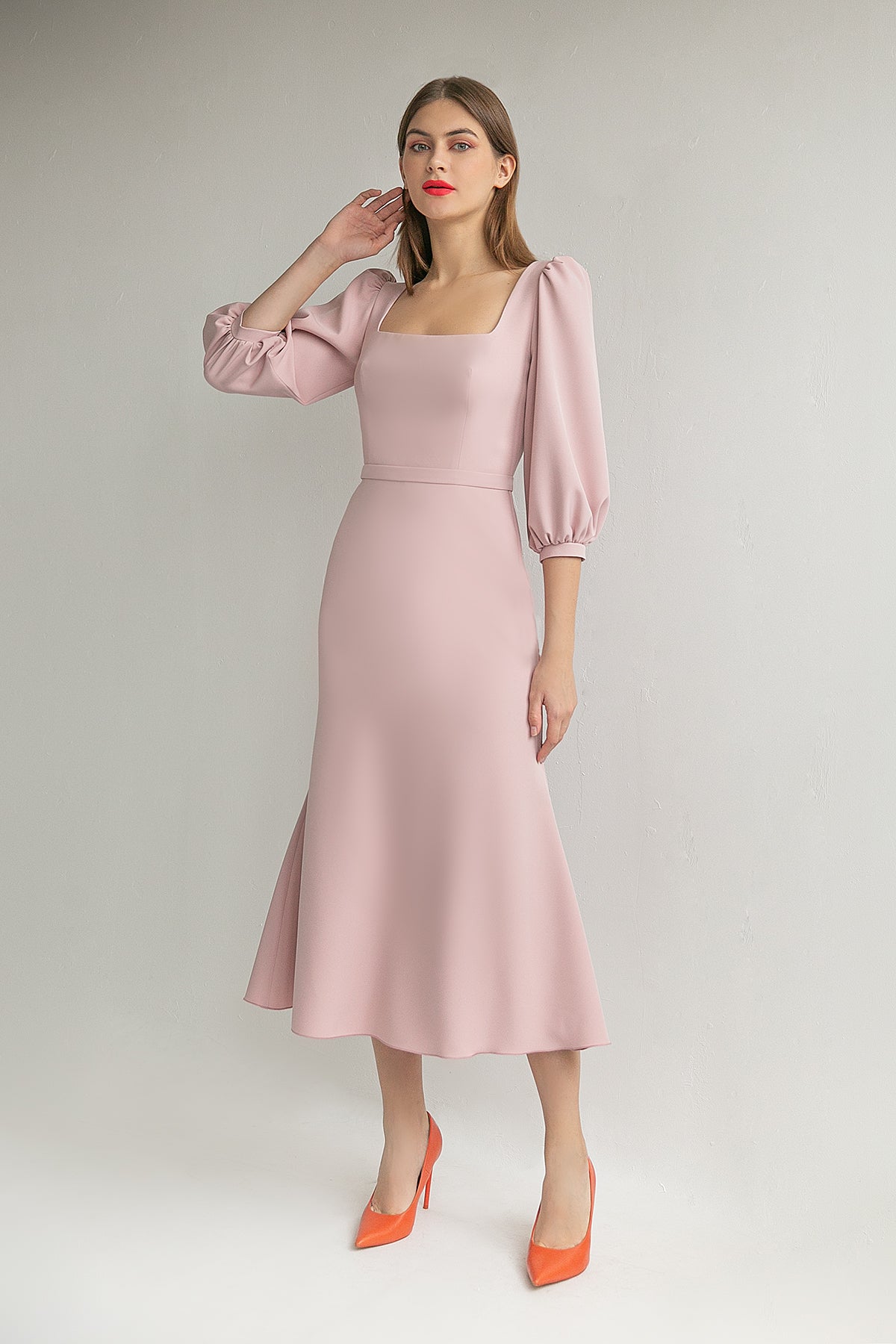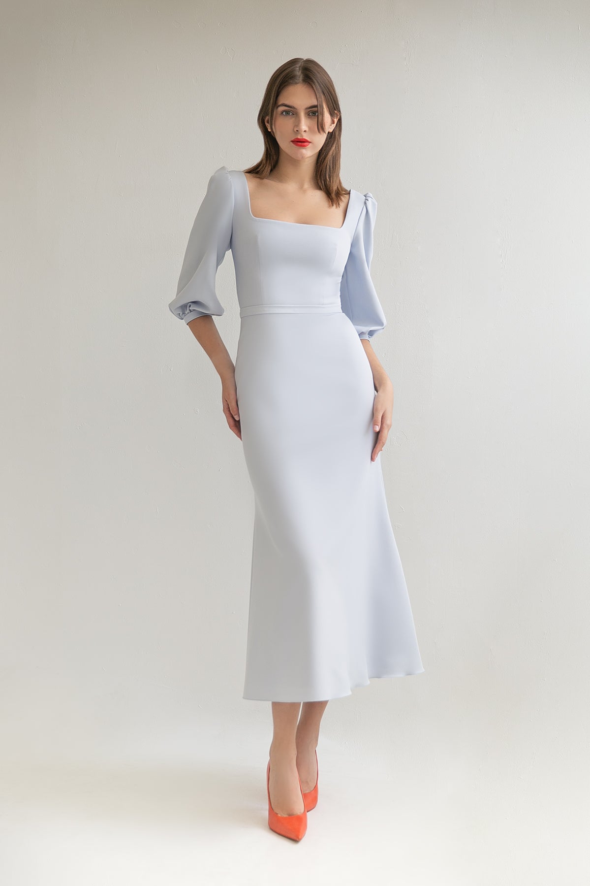 This formal dress features a sophisticated pairing of square neckline and bishop sleeves, as well as a fit & flare skirt of tea length. In timeless luxe neutral shades, this style will live in your closet for years to come and look gorgeous every time. Our elegant and simple evening dress is the perfect choice for brides who want a modest and minimalistic dress.