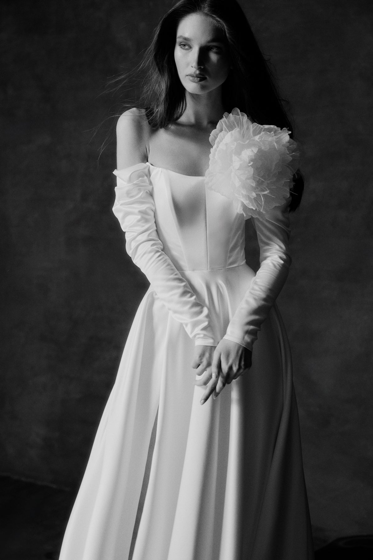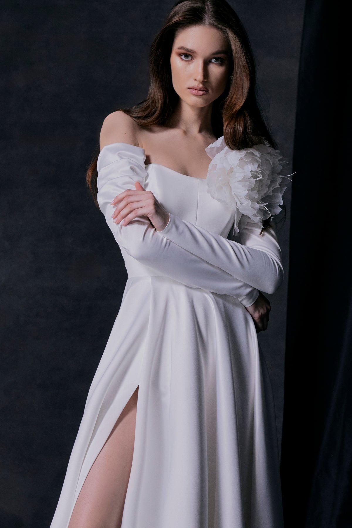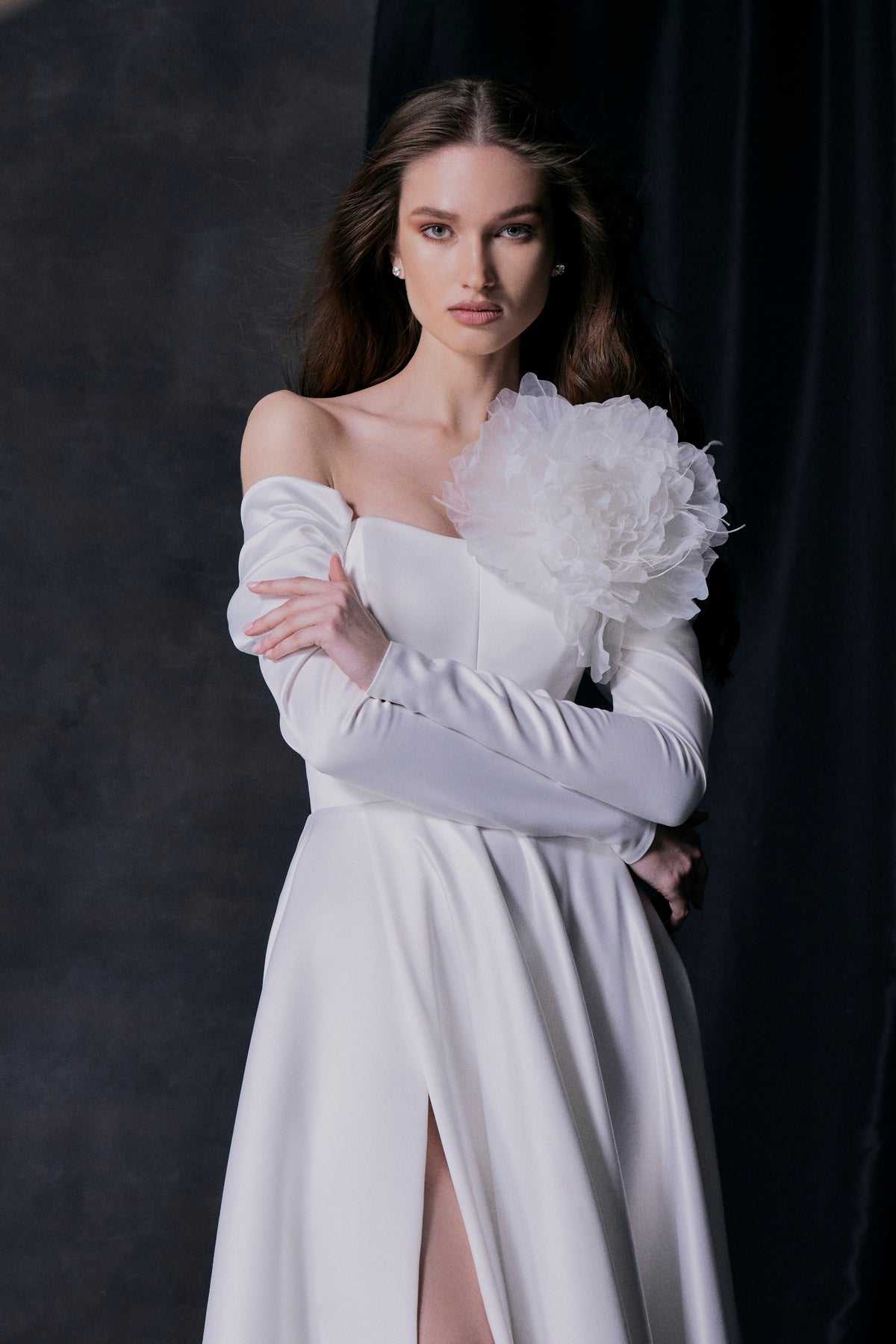 A romantic A-line satin corset dress with a long, puffy skirt with pockets and a high front slit. The top part has a corset-style bodice with princess-seam detailing, off-the-shoulder neckline, and sleeves that flow and drape, teasingly revealing some skin. The most eye-catching part of the dress is handmade brooch shaped like peony.