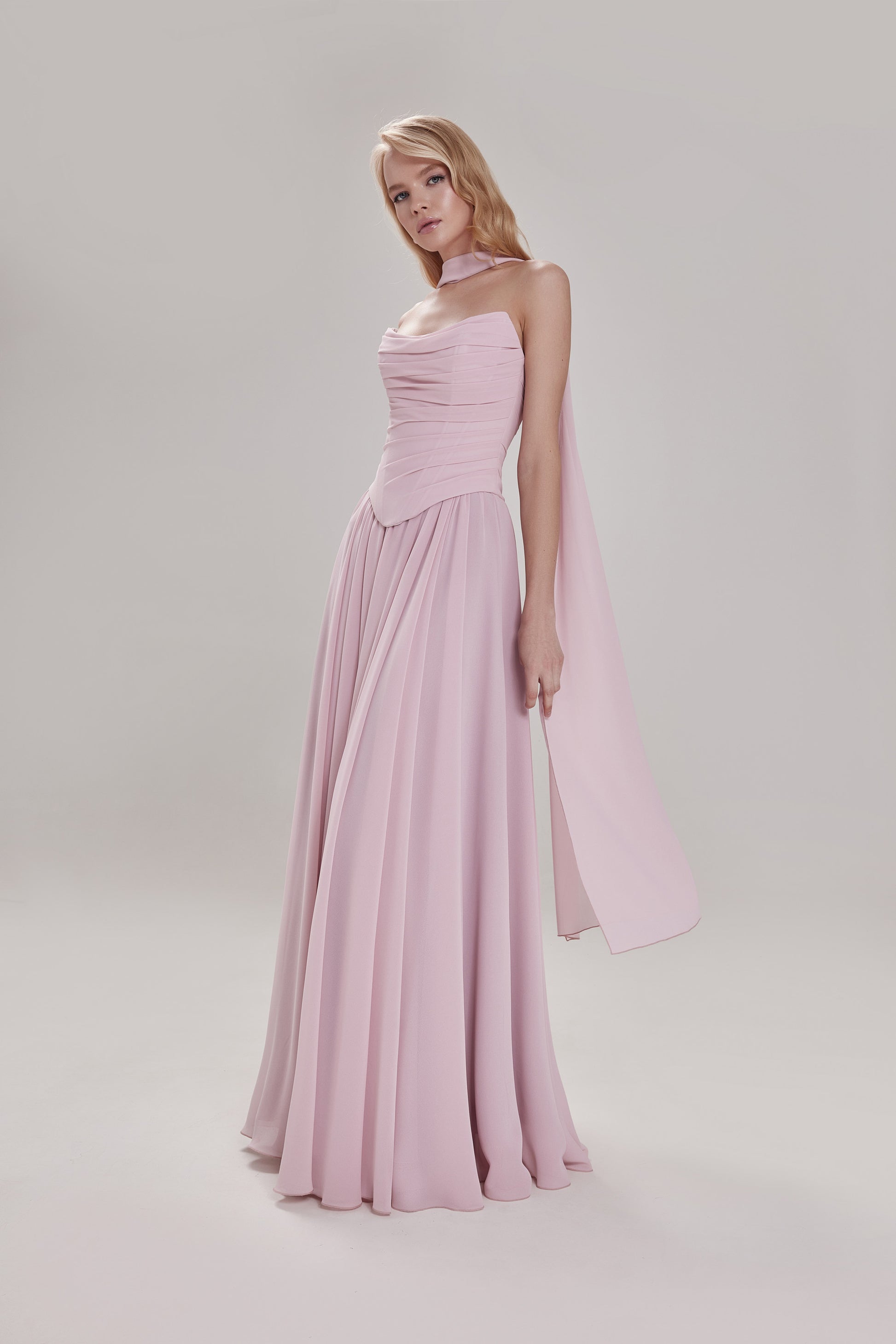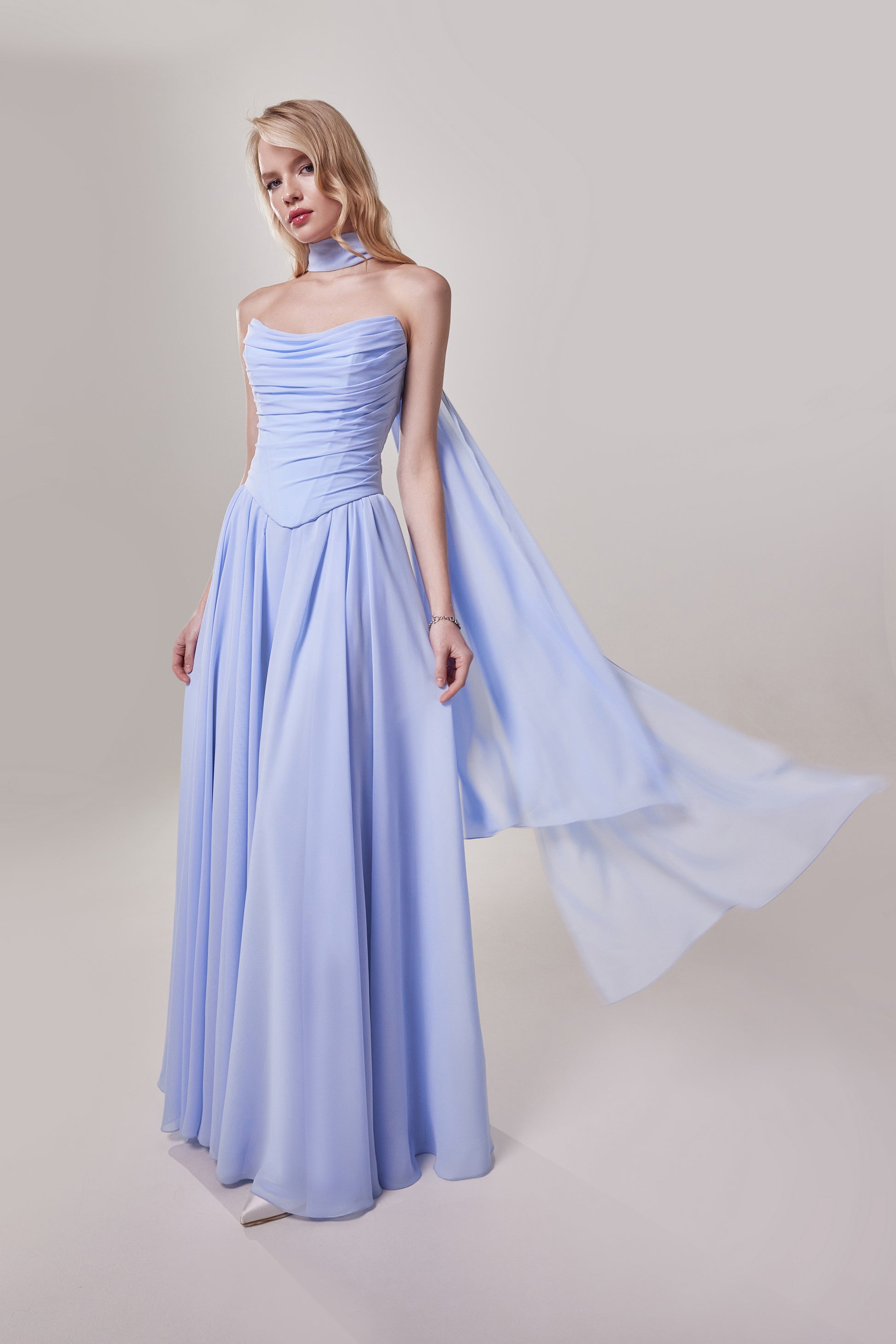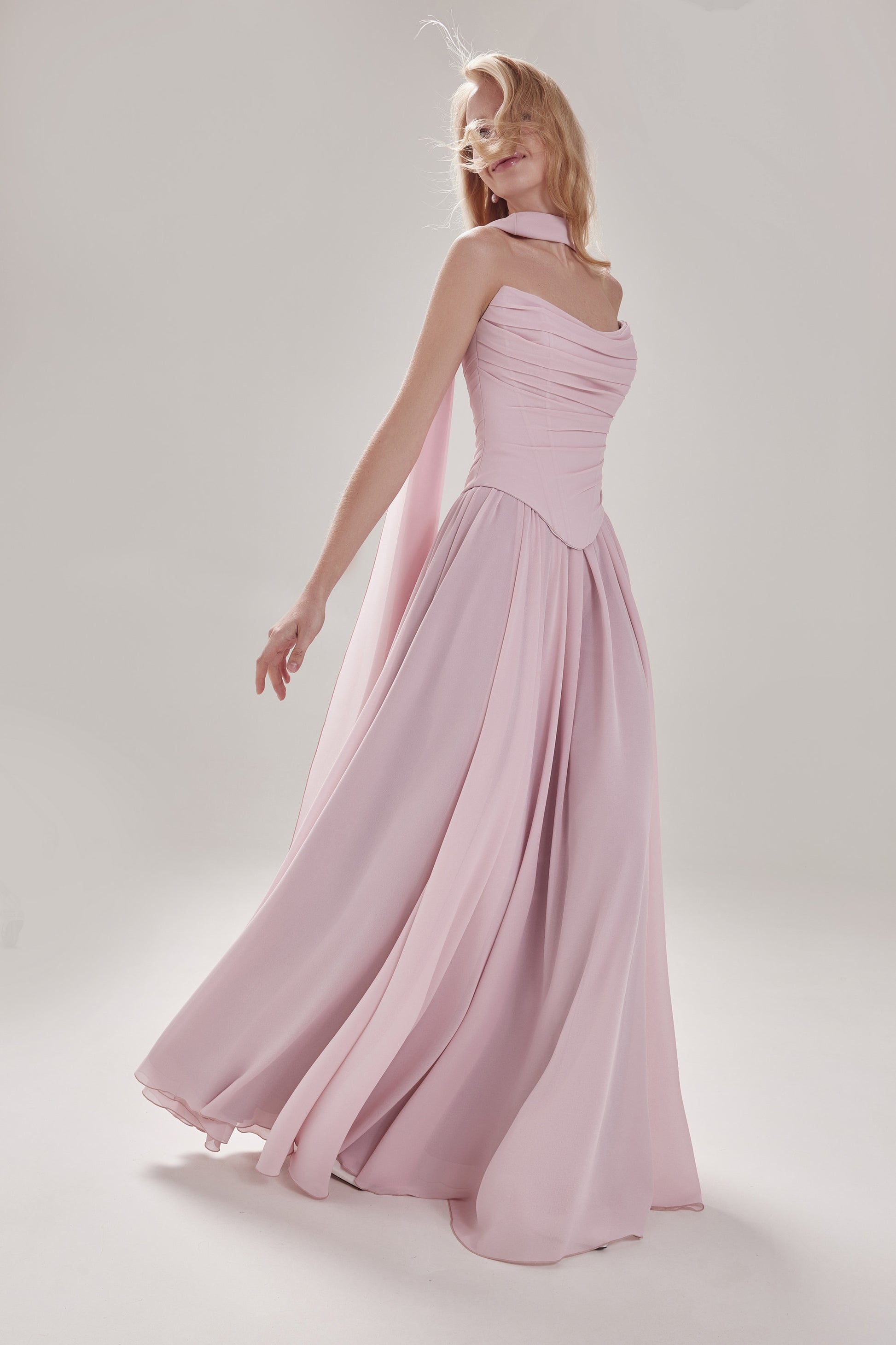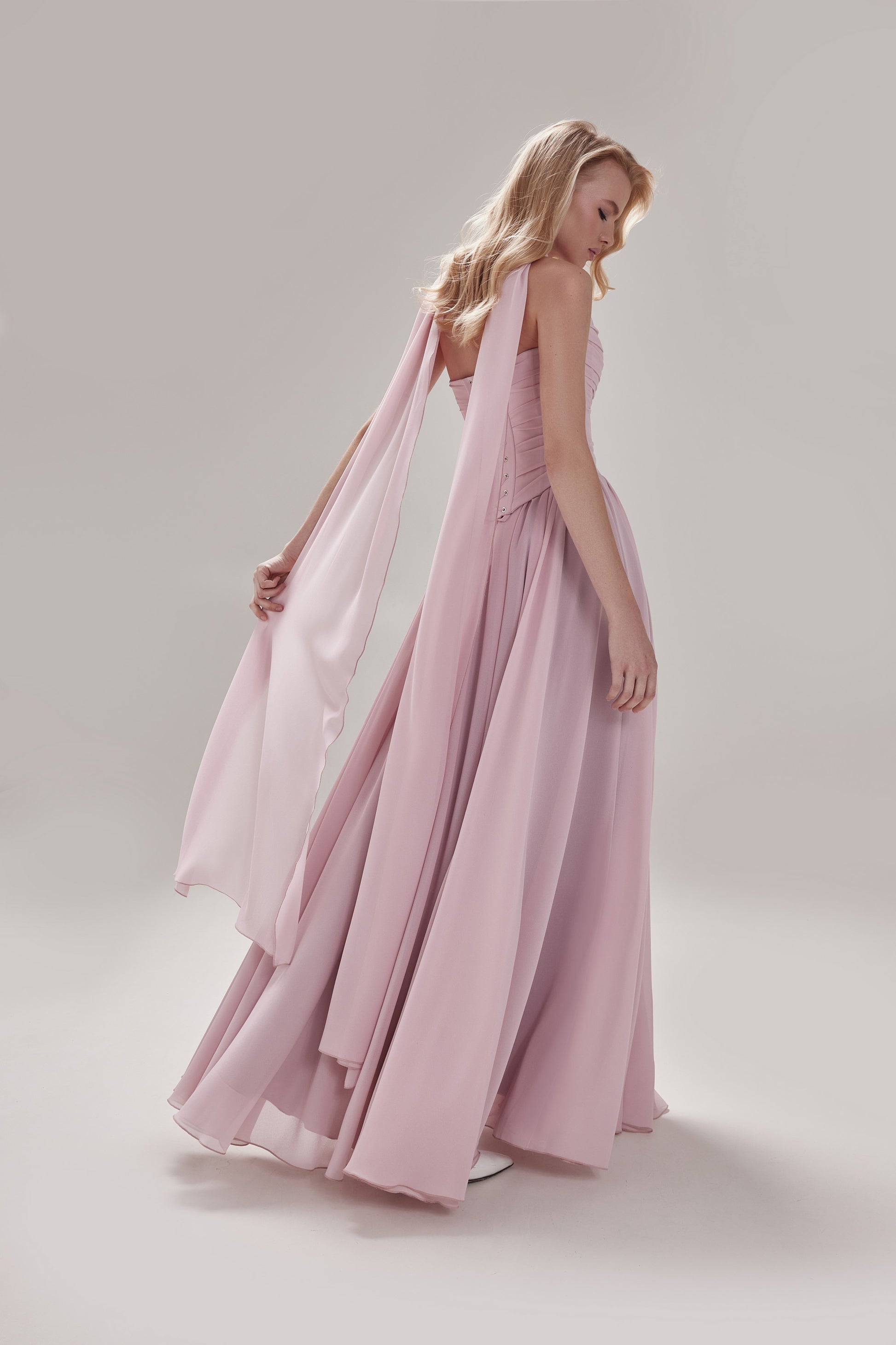 Crystal is a romantic chiffon wedding dress that's perfect for brides who want a modern, clean look with effortless movement. It's strapless and has a minimalist corset design. The soft draping on the bodice hugs the torso, and the lace-up back gives you a fit that's comfortable and supportive. The ethereal chiffon skirt effortlessly flows from the corset, creating a sophisticated and elegant bridal look without any heaviness.