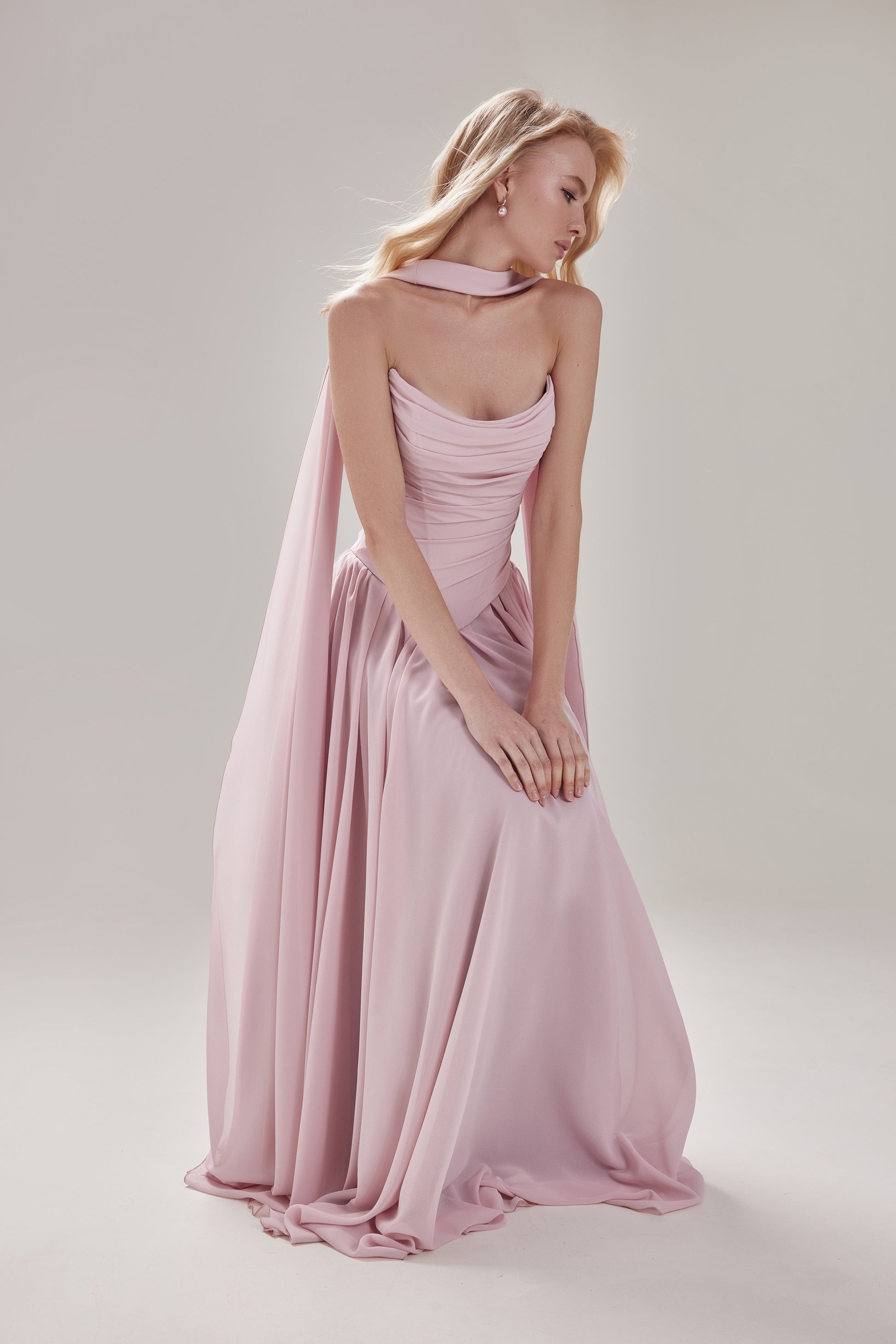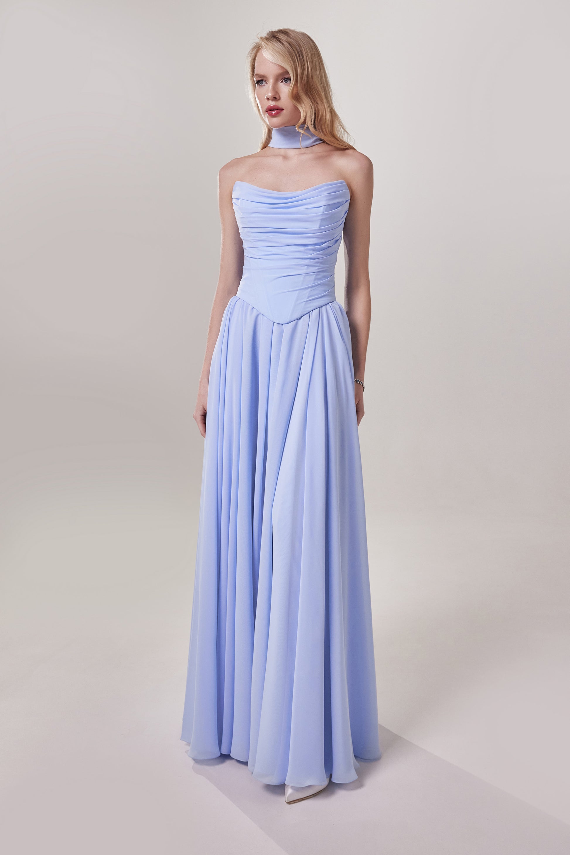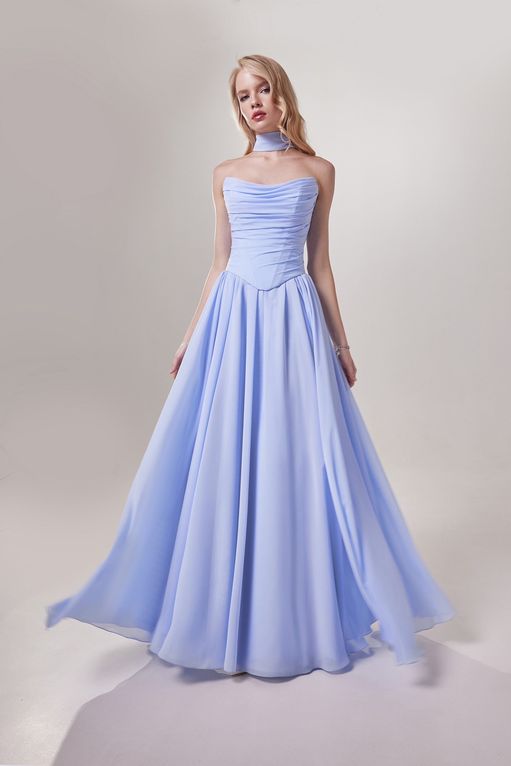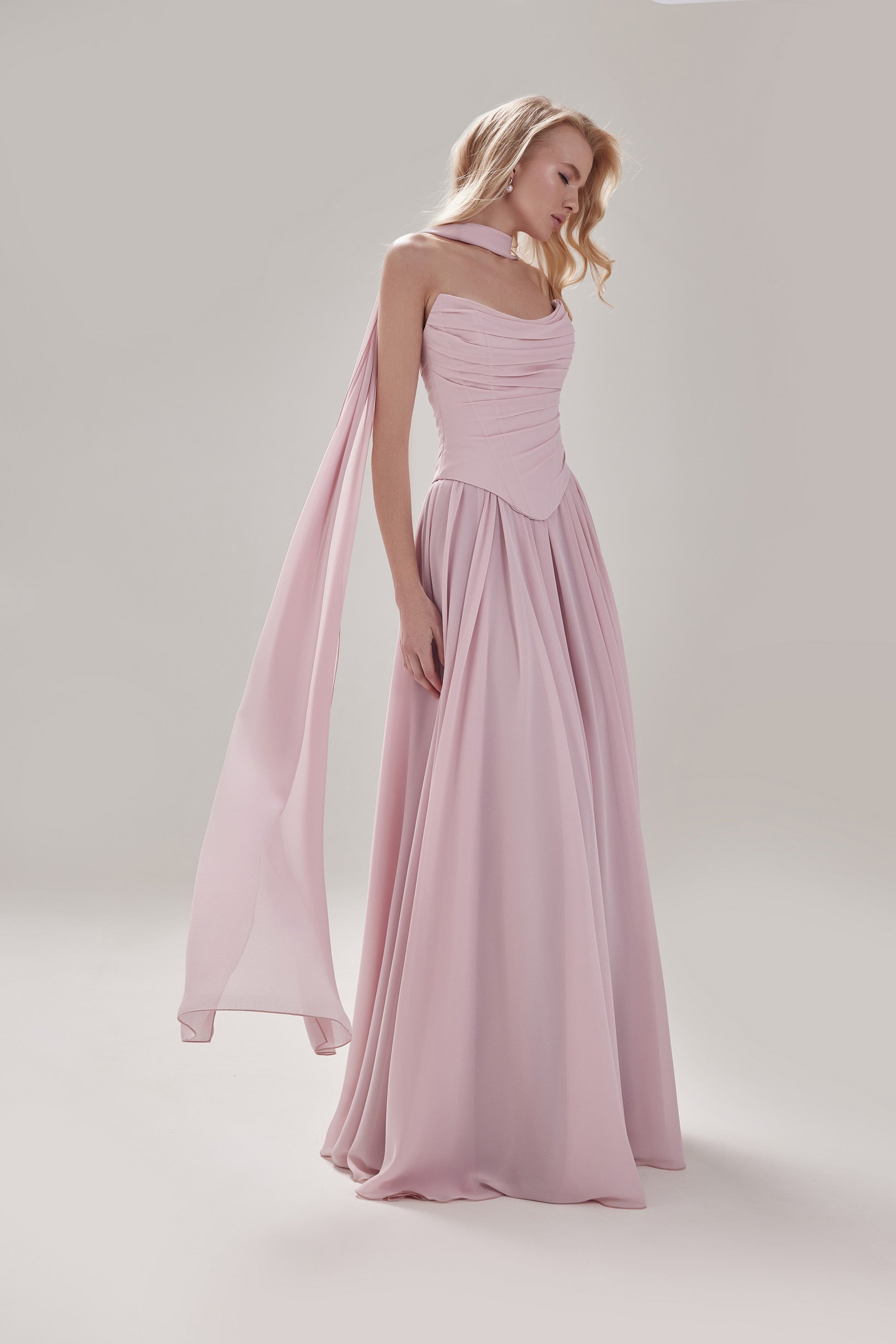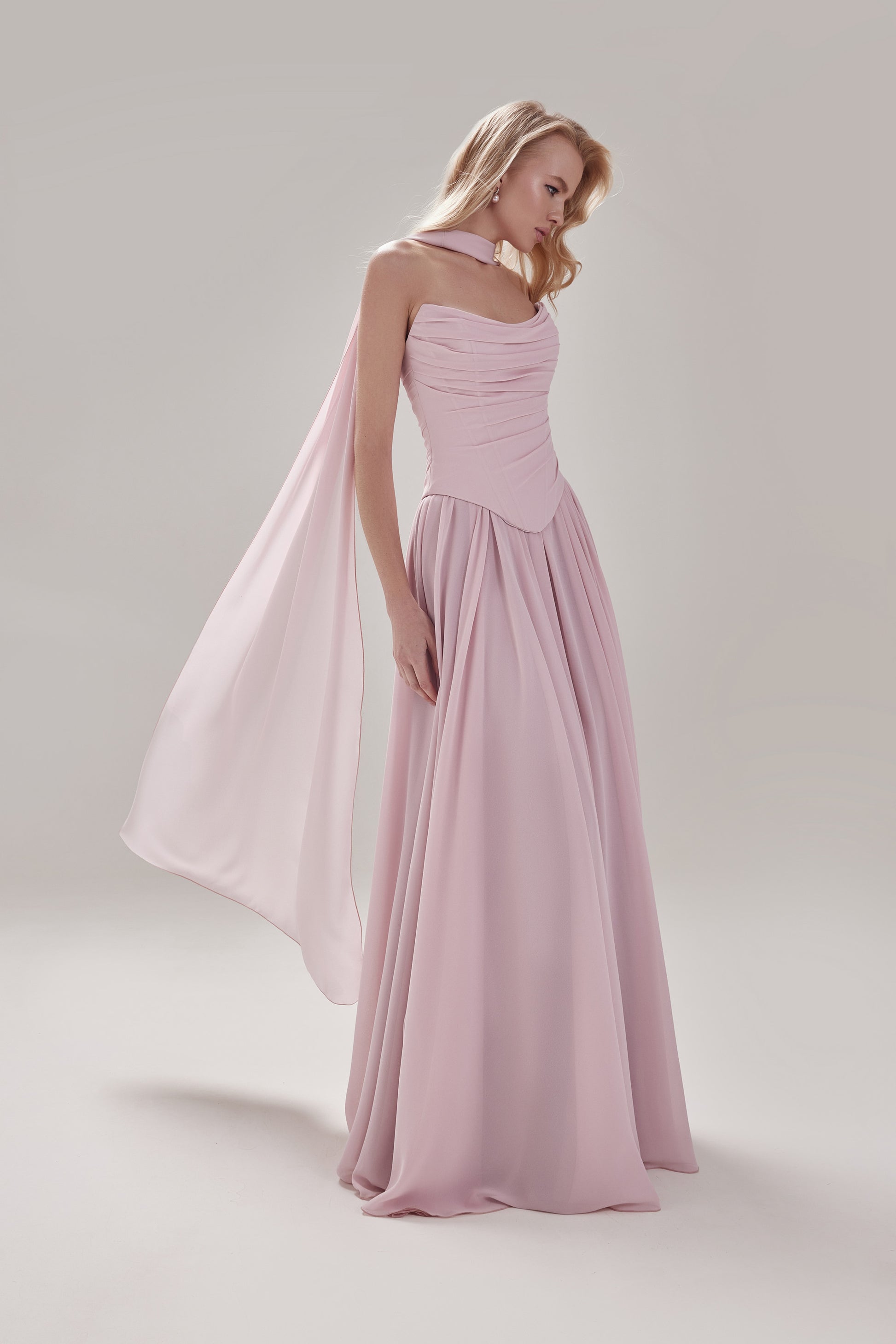Crystal is a romantic chiffon wedding dress that's perfect for brides who want a modern, clean look with effortless movement. It's strapless and has a minimalist corset design. The soft draping on the bodice hugs the torso, and the lace-up back gives you a fit that's comfortable and supportive. The ethereal chiffon skirt effortlessly flows from the corset, creating a sophisticated and elegant bridal look without any heaviness.