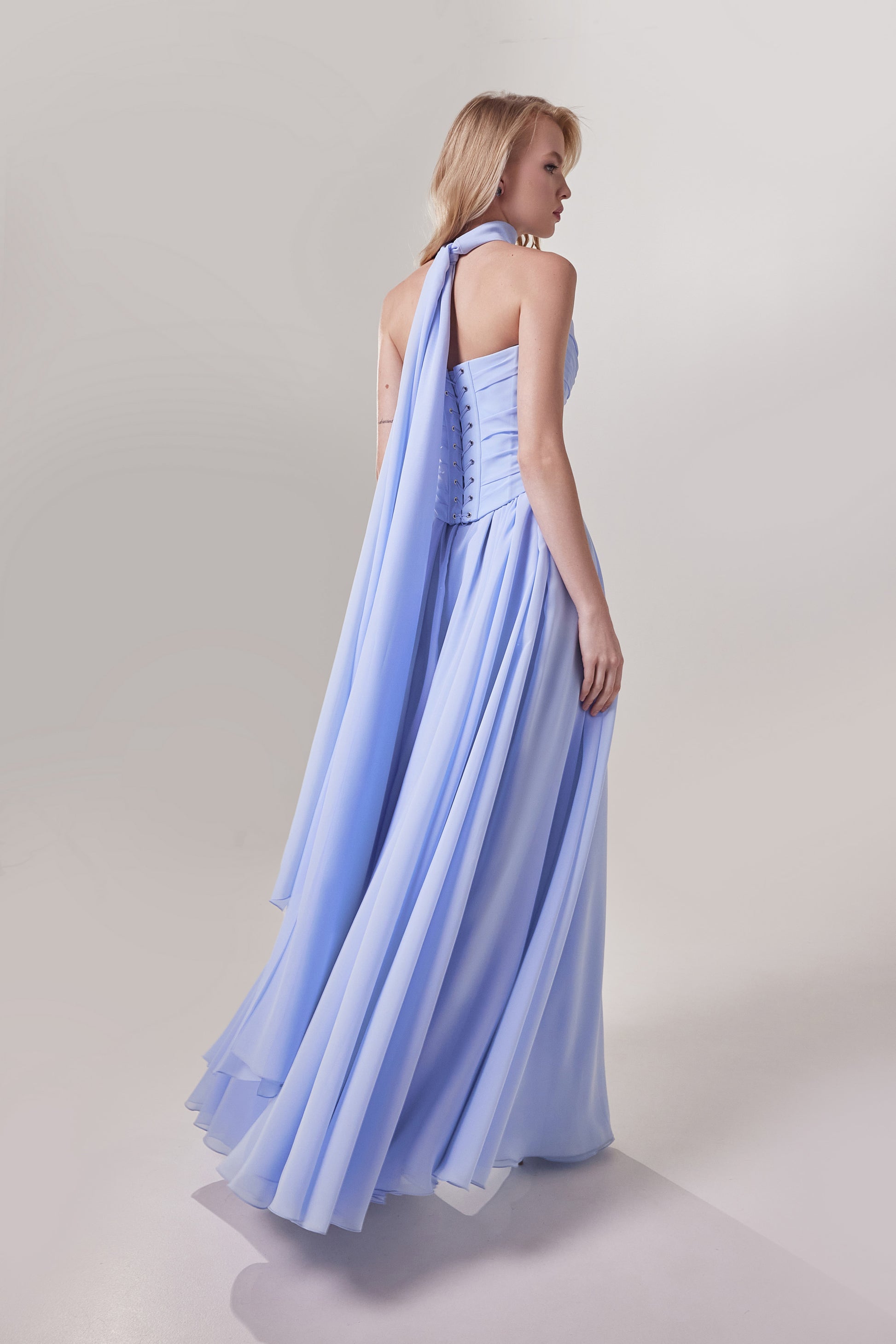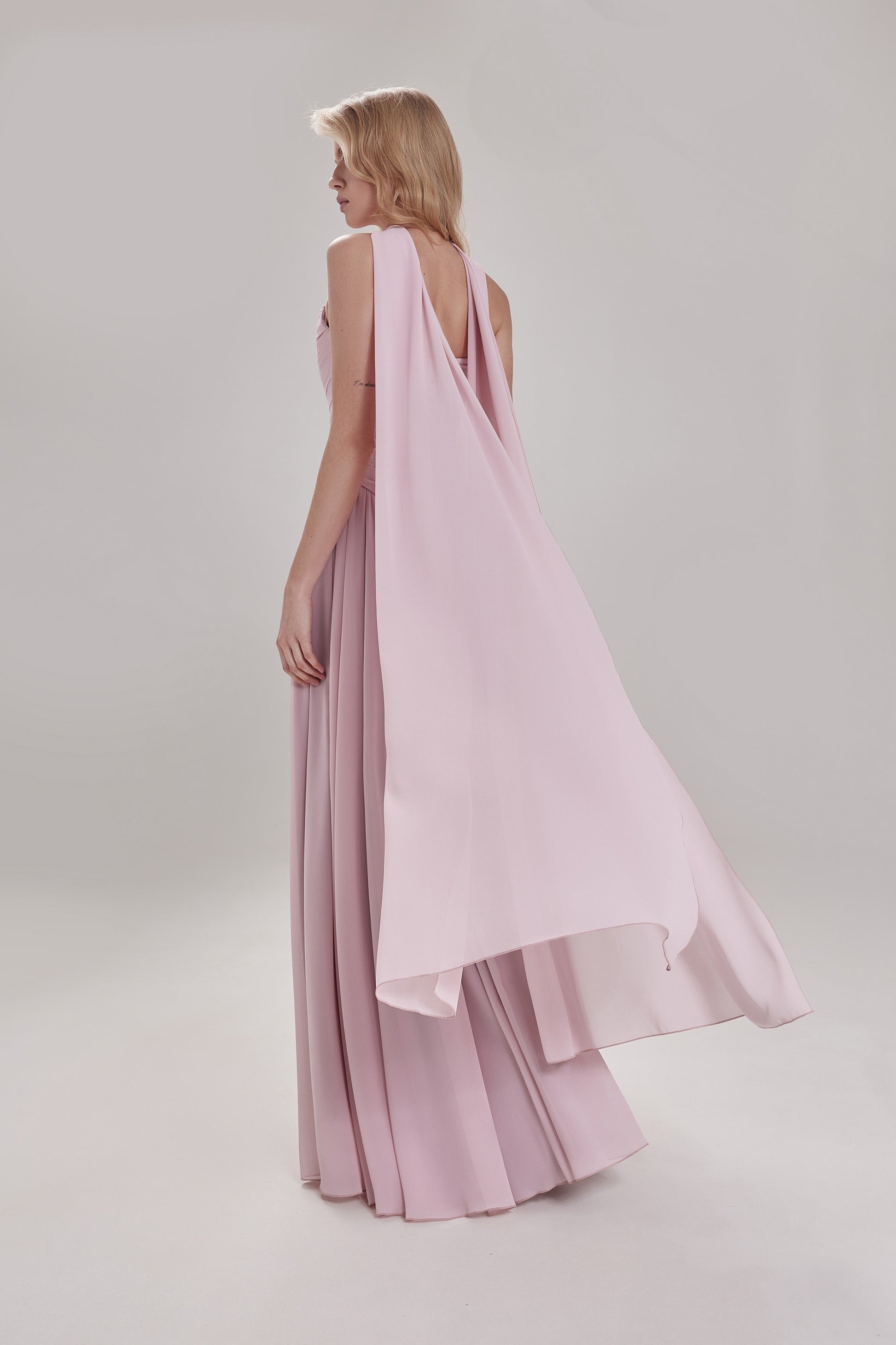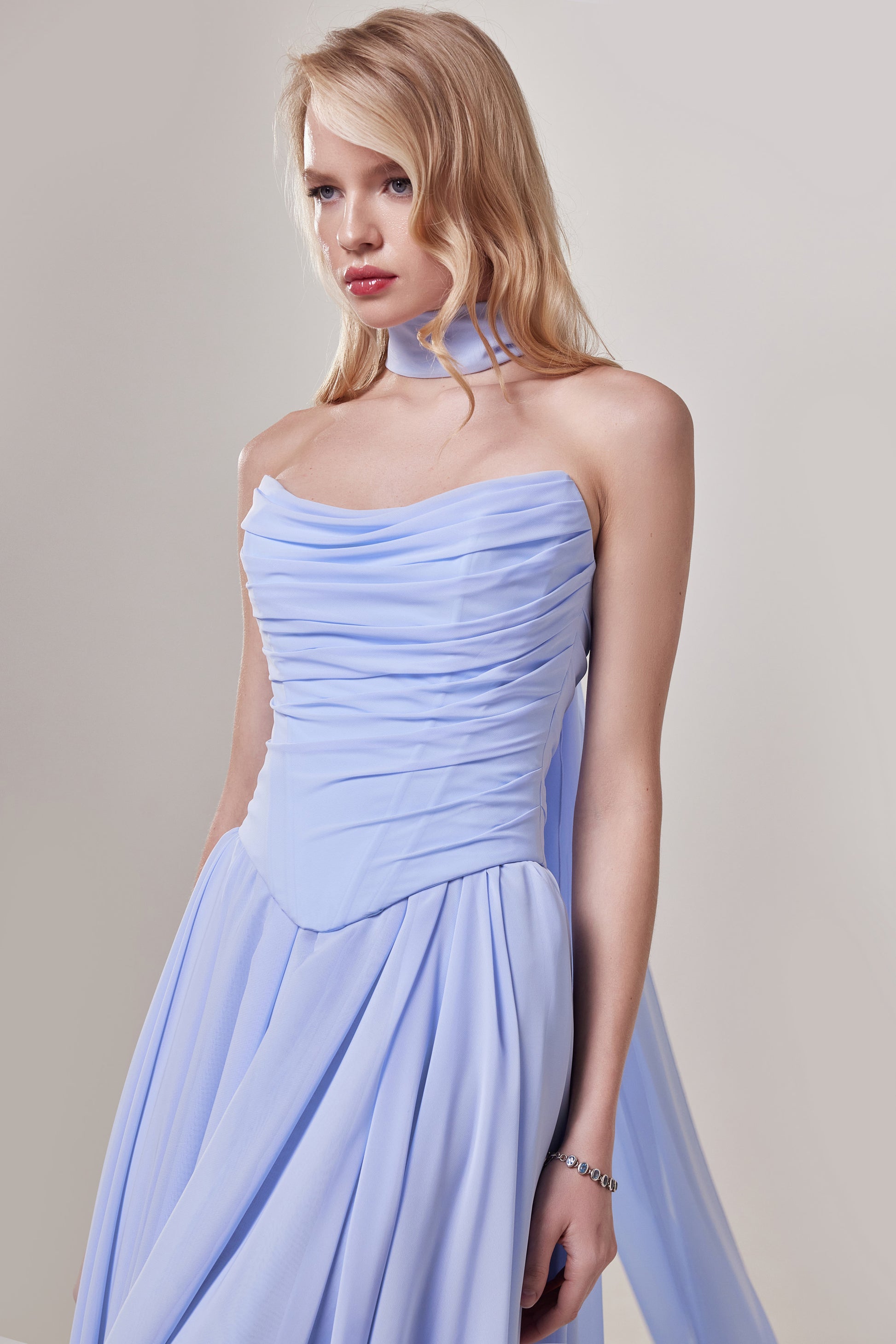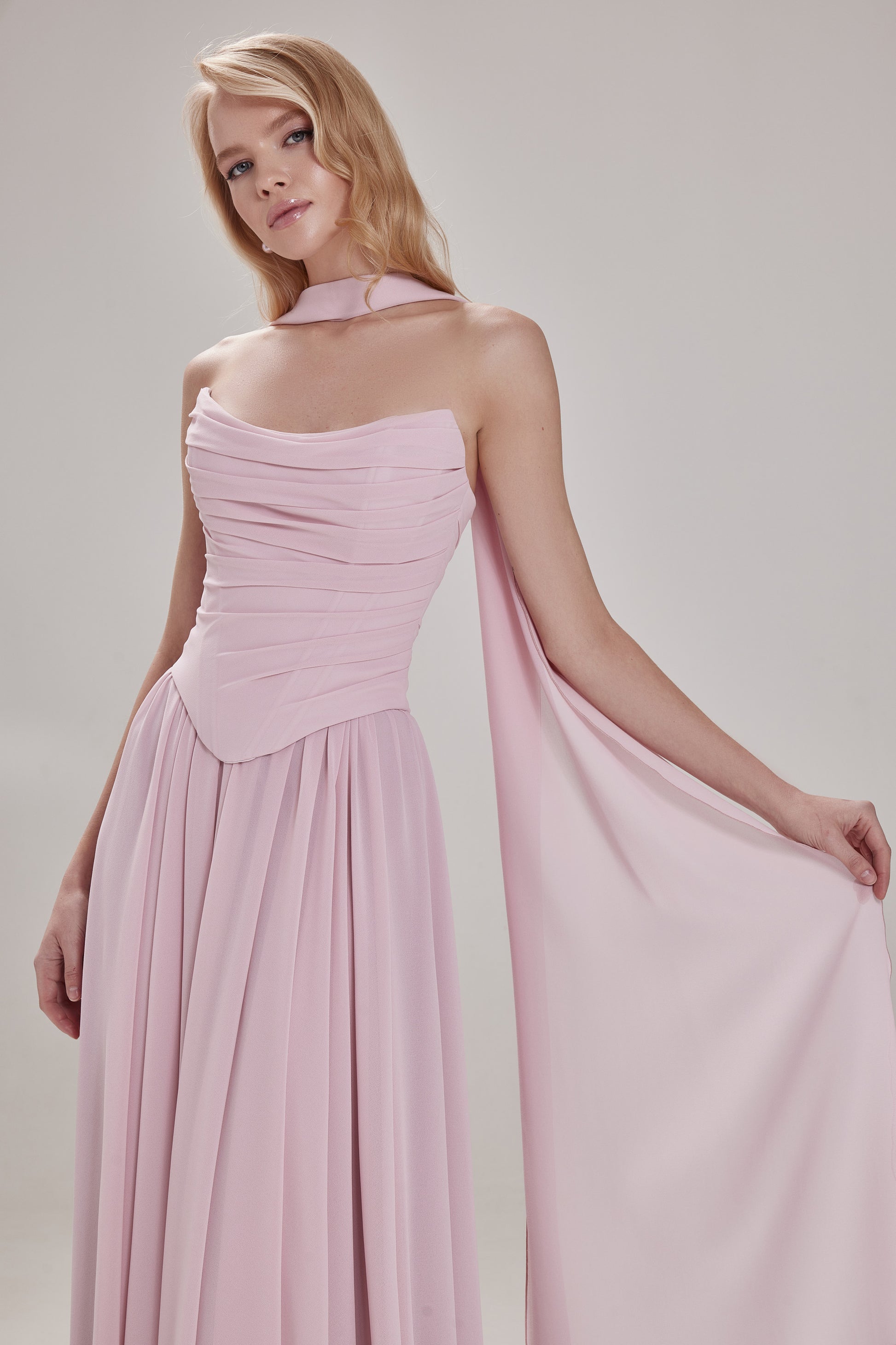 Crystal is a romantic chiffon wedding dress that's perfect for brides who want a modern, clean look with effortless movement. It's strapless and has a minimalist corset design. The soft draping on the bodice hugs the torso, and the lace-up back gives you a fit that's comfortable and supportive. The ethereal chiffon skirt effortlessly flows from the corset, creating a sophisticated and elegant bridal look without any heaviness.