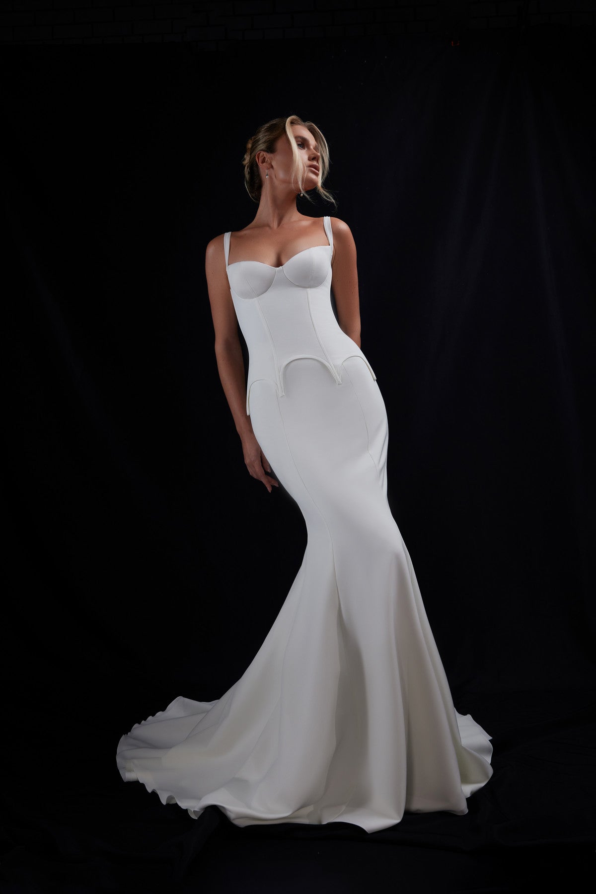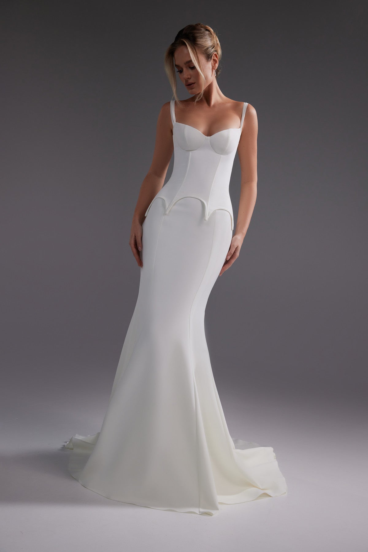 A bustier corset top is made from ivory stretch crepe fabric, with a modern, structured design that shows off a flattering sweetheart neckline. The flowing skirt, which sweeps dramatically to the floor, forms a mermaid silhouette, fitting comfortably at the hips and expanding at the bottom.