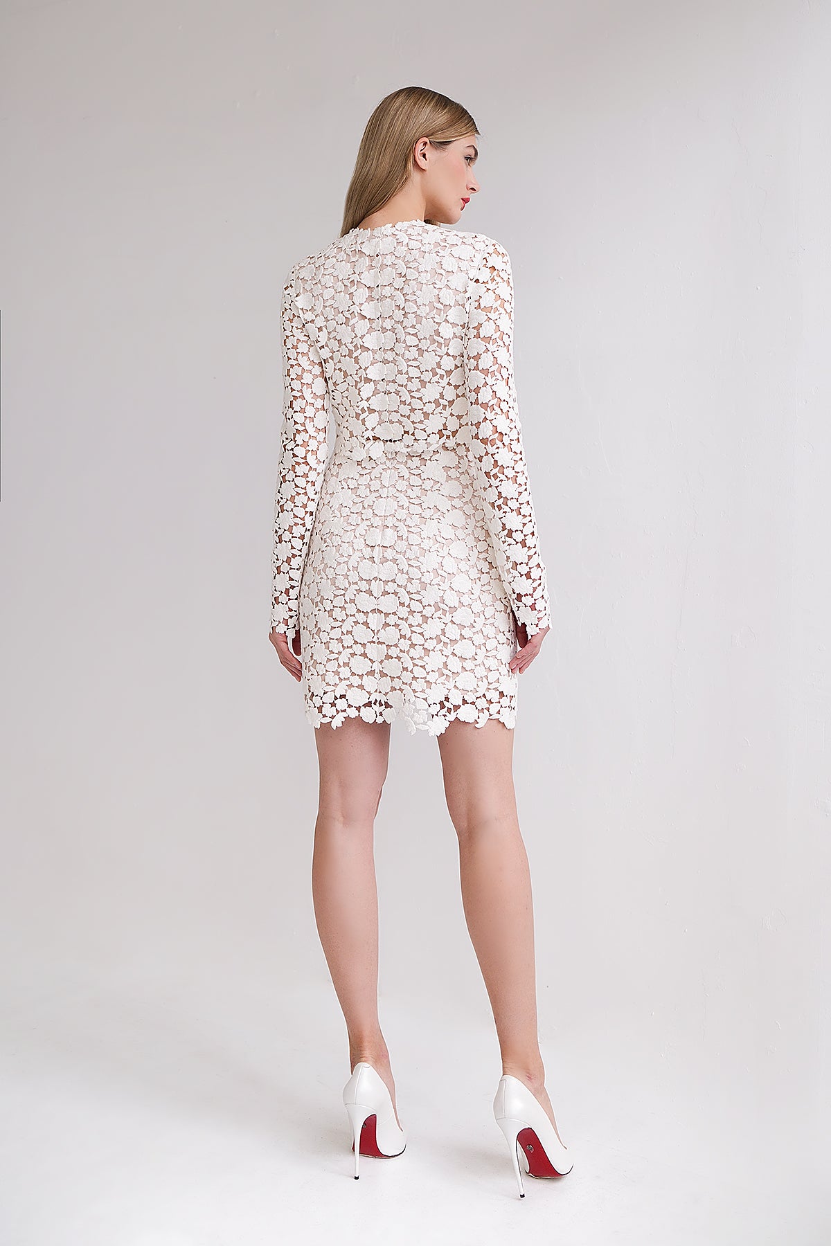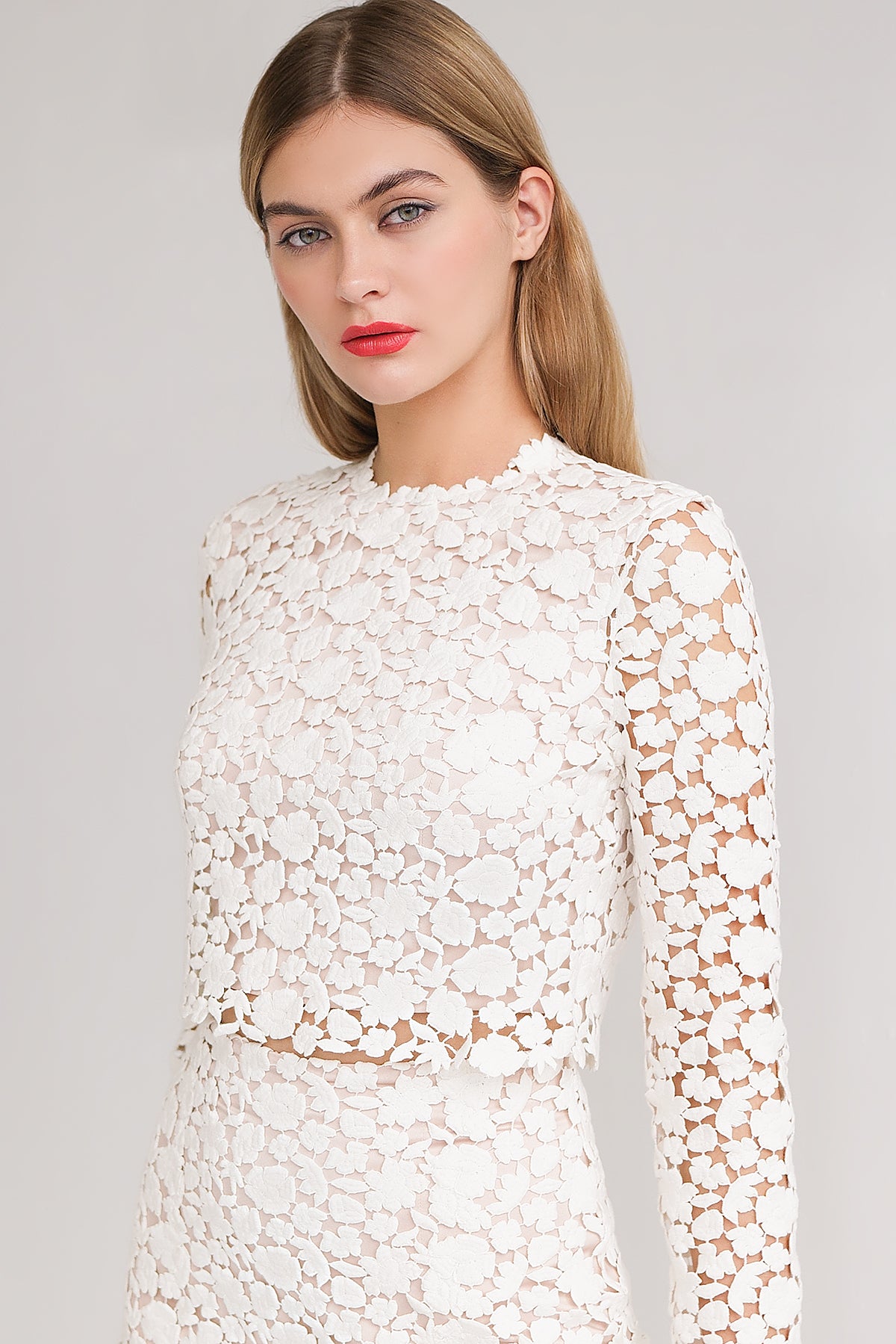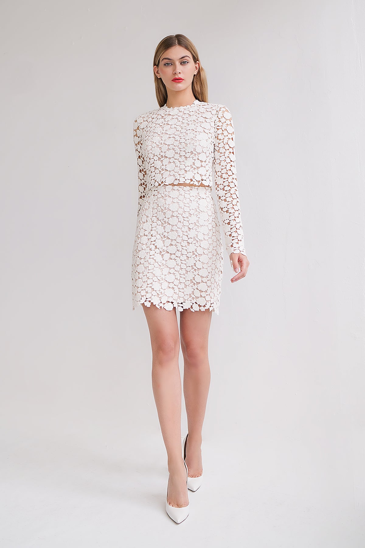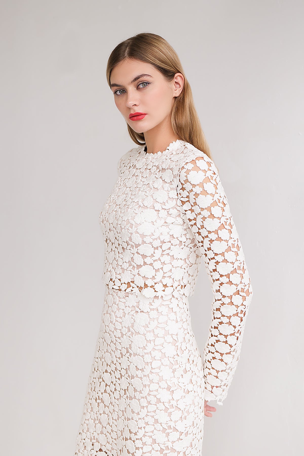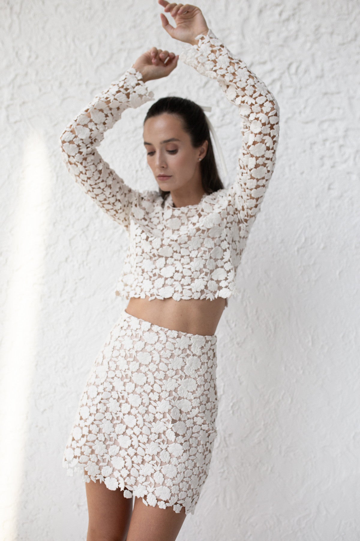 The bride's outfit includes a little skirt and a top with long sleeves. The top has a hidden button at the back and the skirt has a hidden zip. It's a casual wedding dress made of cotton lace with a viscose silk inner layer.