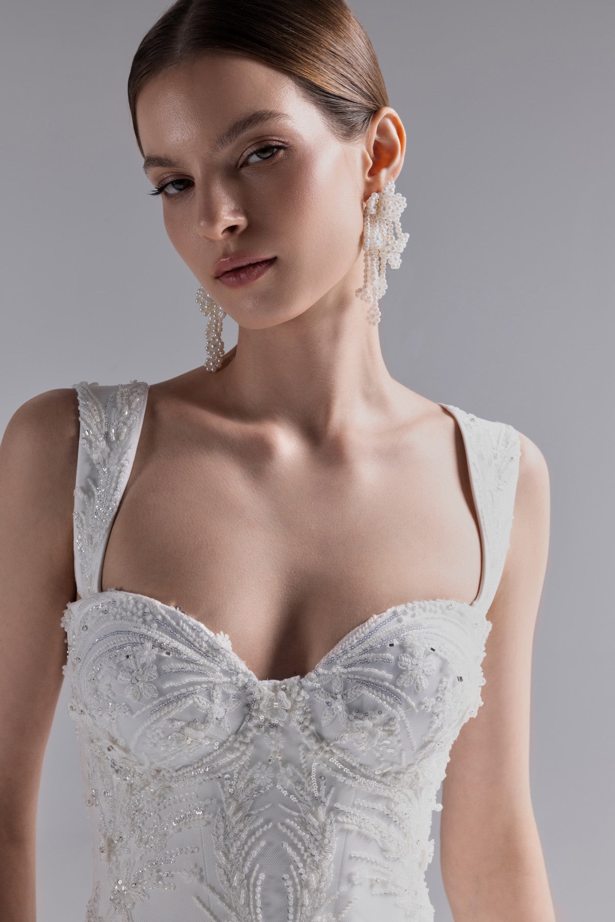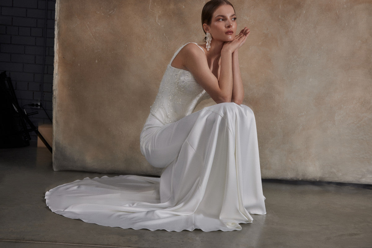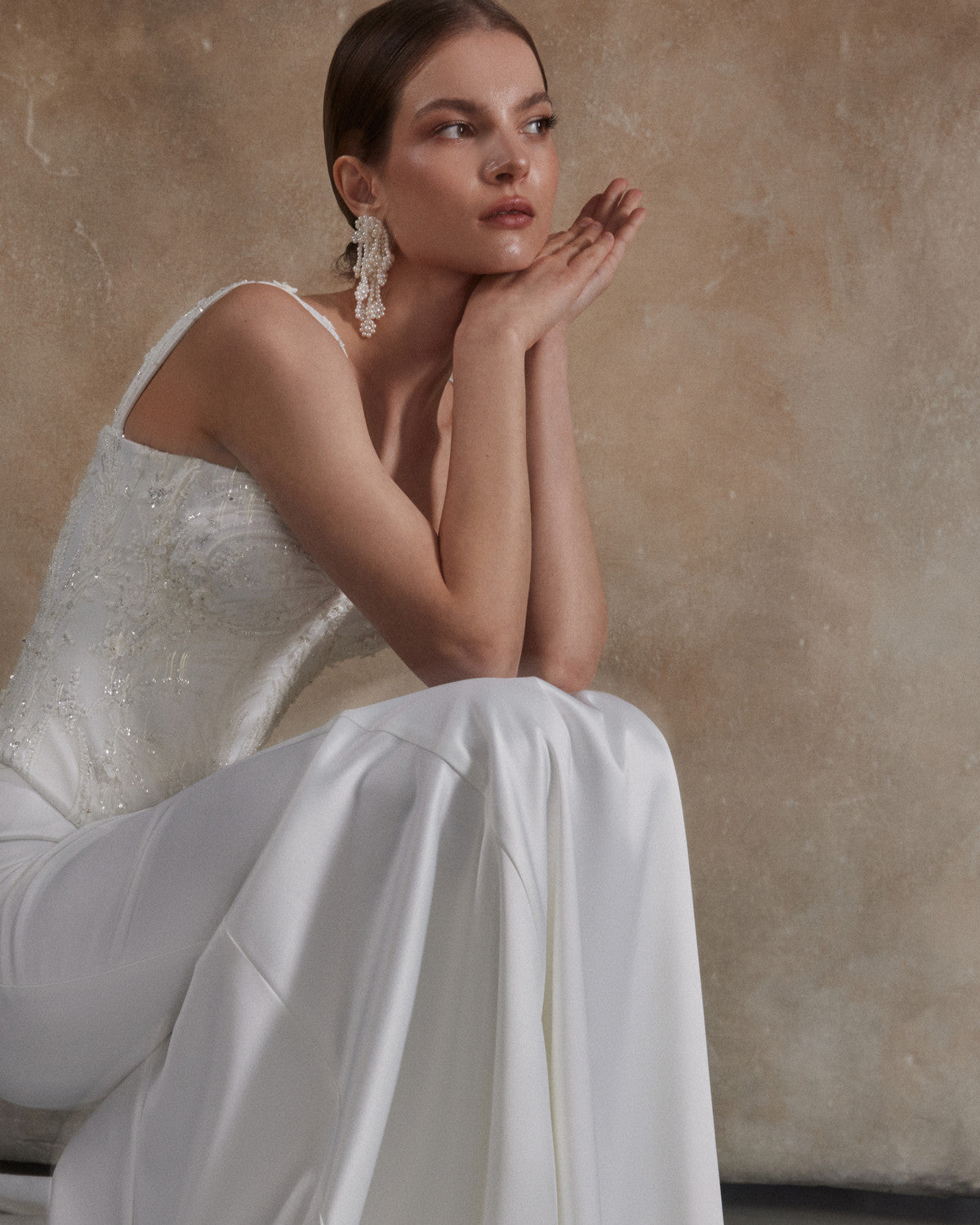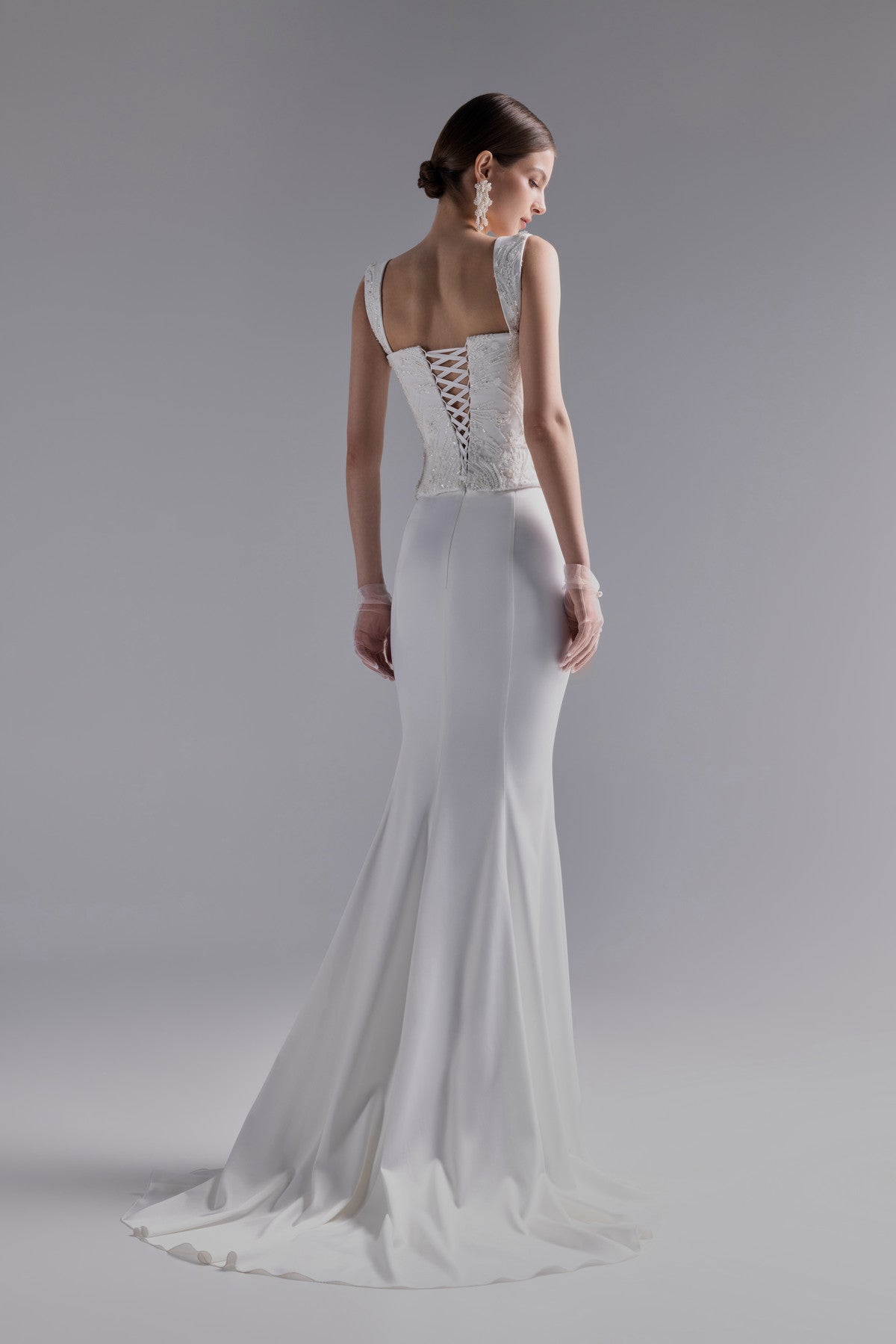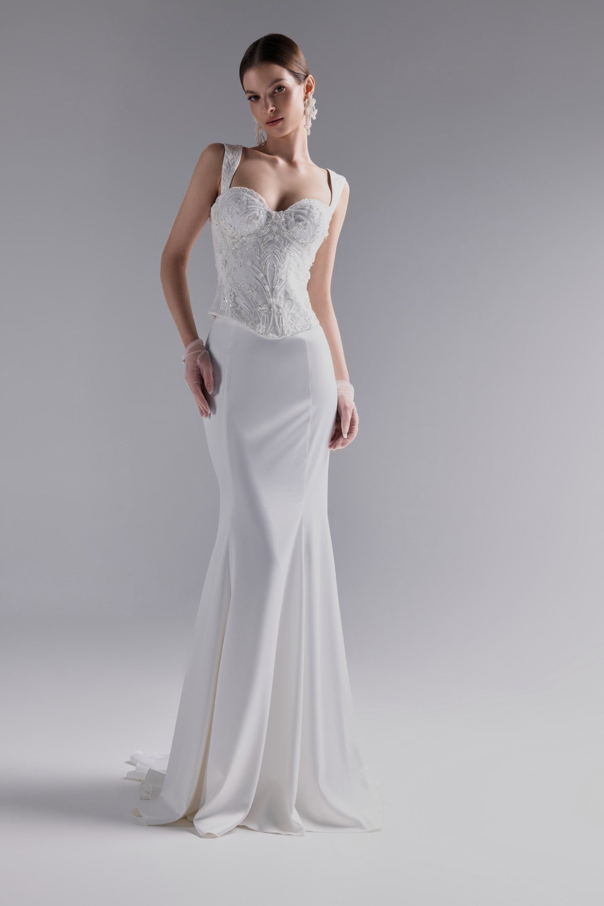 Our new elegant ensemble consists of a satin maxi skirt with a chapel train, which fits like a second skin, and a lace corset with removable straps. You will be breathtaking in this exquisite wedding set! The stunning sweetheart neckline of the satin corset complements the delicate floral embroidery, accentuating your skin and highlighting your curves in a flattering way.