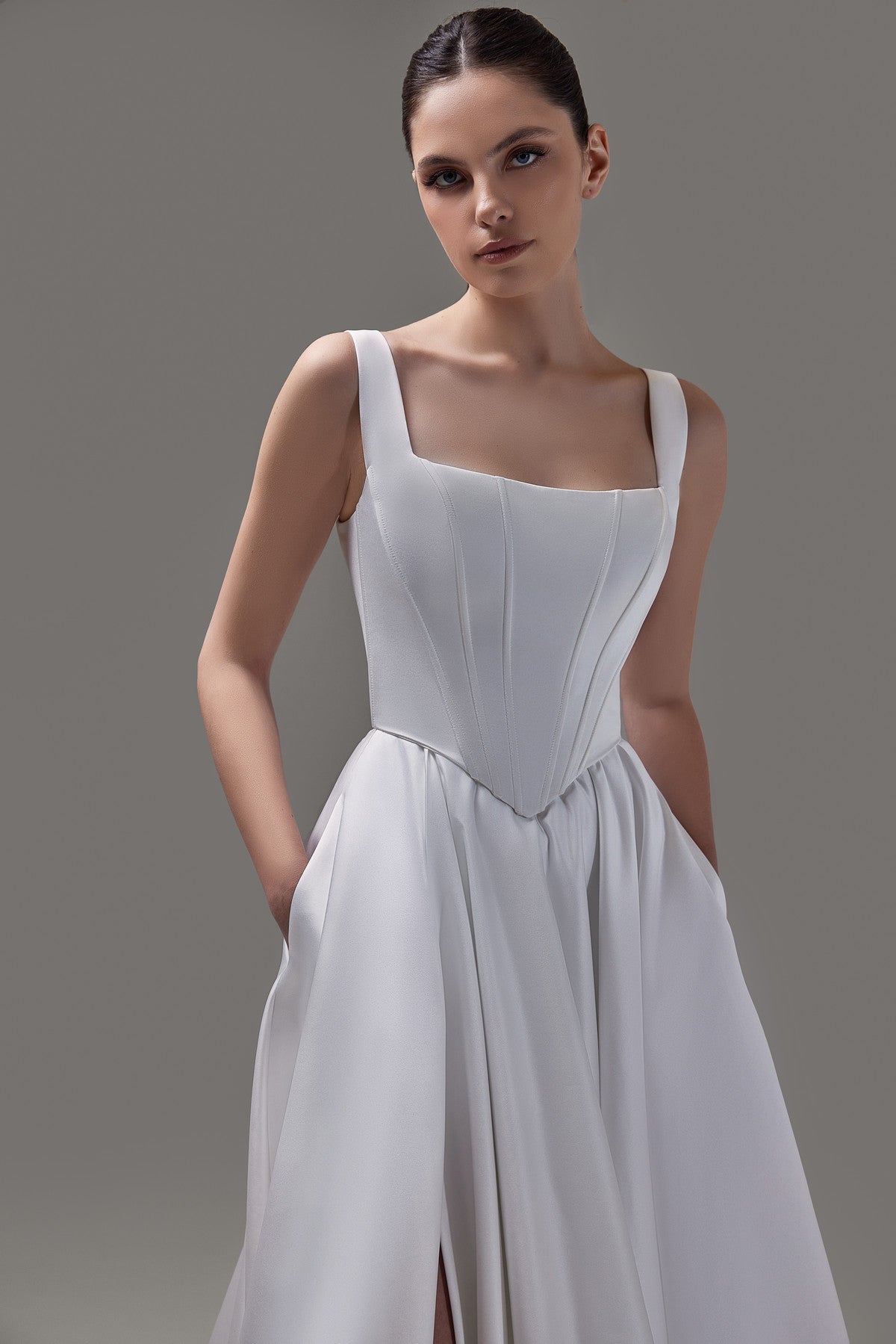 The two-piece set has a fitted corset top and an A-line bottom. The dress is made from satin, and it has a drop-waist corset that fits like a glove and a full skirt with a sensational long train and high slit in front.