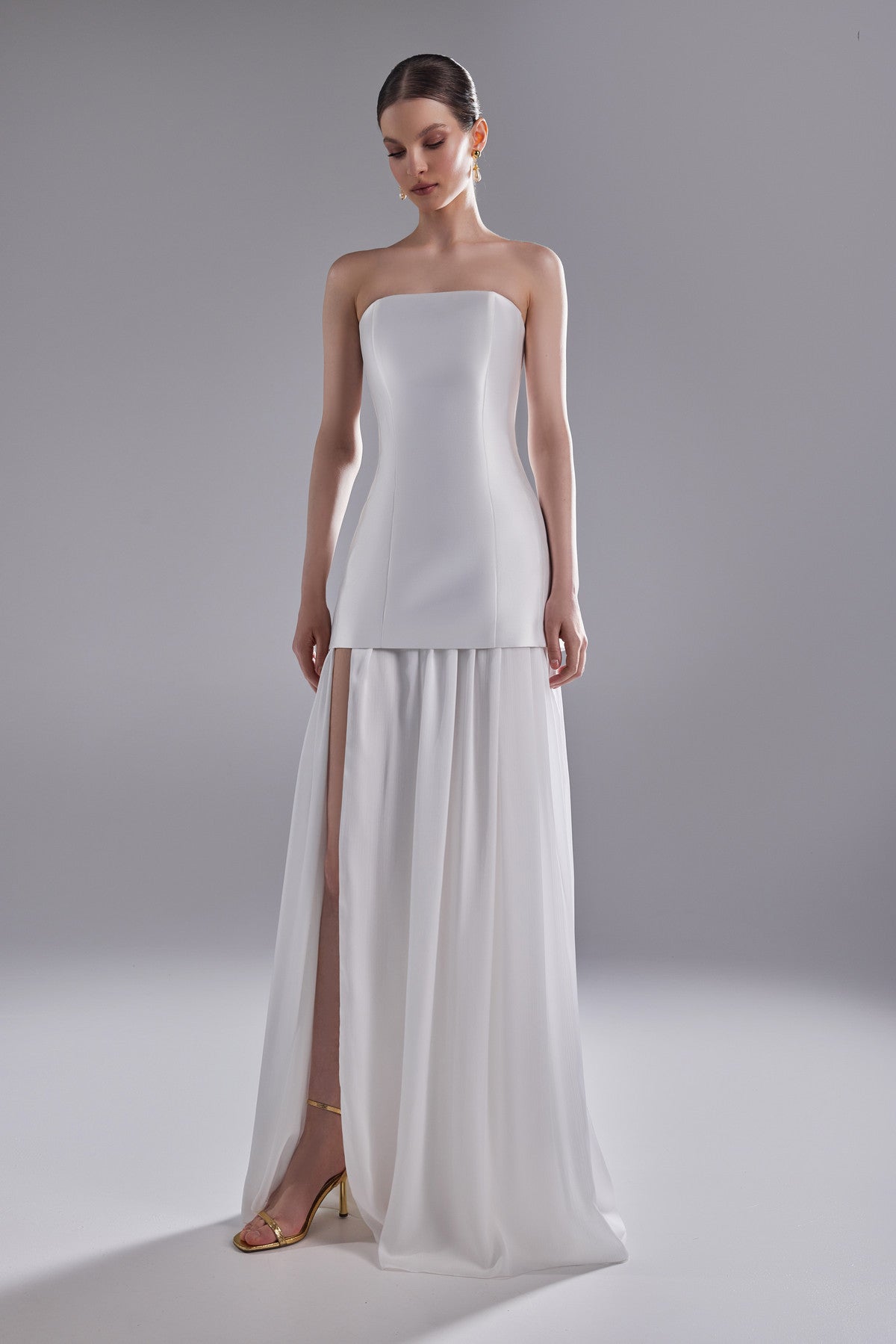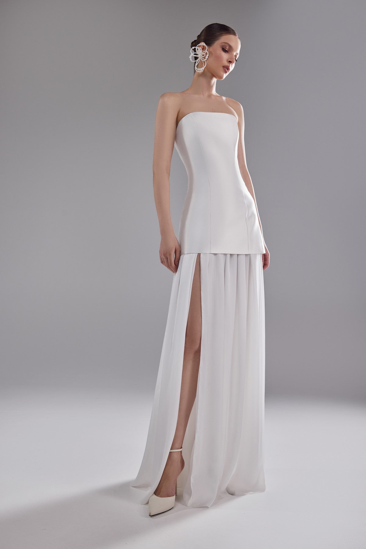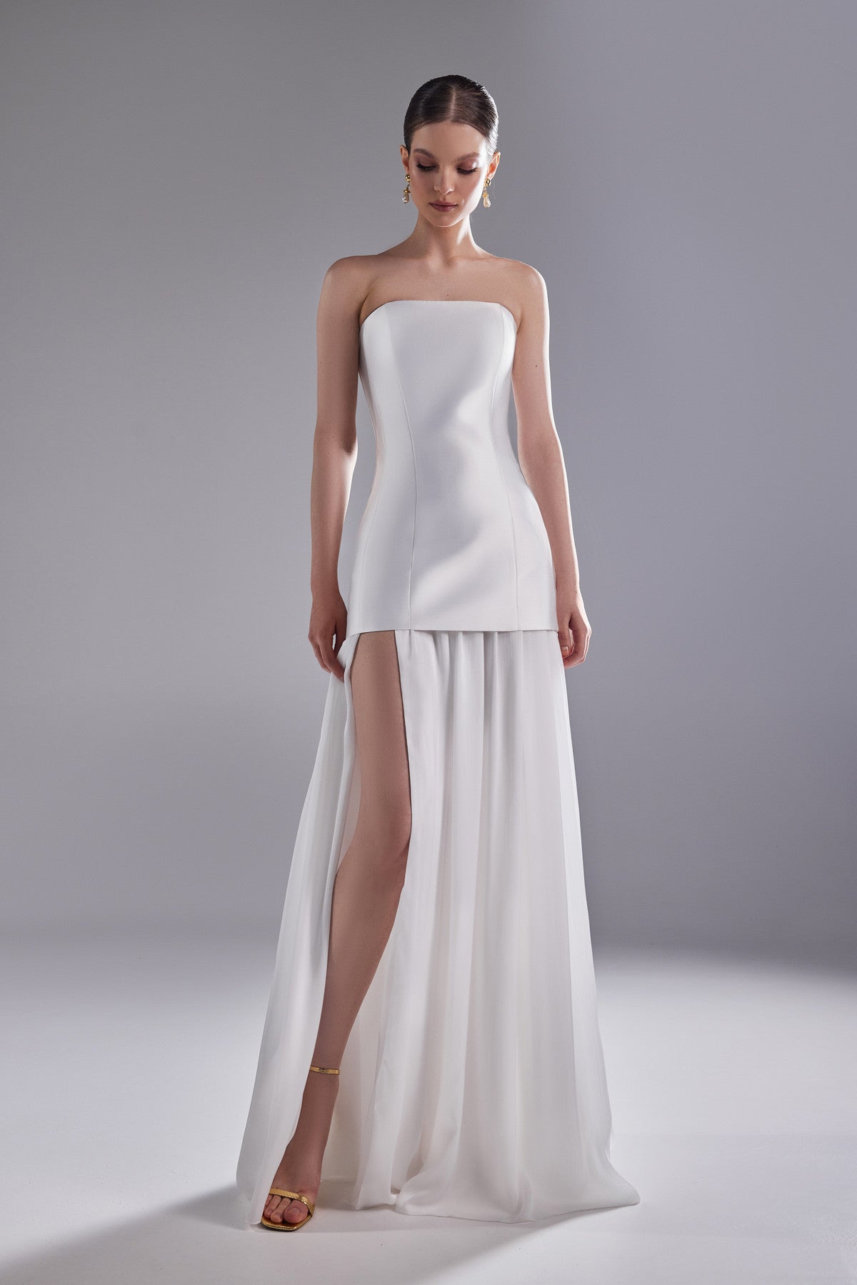 Two-piece Strapless Mikado Mini Dress Palmira With Chiffon High Slit Maxi Skirt