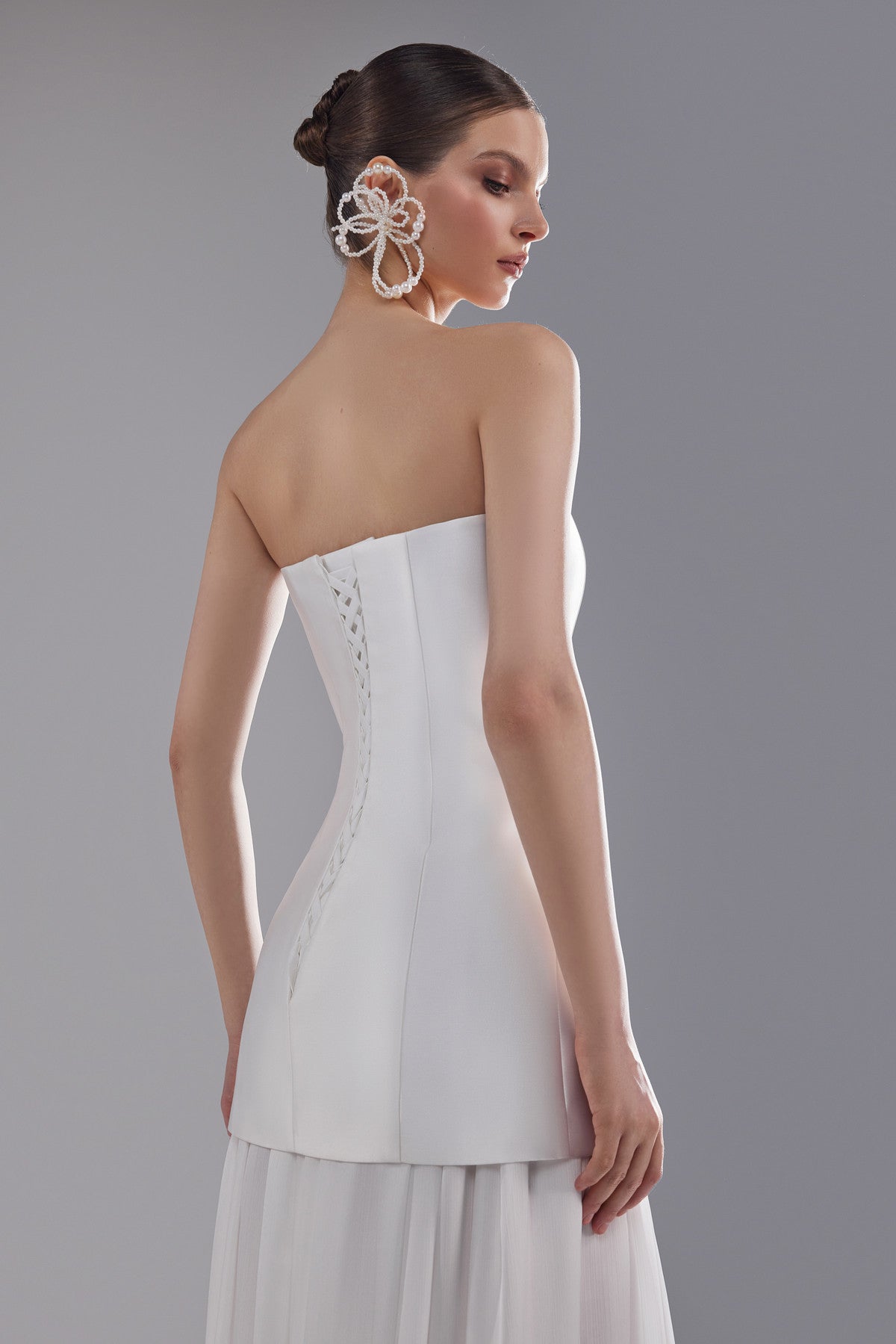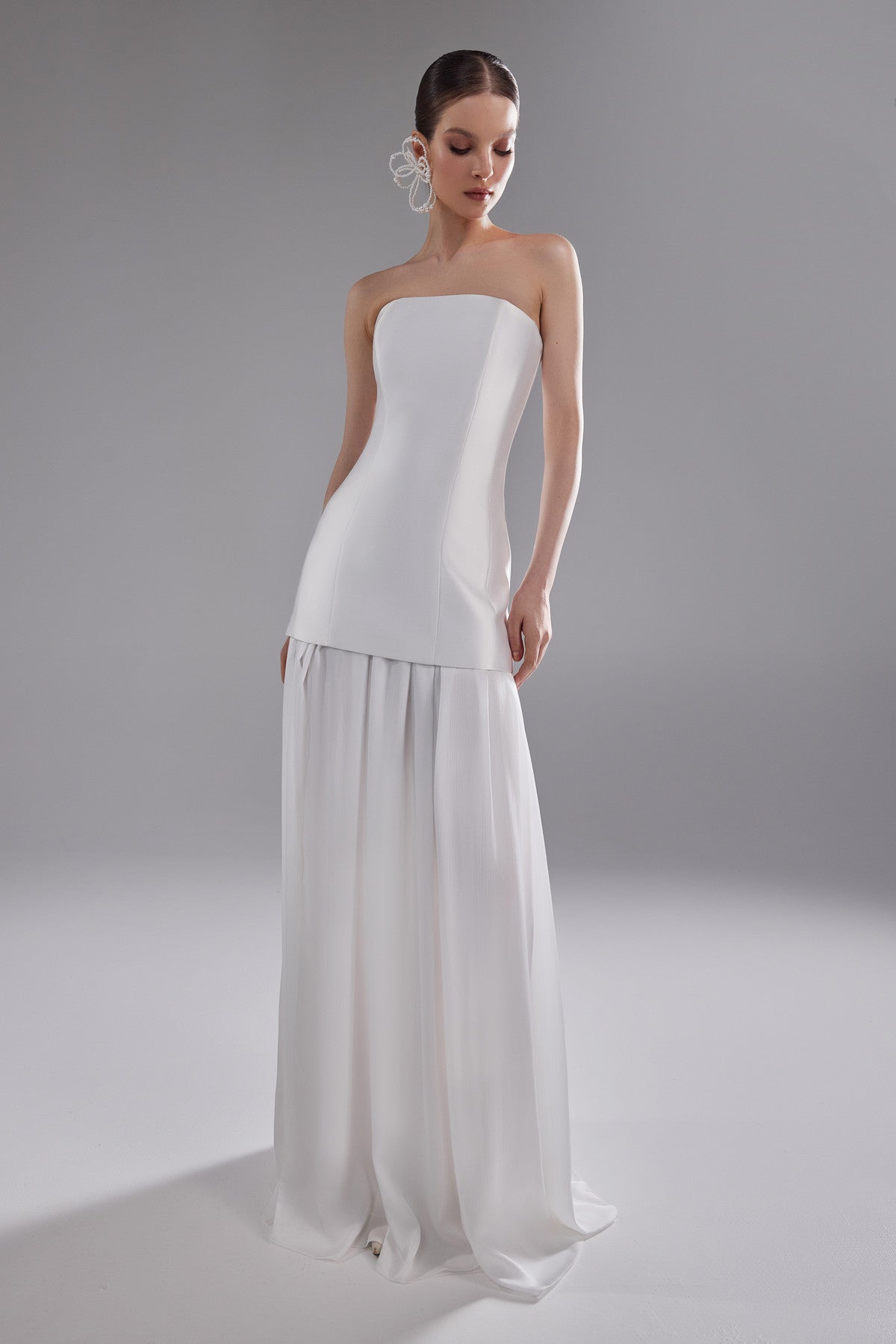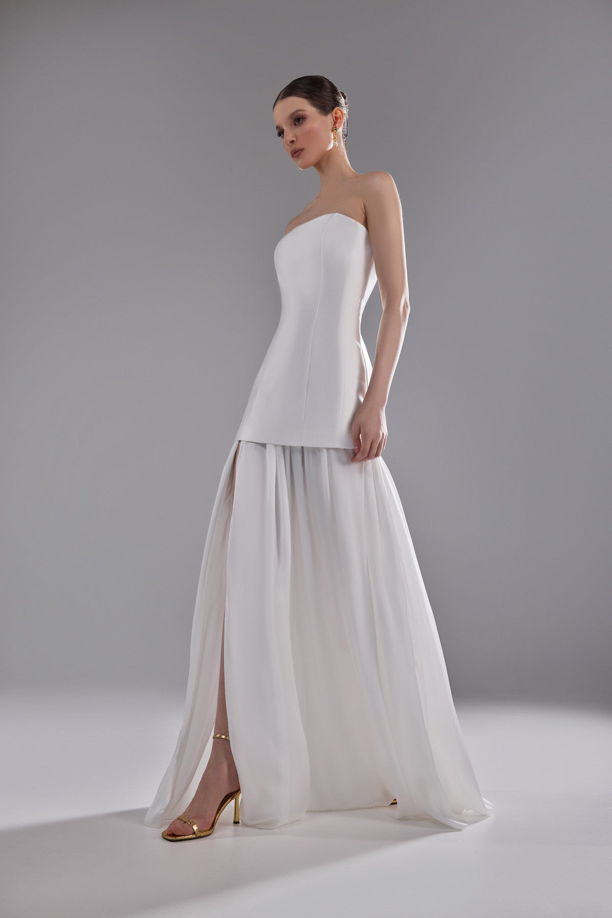 Two-piece Strapless Mikado Mini Dress Palmira With Chiffon High Slit Maxi Skirt