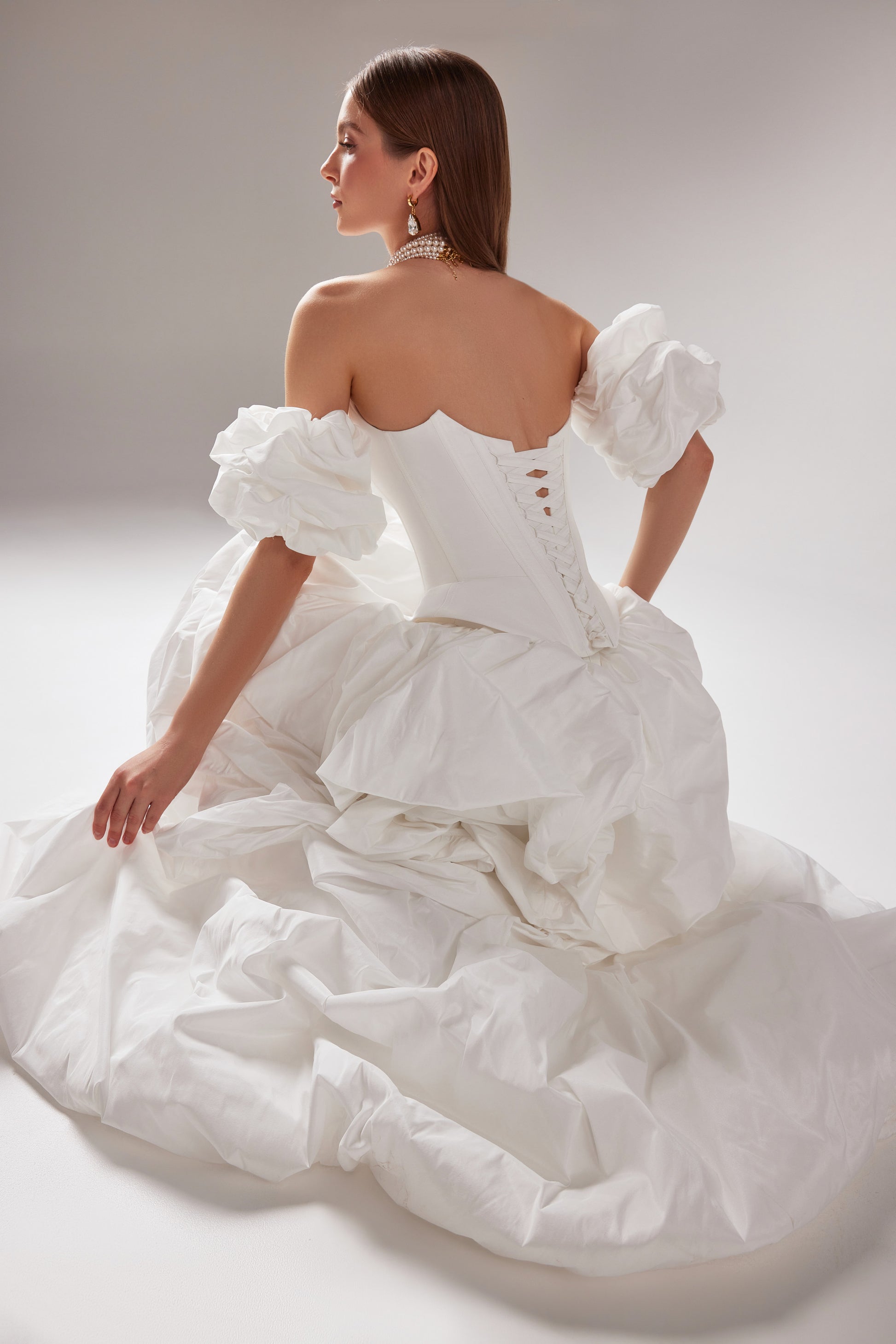 Inspired by high fashion, it is crafted from luxurious taffeta and creates a unique look. This dress has a dramatic high-low silhouette, with a fitted corset top that creates an hourglass figure. The neckline is clean and sculpted, and there are delicate front buttons. Detachable off-the-shoulder puff sleeves add a romantic touch, while the skirt flows into a train that's both flouncy and sculptural.