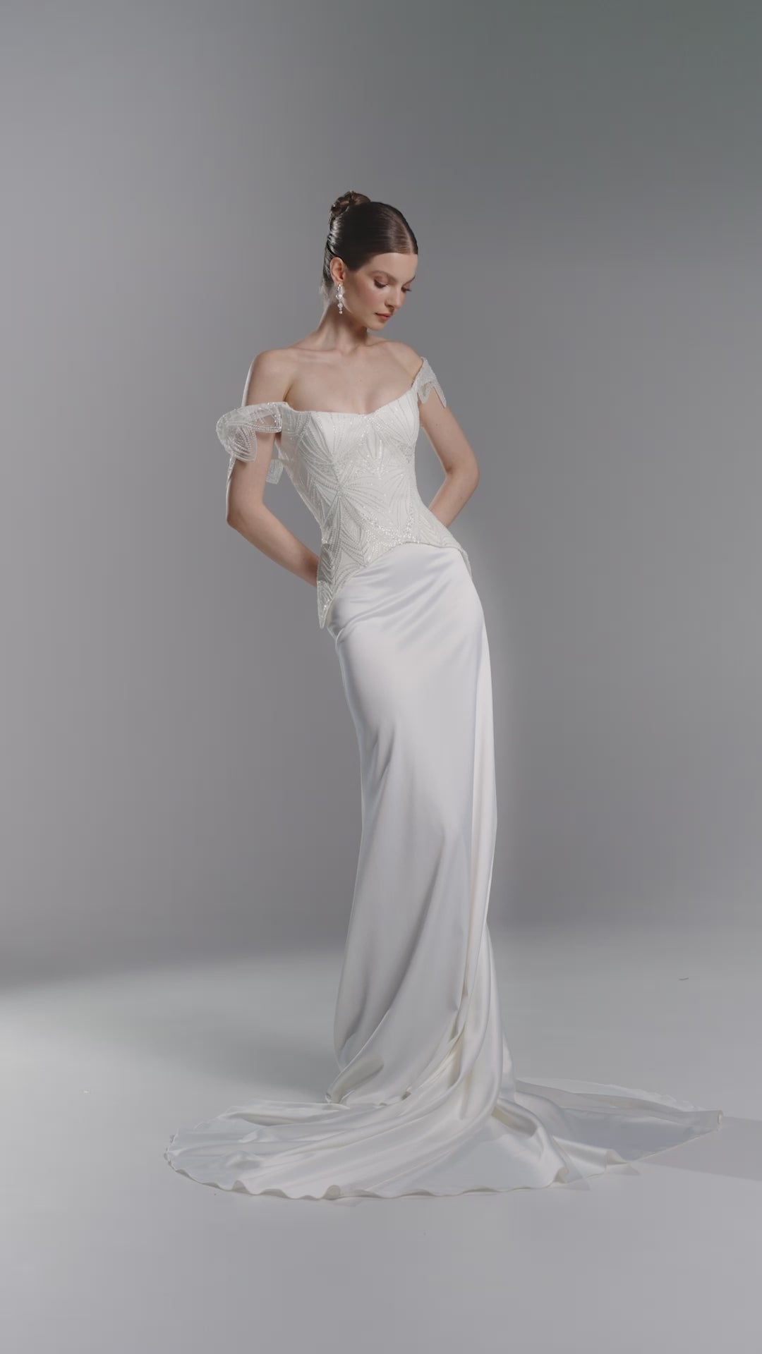 The structured corset provides a flattering, fitted silhouette, and the lace-up back allows for adjustable comfort and a personalized fit. Delicate removable off-shoulder straps add a touch of softness and romance, while the smooth satin skirt flows effortlessly to the ground, creating a graceful, elegant movement as you walk.