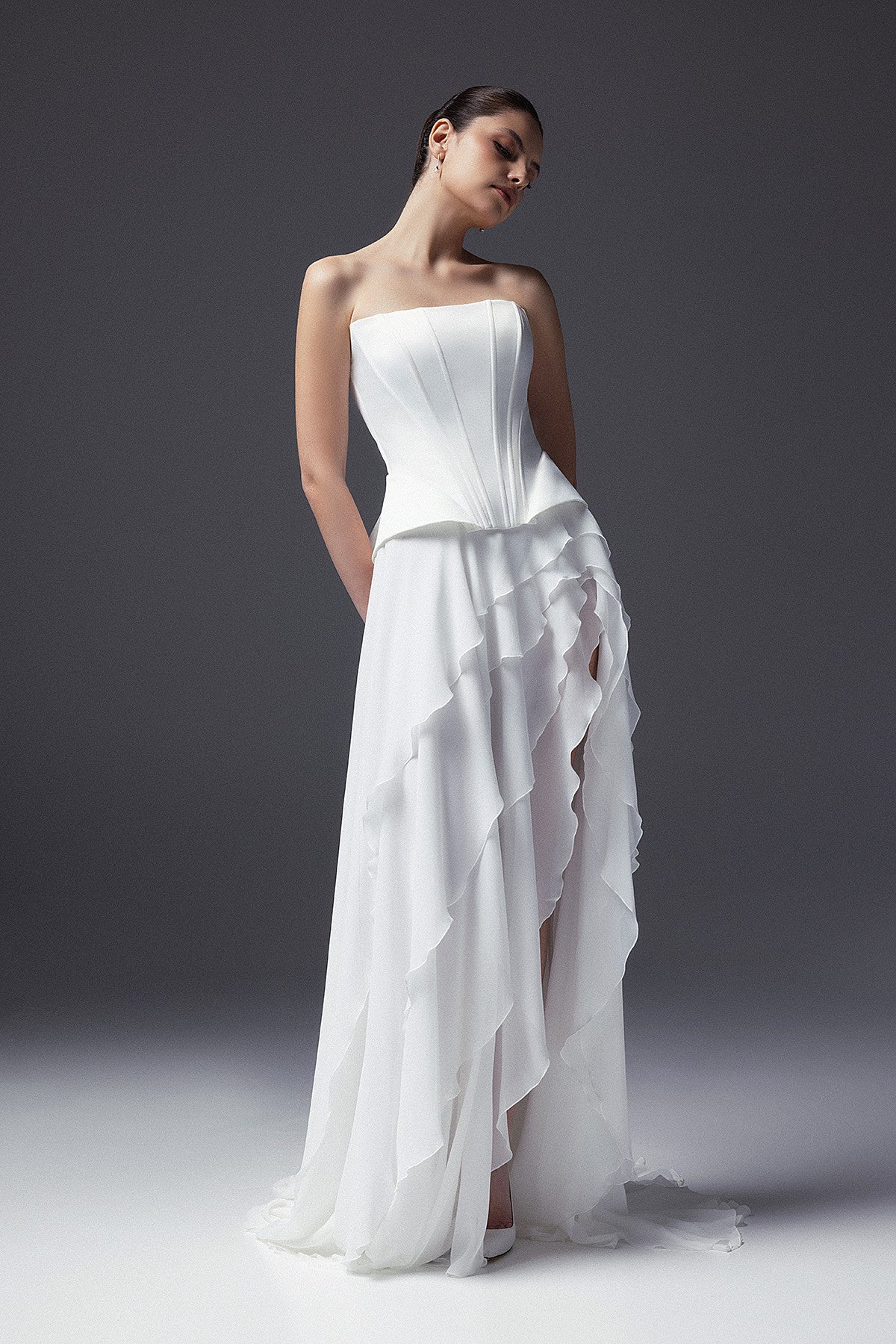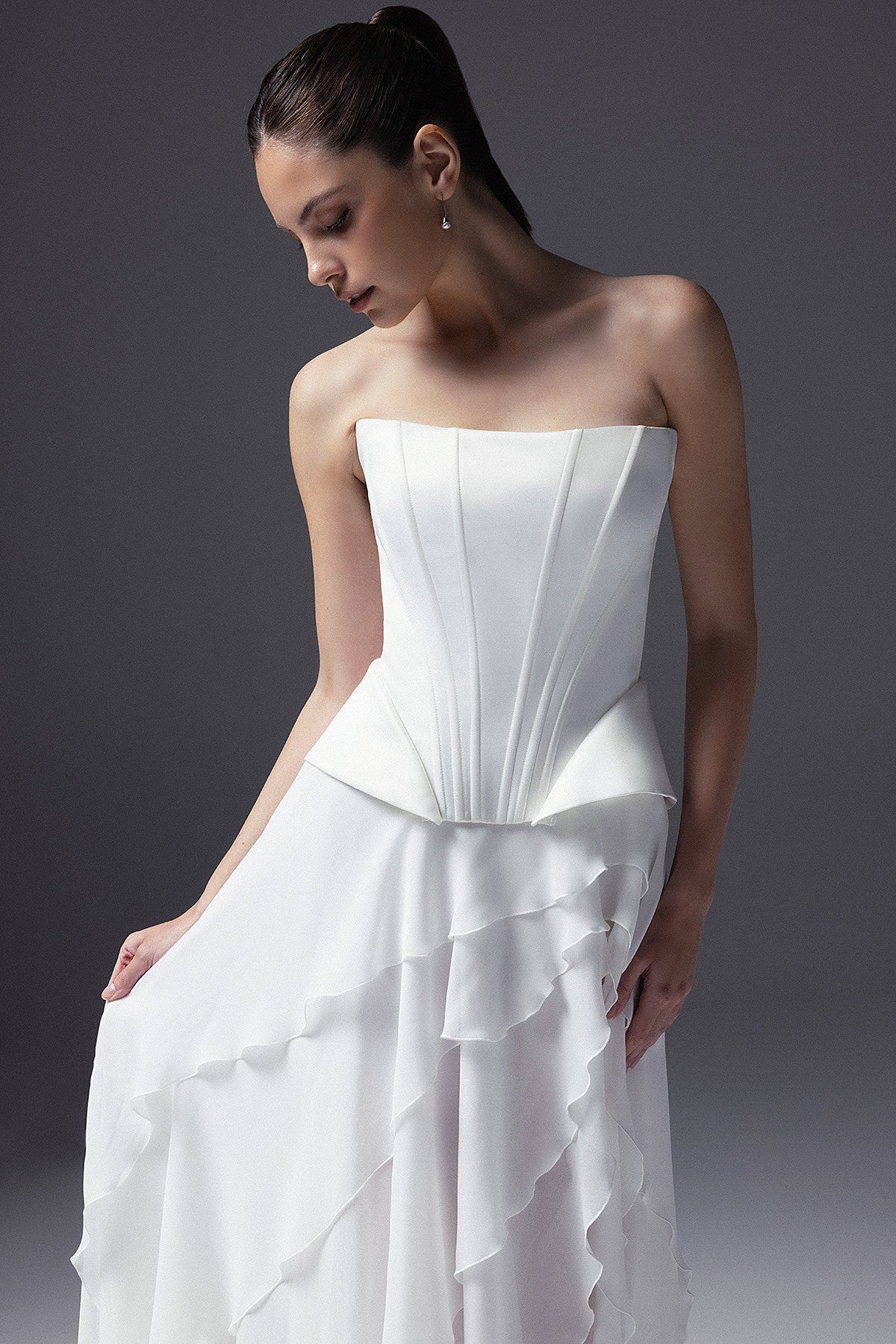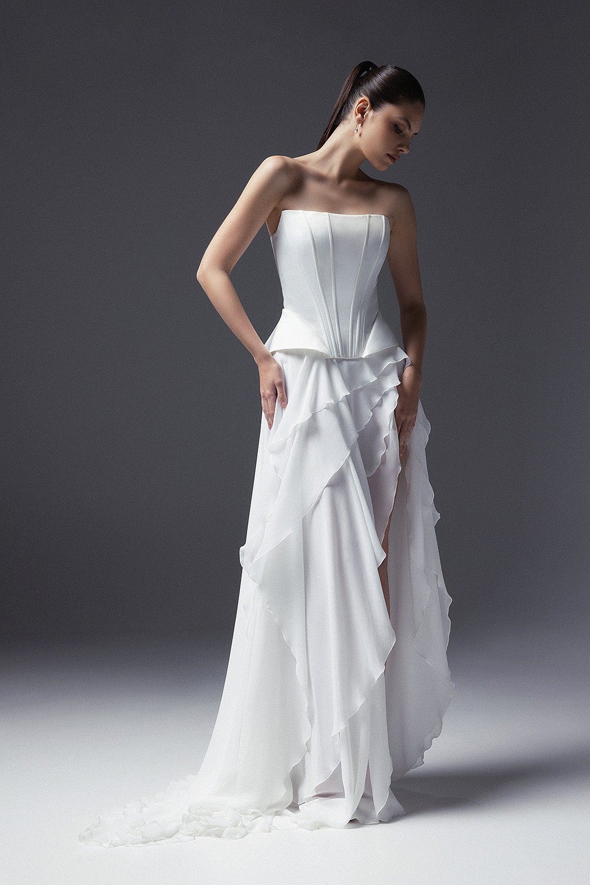 Two Piece Wedding Dress Greta with Chiffon Asymmetric Maxi Skirt and Strapless Peplum Corset