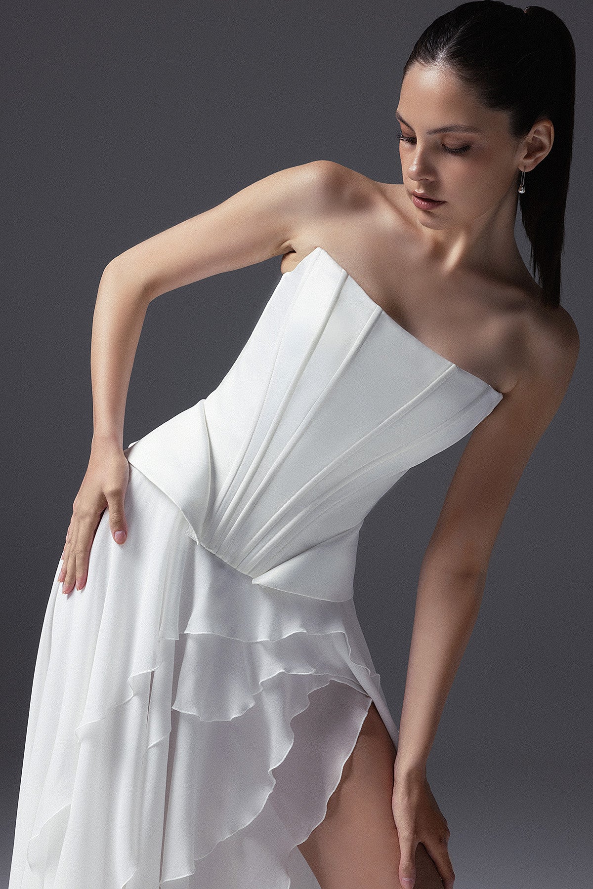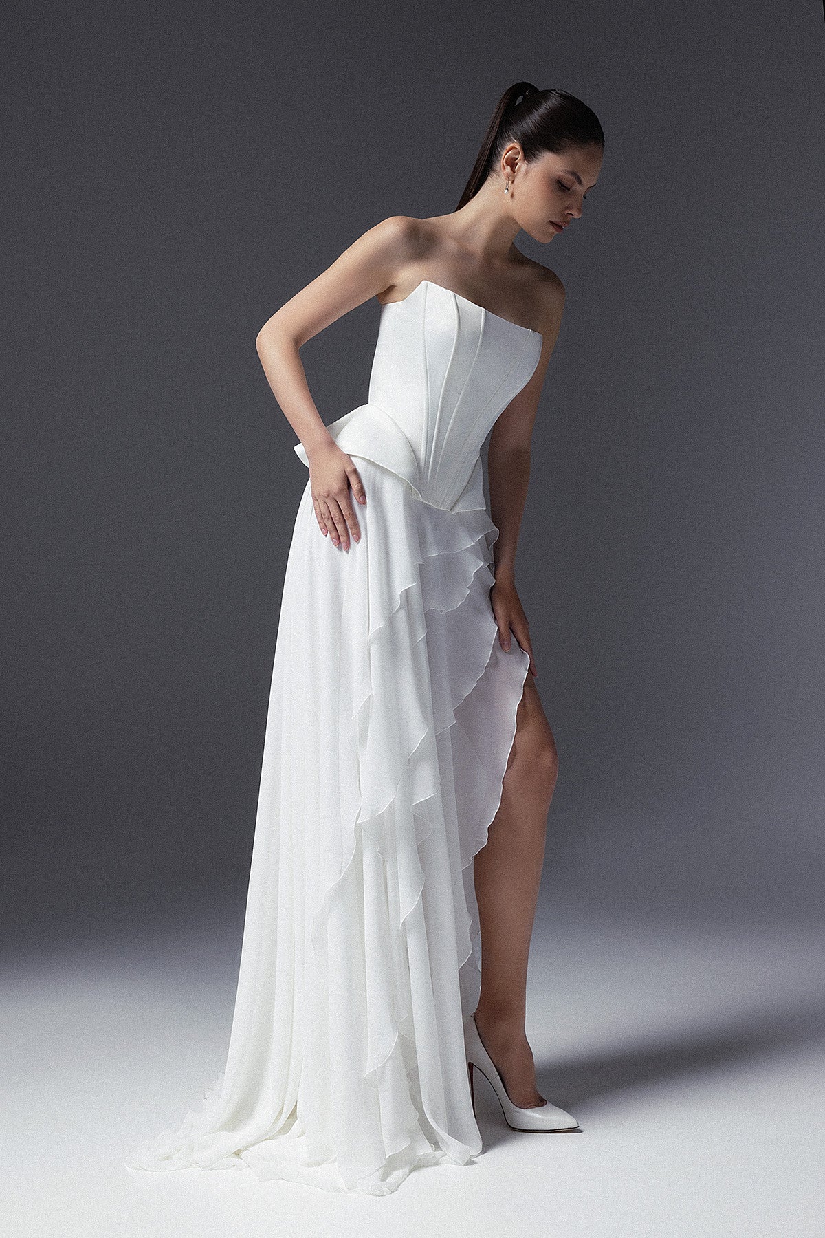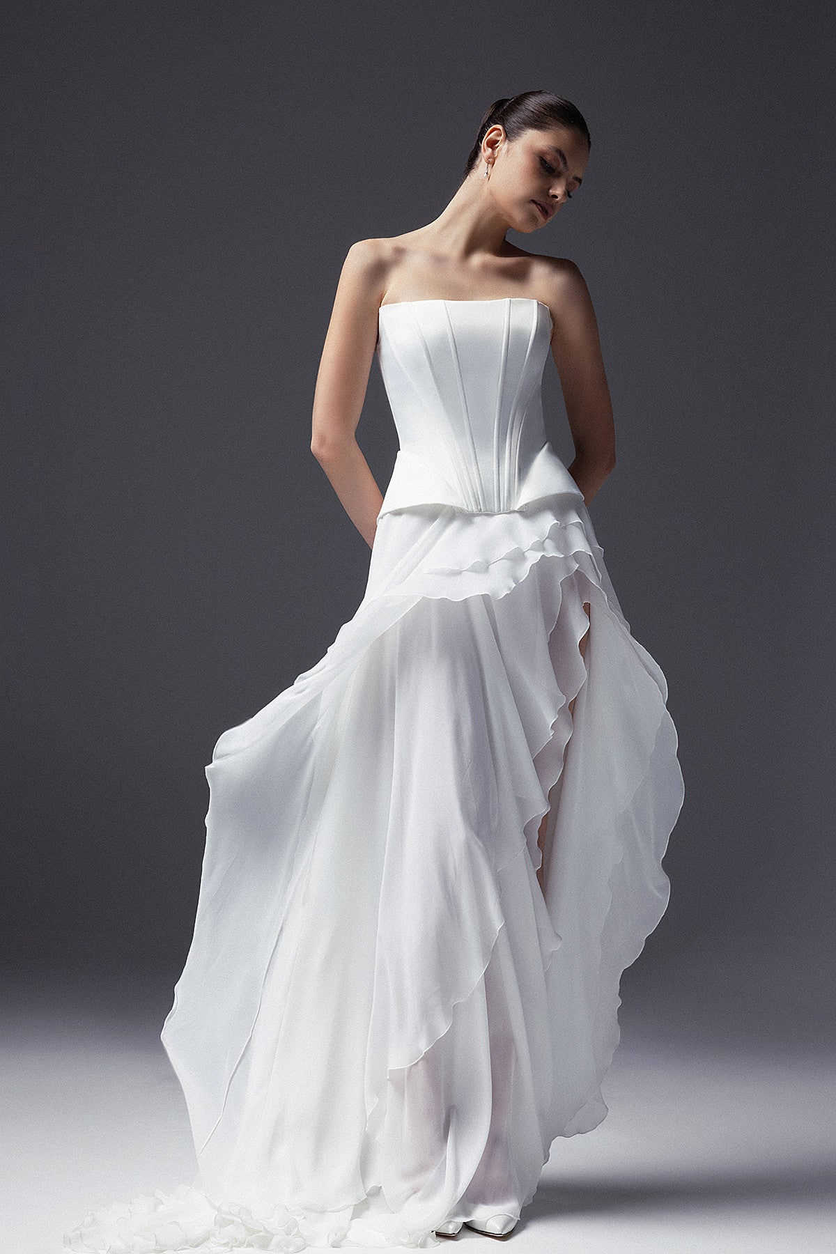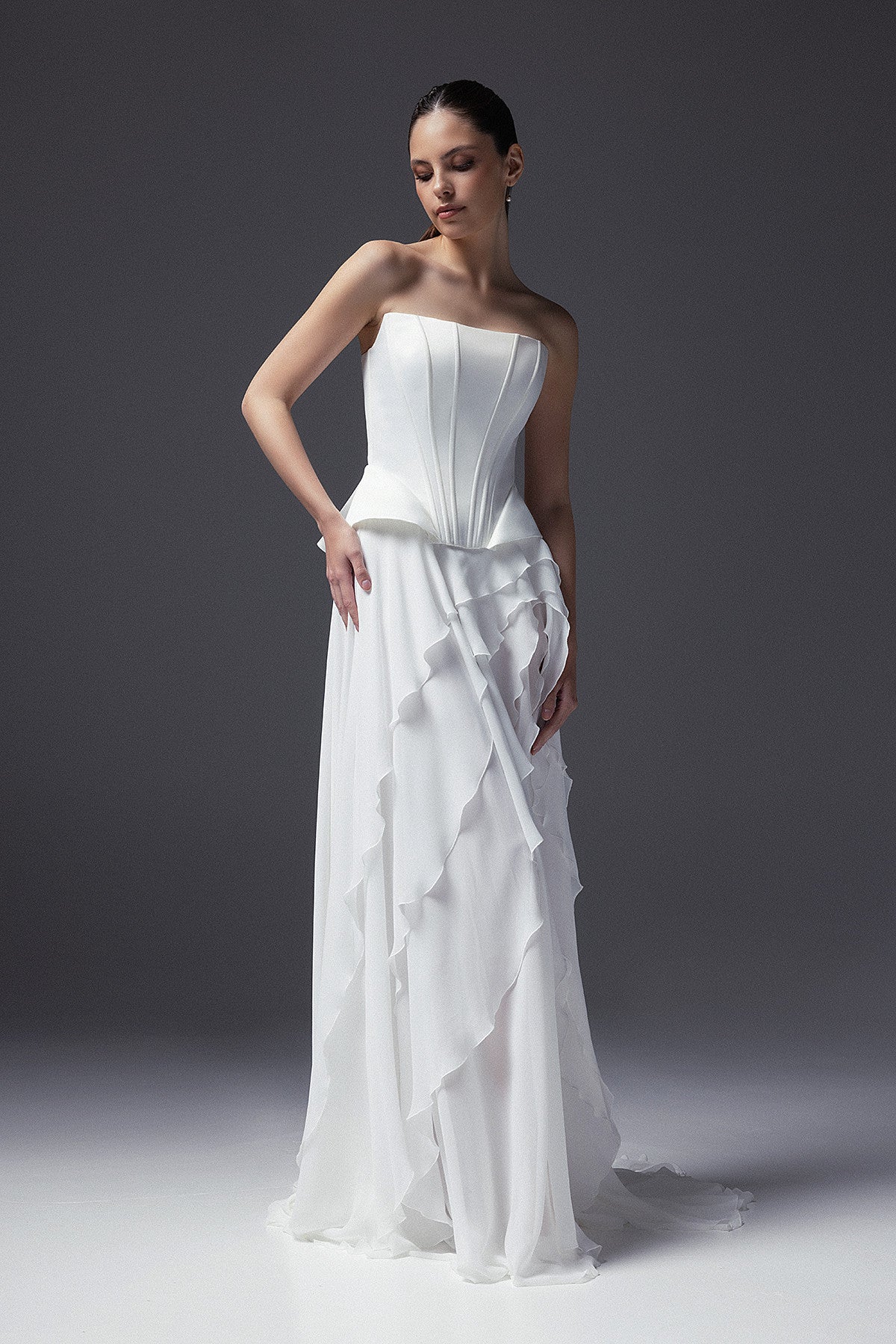 Two Piece Wedding Dress Greta with Chiffon Asymmetric Maxi Skirt and Strapless Peplum Corset